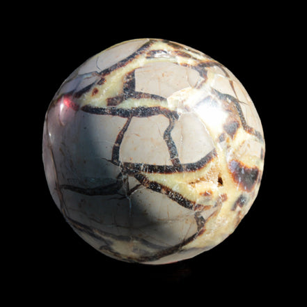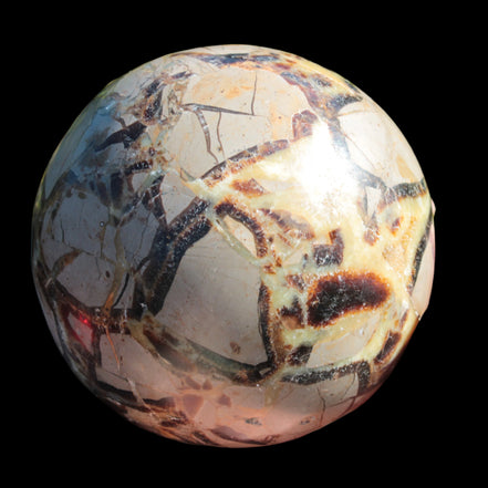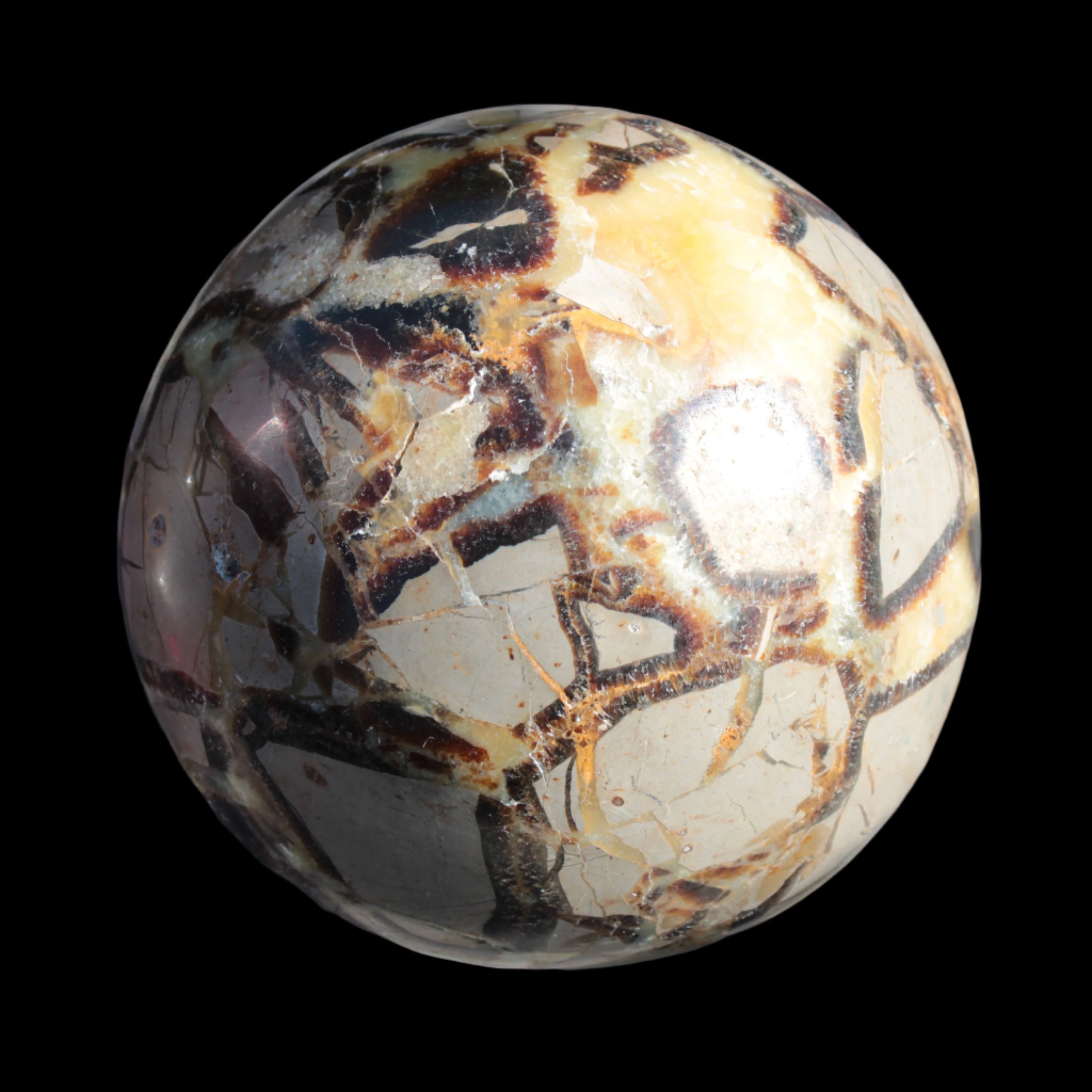 This Septarian Dragon Stone sphere weighs 1890g. Septarian Dragon Stone is unique in that it resulted from volcanic eruptions on the sea floor and reactions with the shells of dead sea life. The altered sediment then formed mud balls which dried out into complex concretions. The geodes are composed of Calcite, which makes up the yellow centres and Aragonite which are the brown lines. The outer grey rock is Limestone.