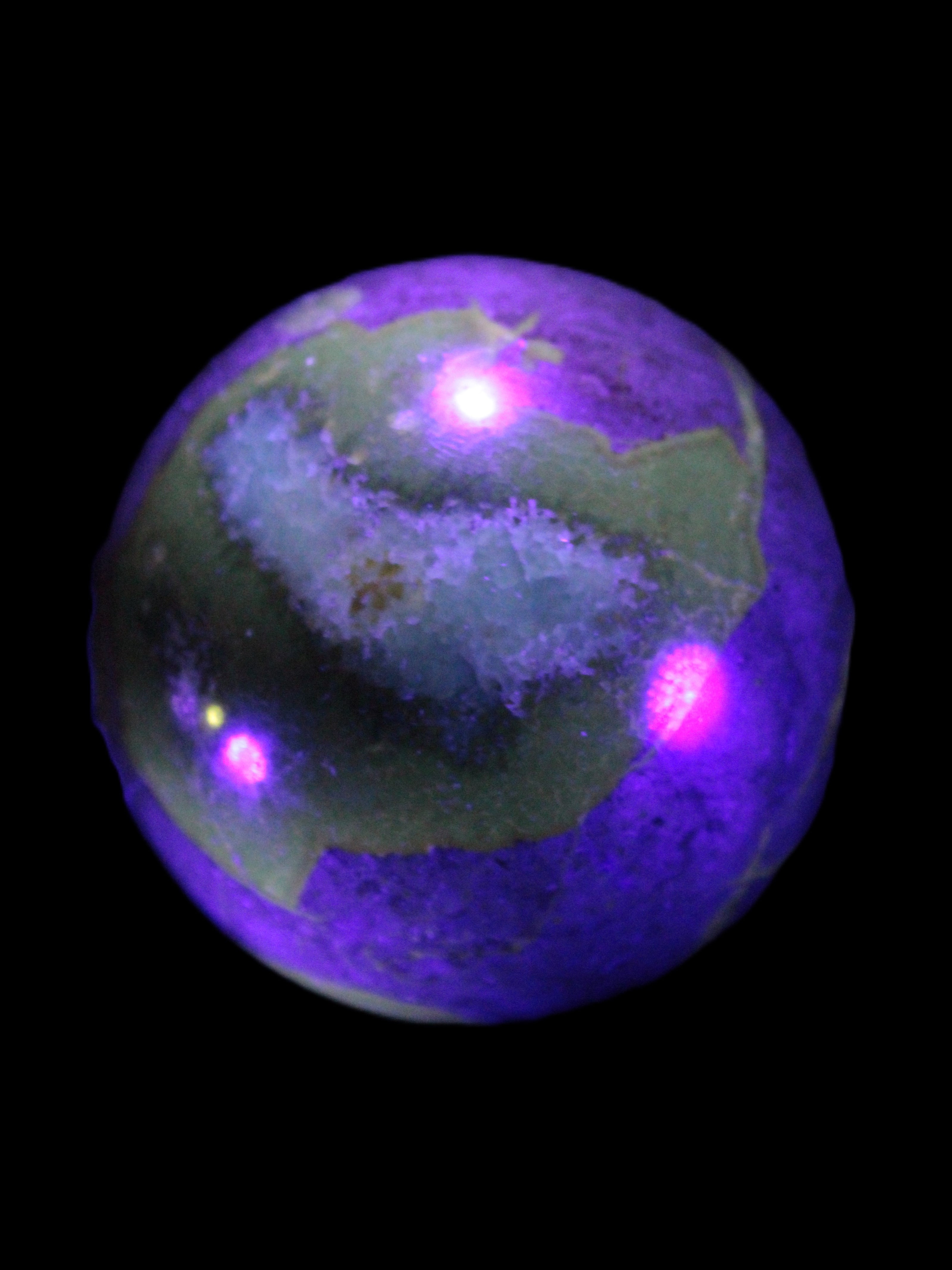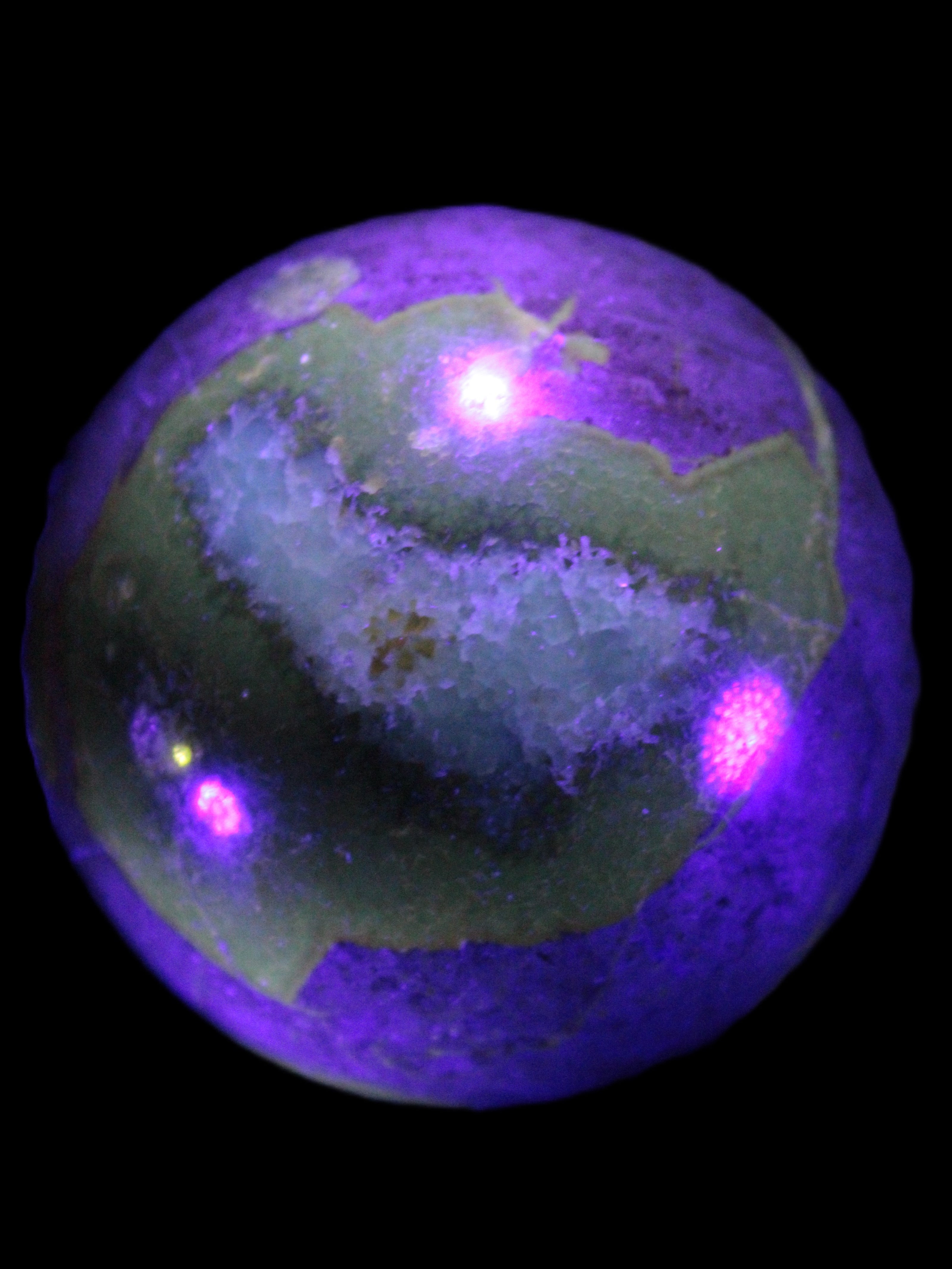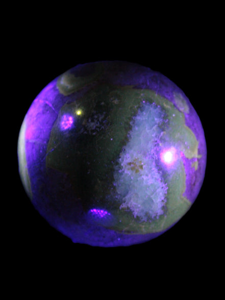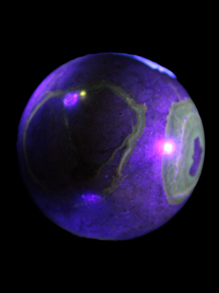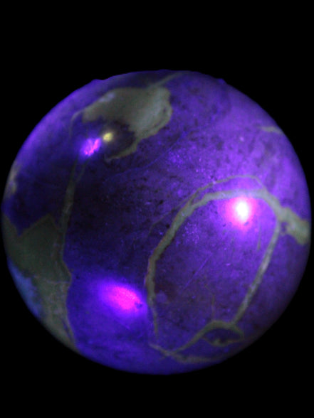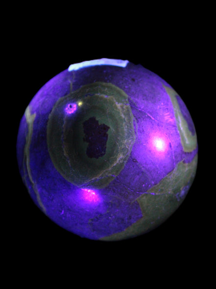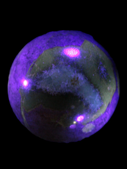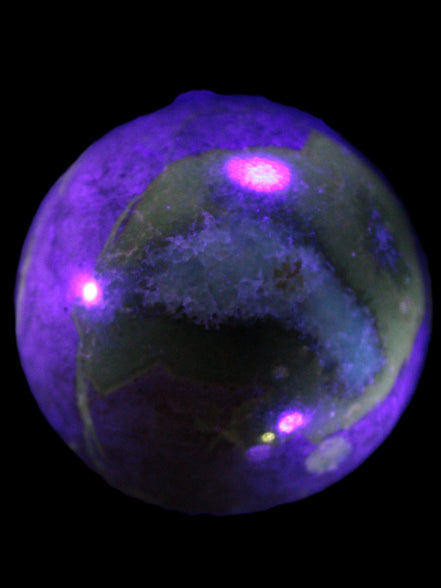 This Septarian Dragon stone sphere 57mm 248g is a good example of this amazing stone. What makes Septarian Dragon Stone unique is its formation. It resulted from volcanic eruptions on the sea floor and reactions with the shells of dead sea life. The altered sediment then formed mud balls which dried out into complex concretions. The geodes are composed of Calcite, which makes up the yellow centres and Aragonite which are the brown lines. The outer grey rock is Limestone.