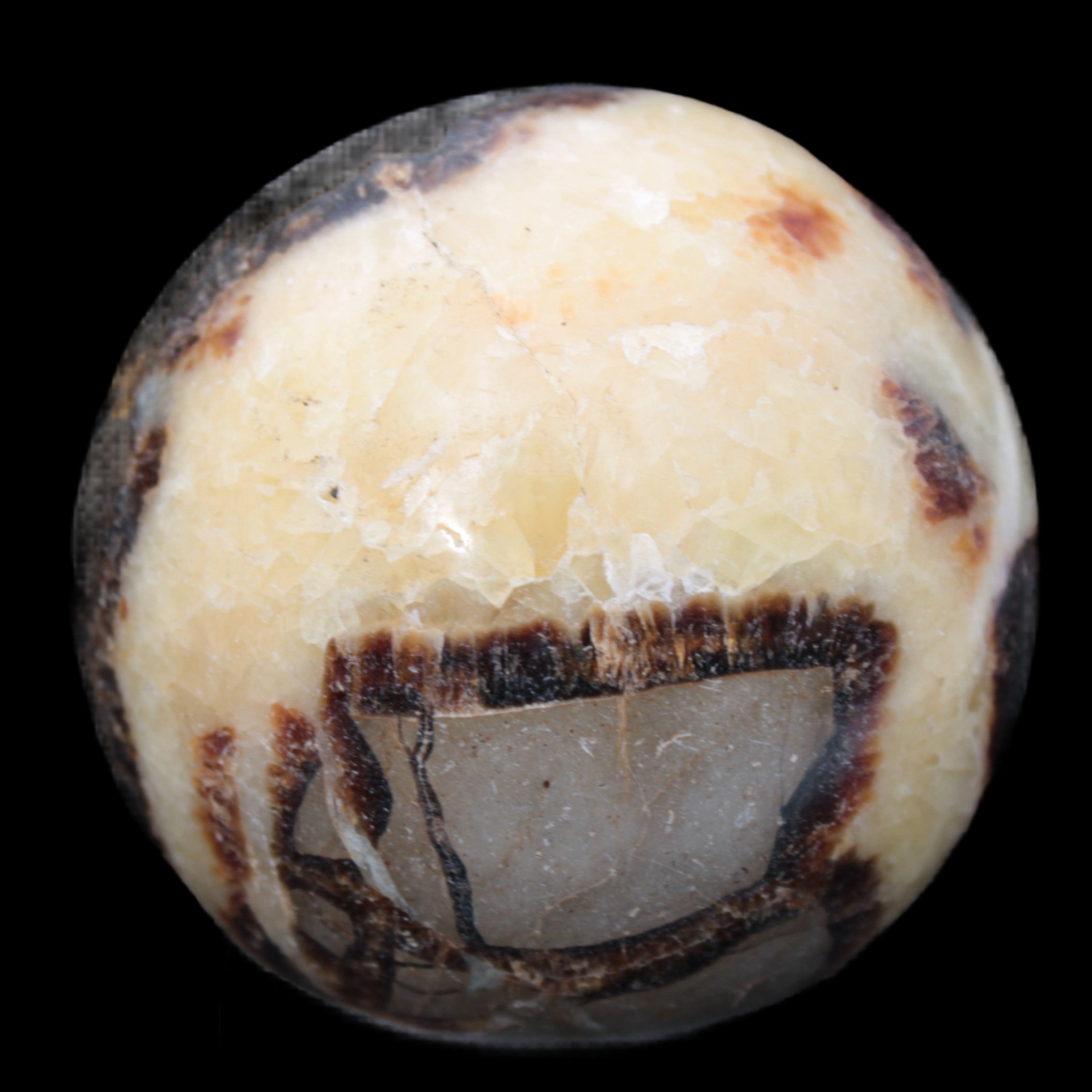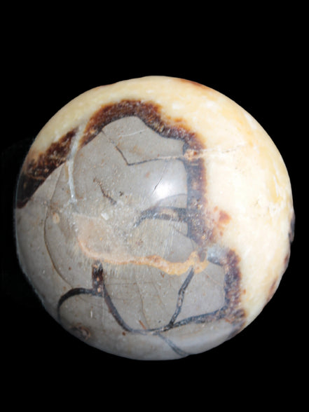 This Septarian Dragon stone sphere 59mm 274g is a great pathway to this amazing stone. Meaning: What makes Septarian Dragon Stone unique is its formation. It resulted from volcanic eruptions on the sea floor and reactions with the shells of dead sea life. The altered sediment then formed mud balls which dried out into complex concretions. The geodes are composed of Calcite, which makes up the yellow centres and Aragonite which are the brown lines. The outer grey rock is Limestone.