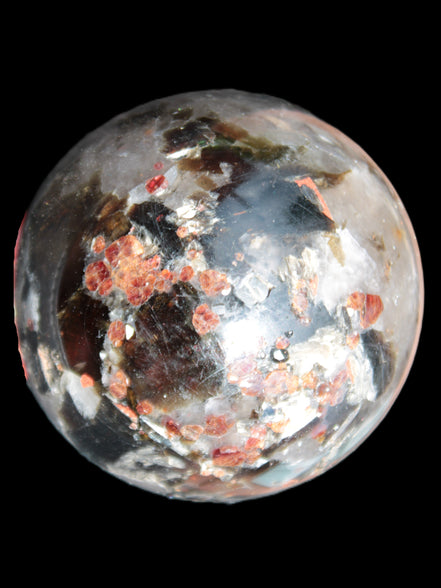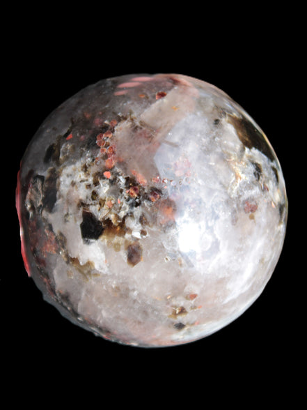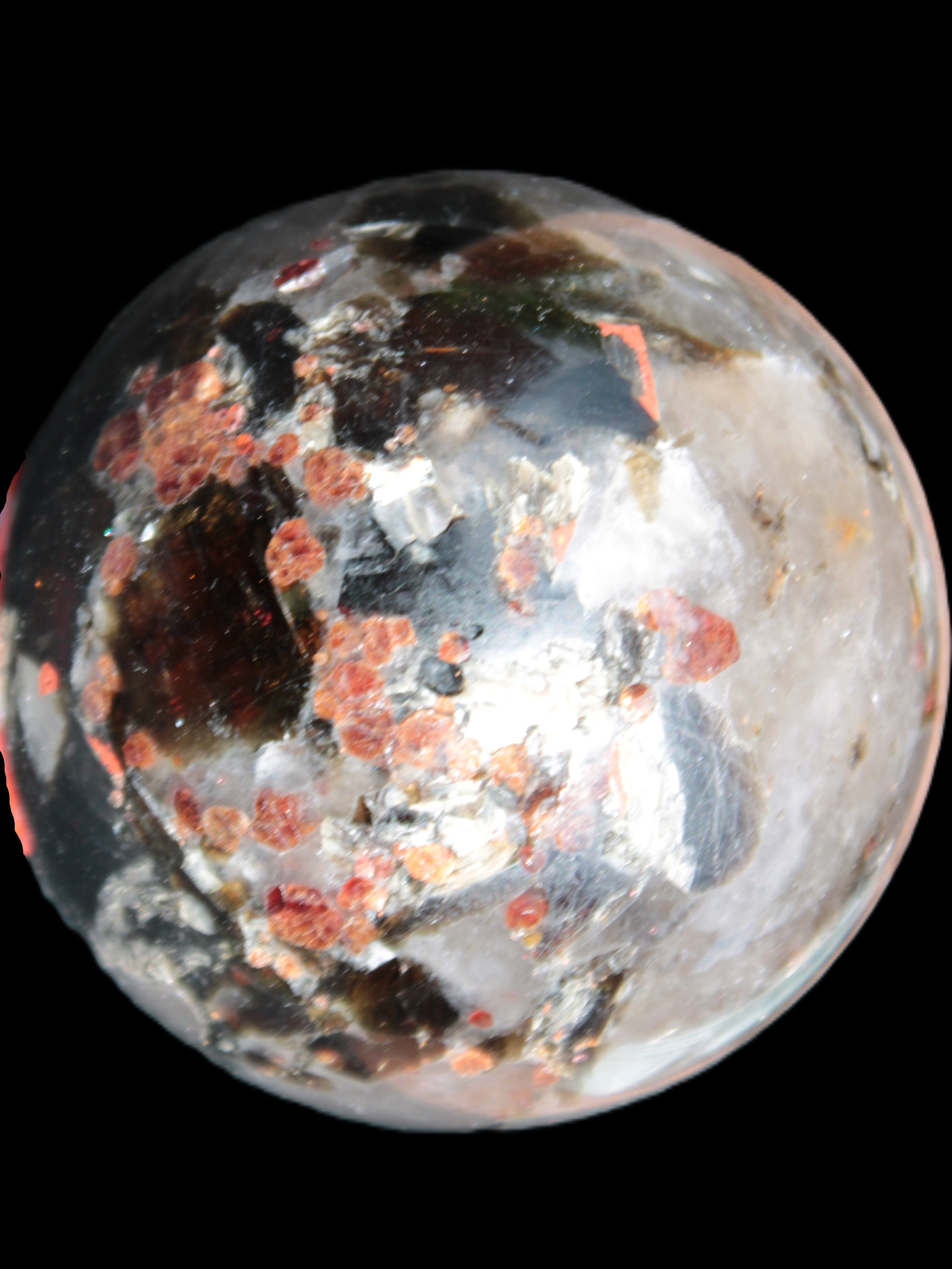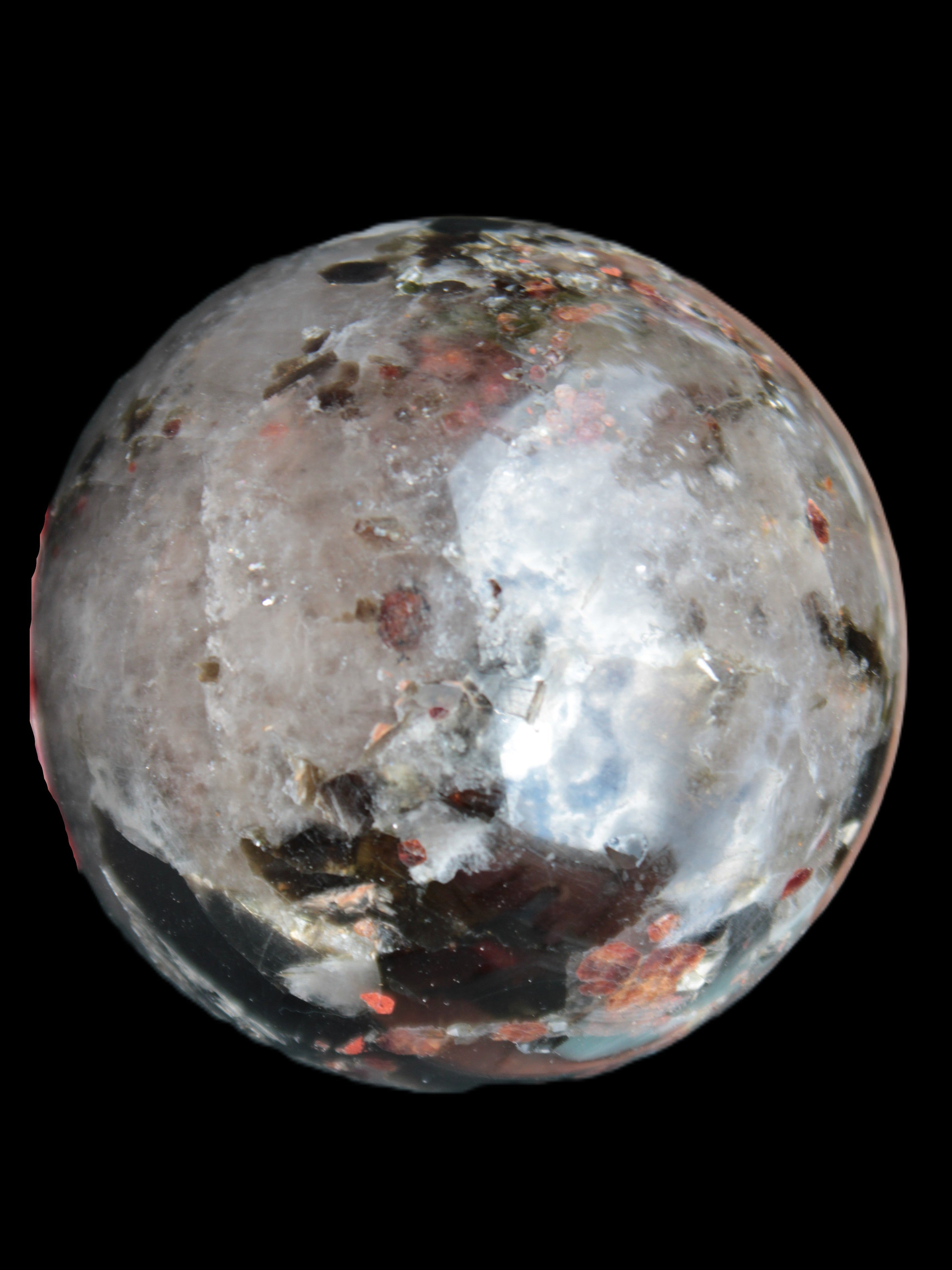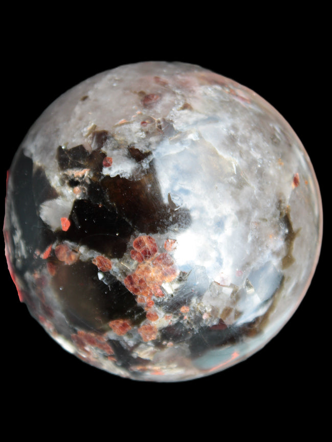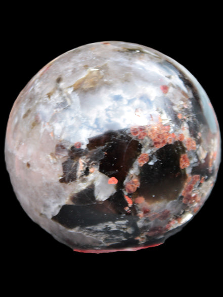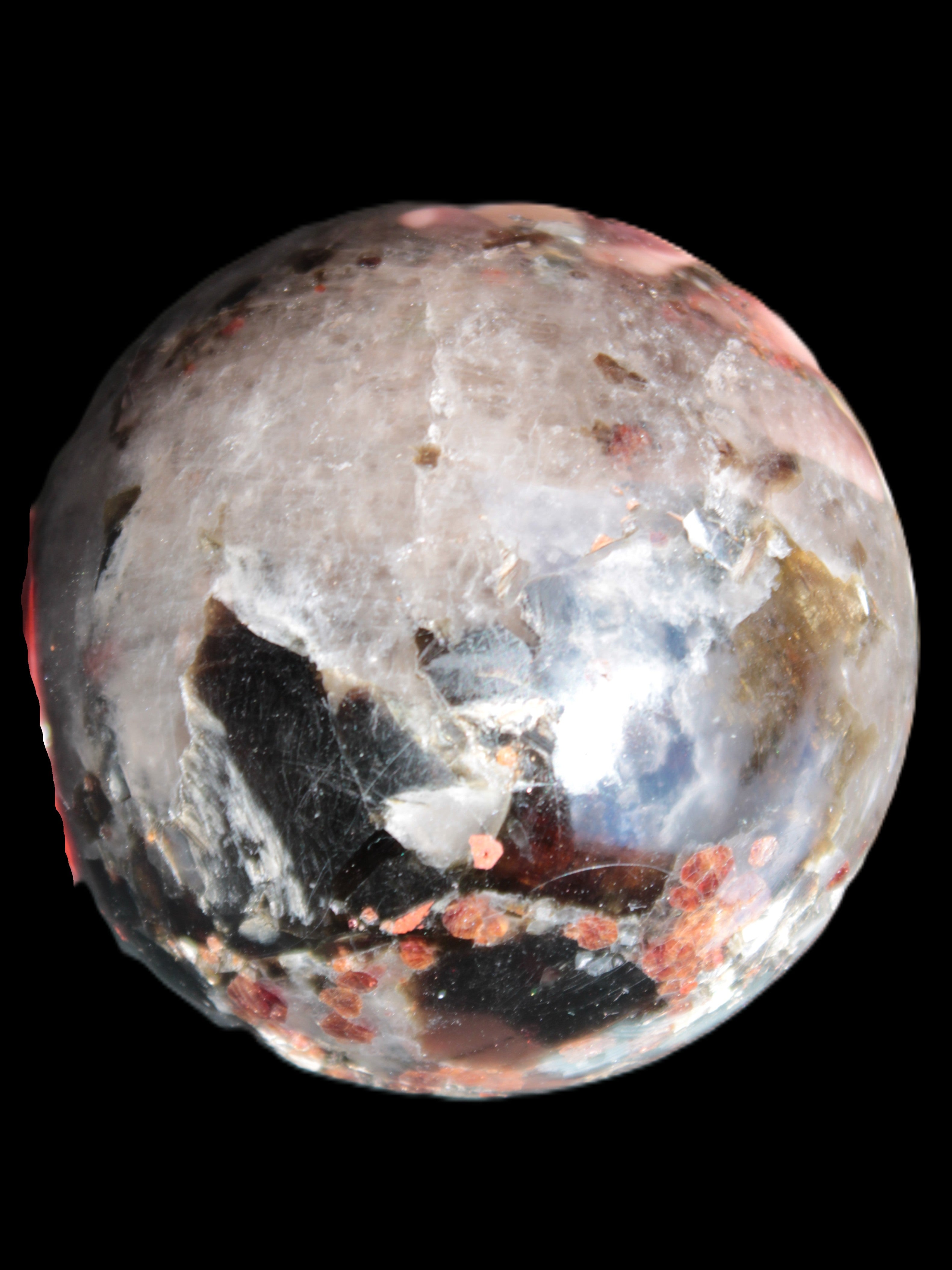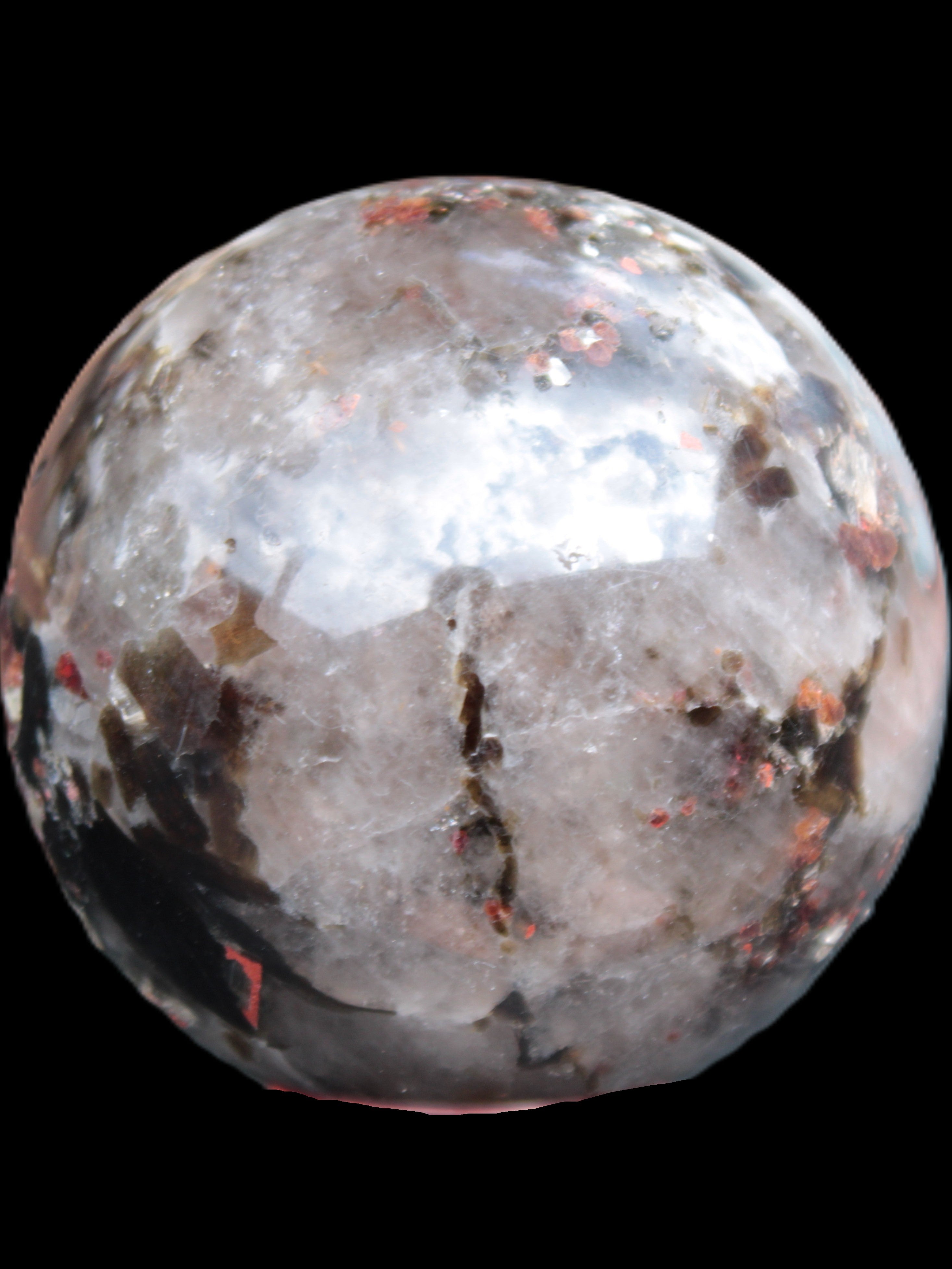 This Smoky Quartz with Garnet sphere 78mm weighs 681g. Smoky Quartz is a centering, grounding and protective crystal. It is an immensely powerful metaphysical stone. Smoky Quartz emits an elevated level of energy. This makes it an excellent crystal for protection from negative energy. Smoky Quartz enhances survival instincts. It assists with prioritising needs and wants.
