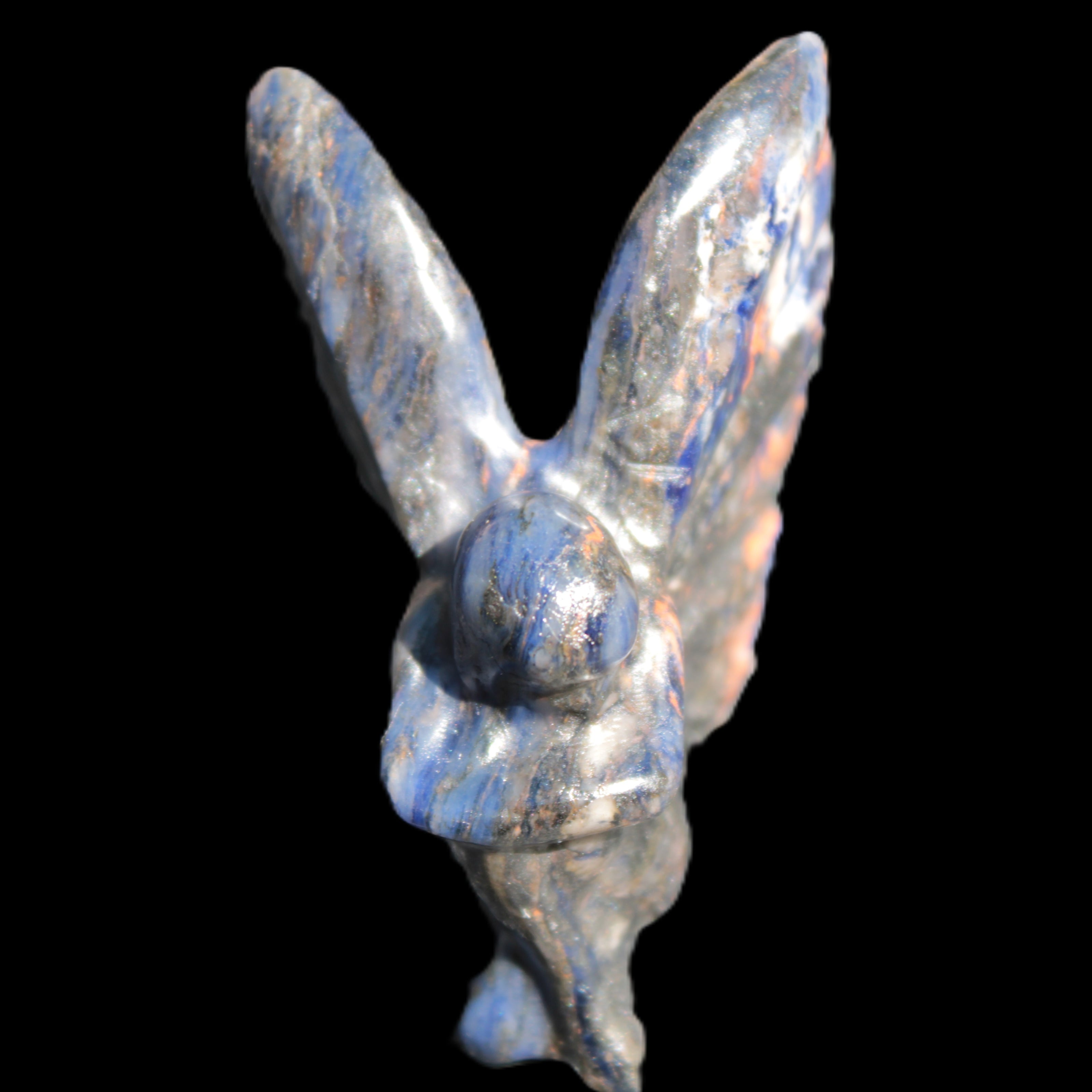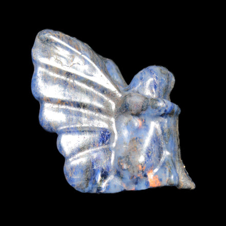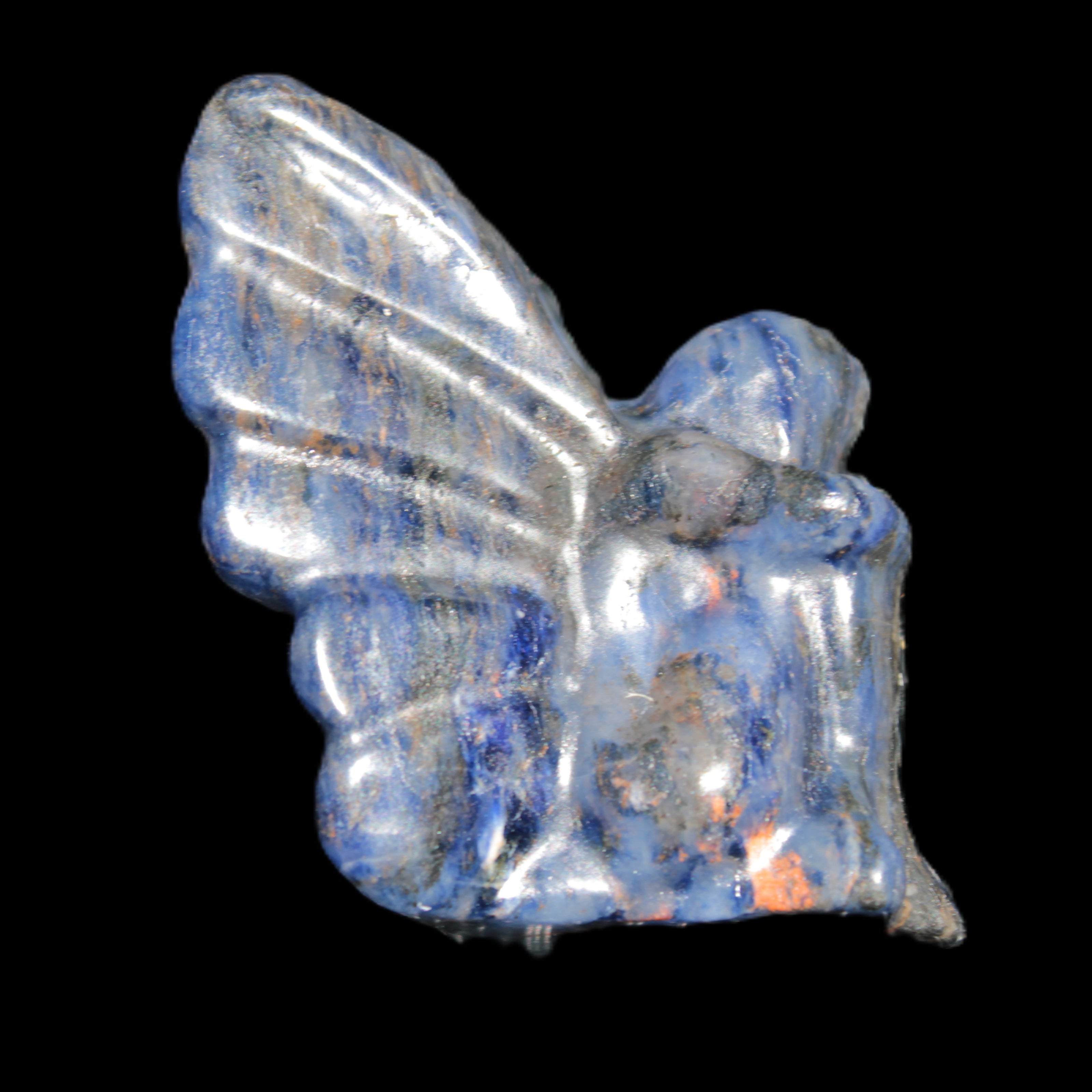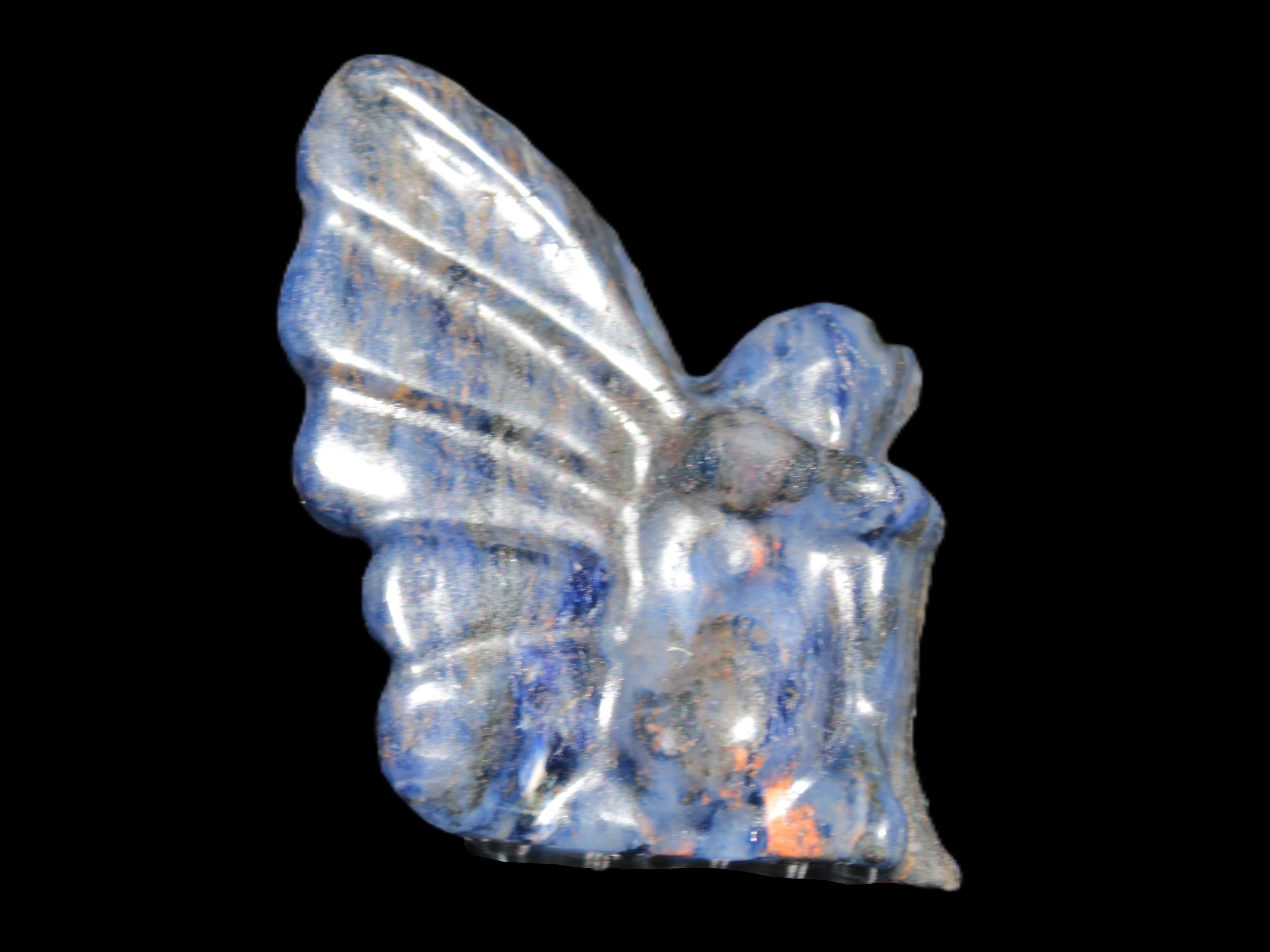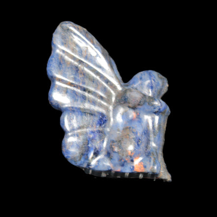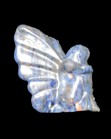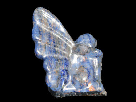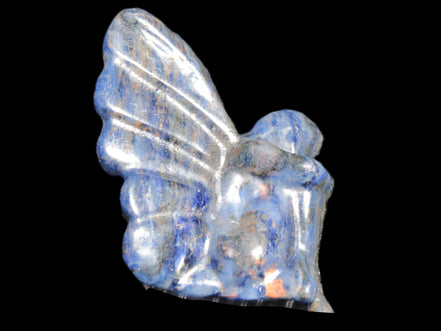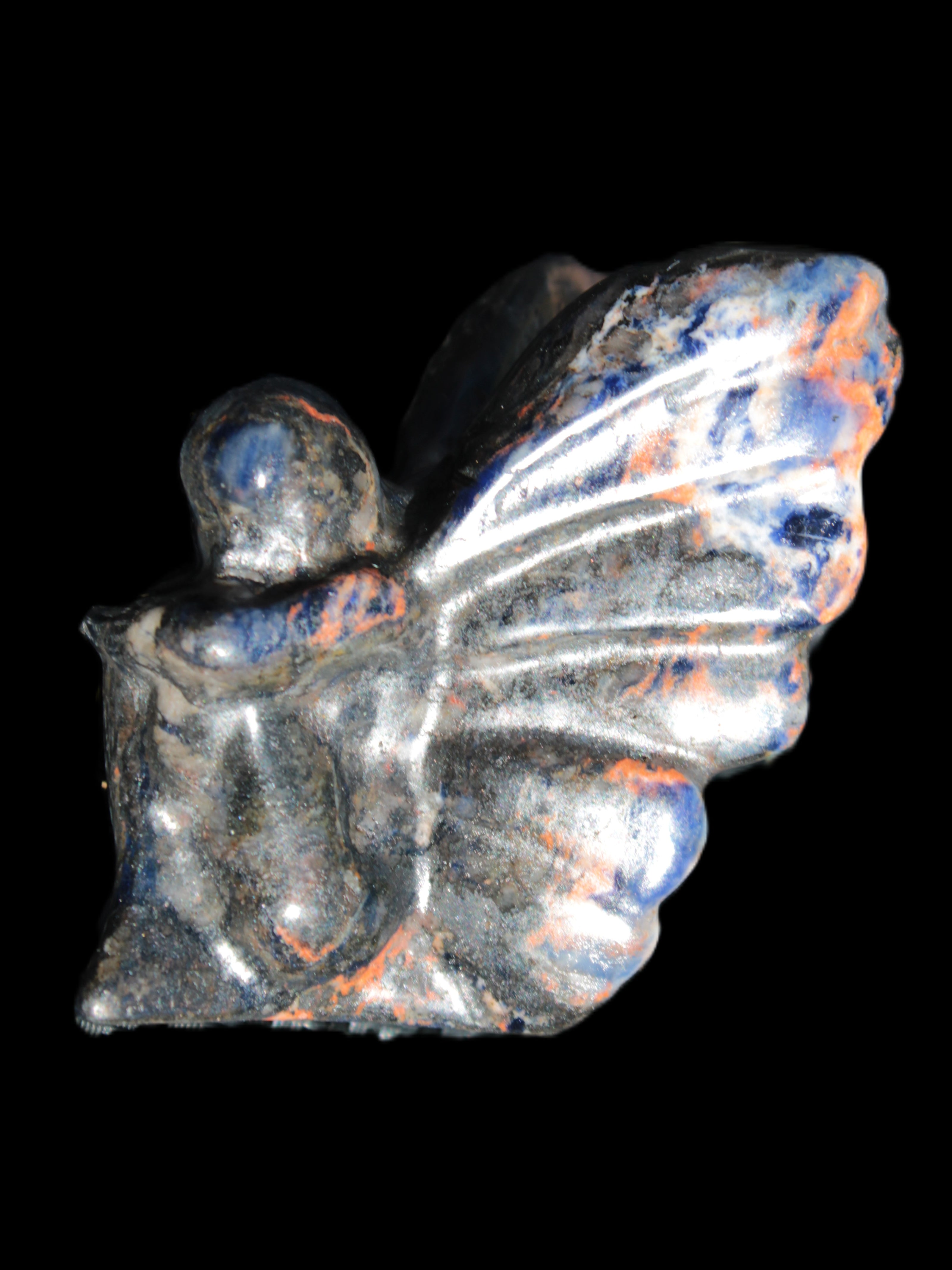 This Sodalite hand-carved faerie weighs 99g. Sodalite has a calming energy. Its name refers to the sodium content in the mineral. Sodalite is found as vein fillings in igneous rocks that formed deep in the Earth’s crust. Sodalite is opaque with a vitreous or greasy lustre. Sodalite is a stone of insight and mental enhancement, stimulating thought and communication. It is a stone of truth, bringing this to all communications. Sodalite is UV reactive