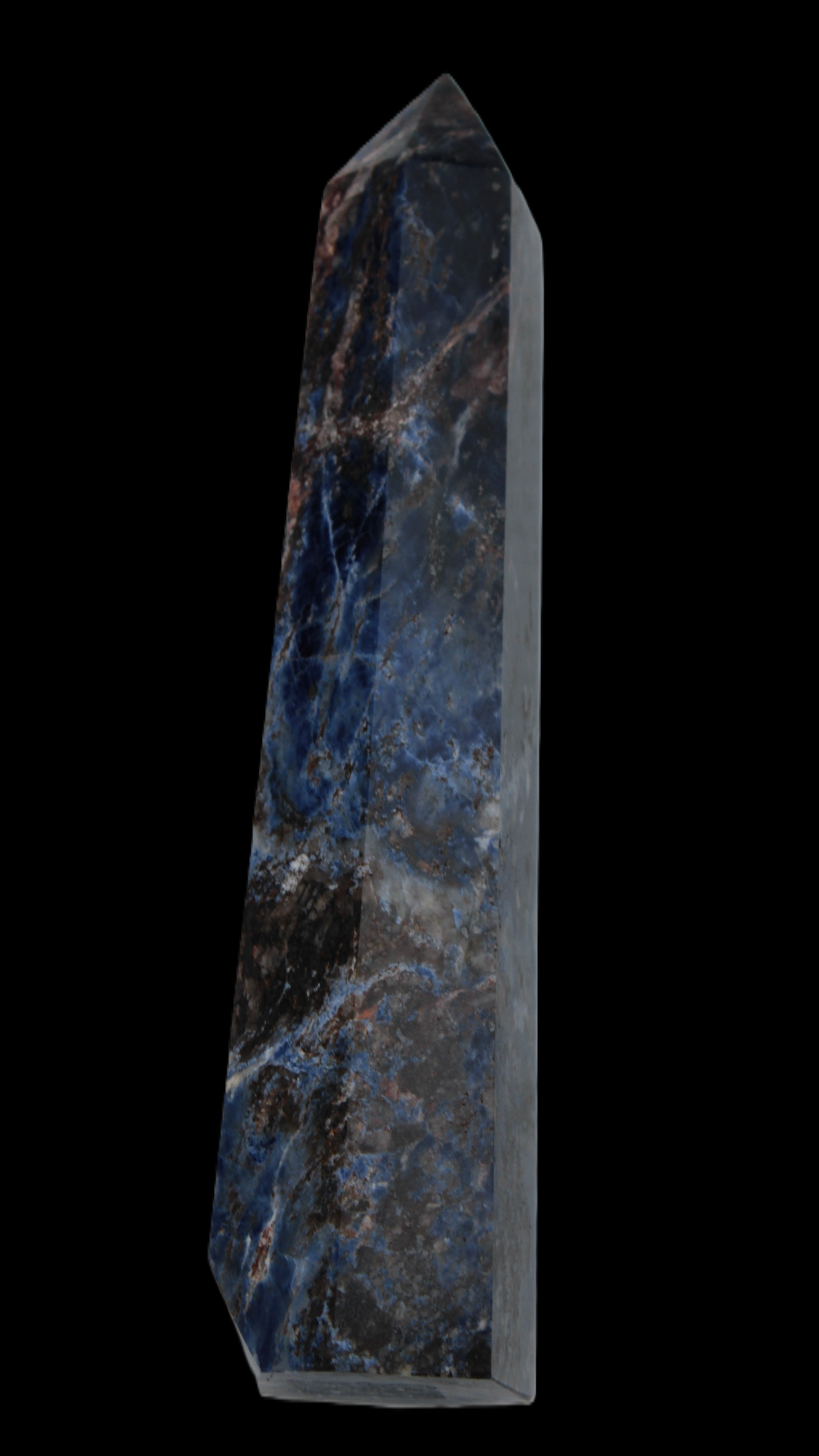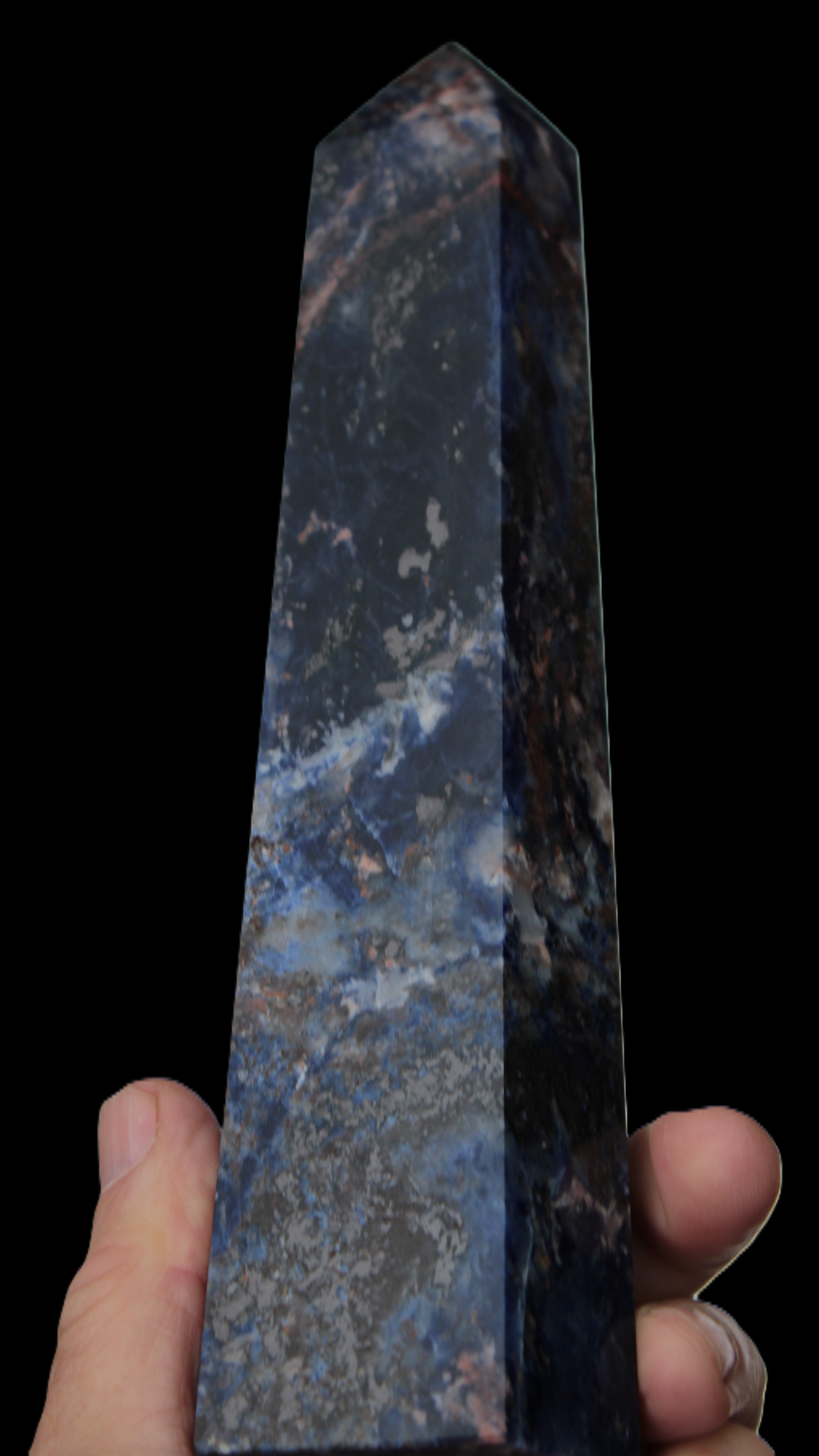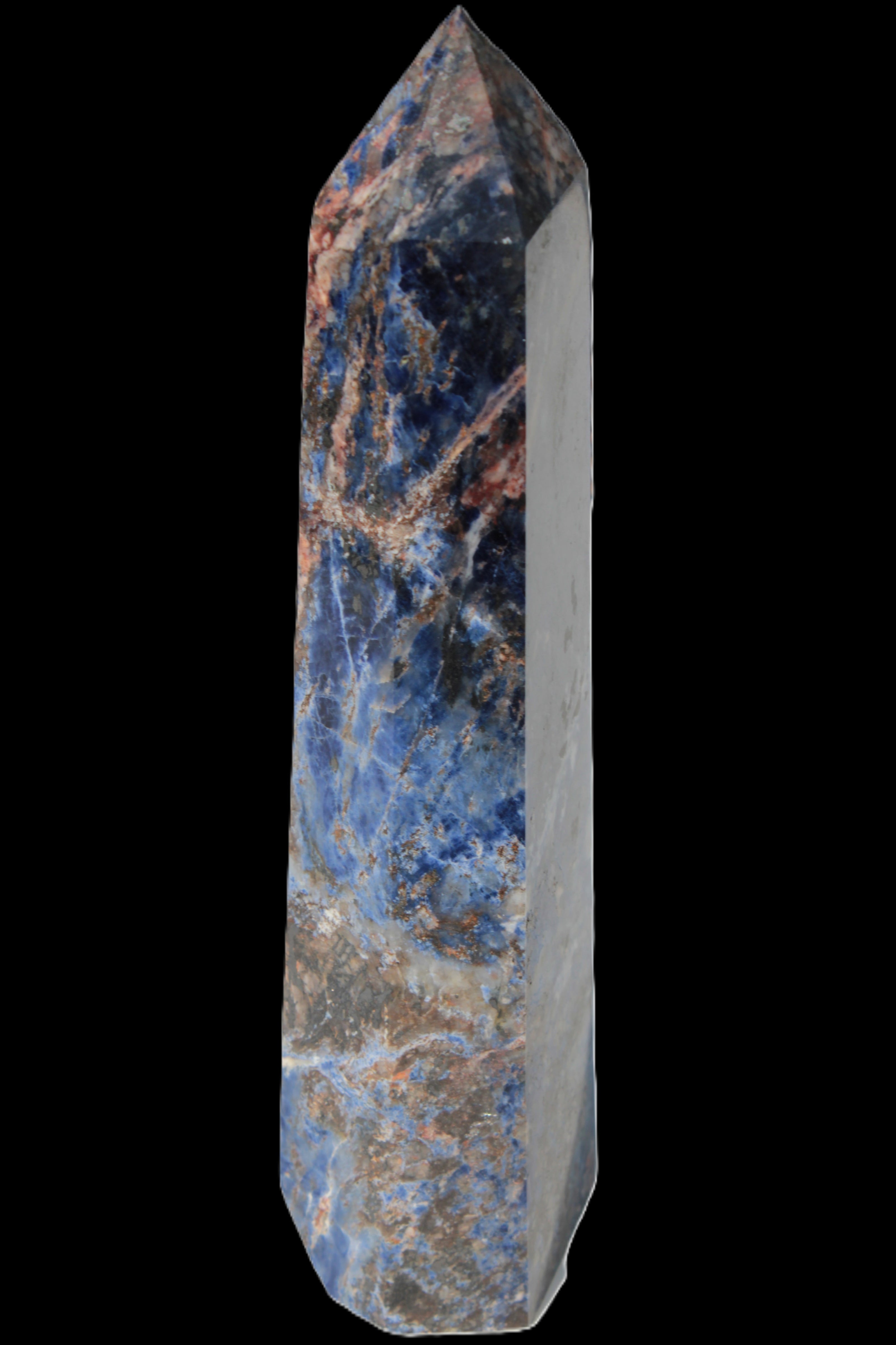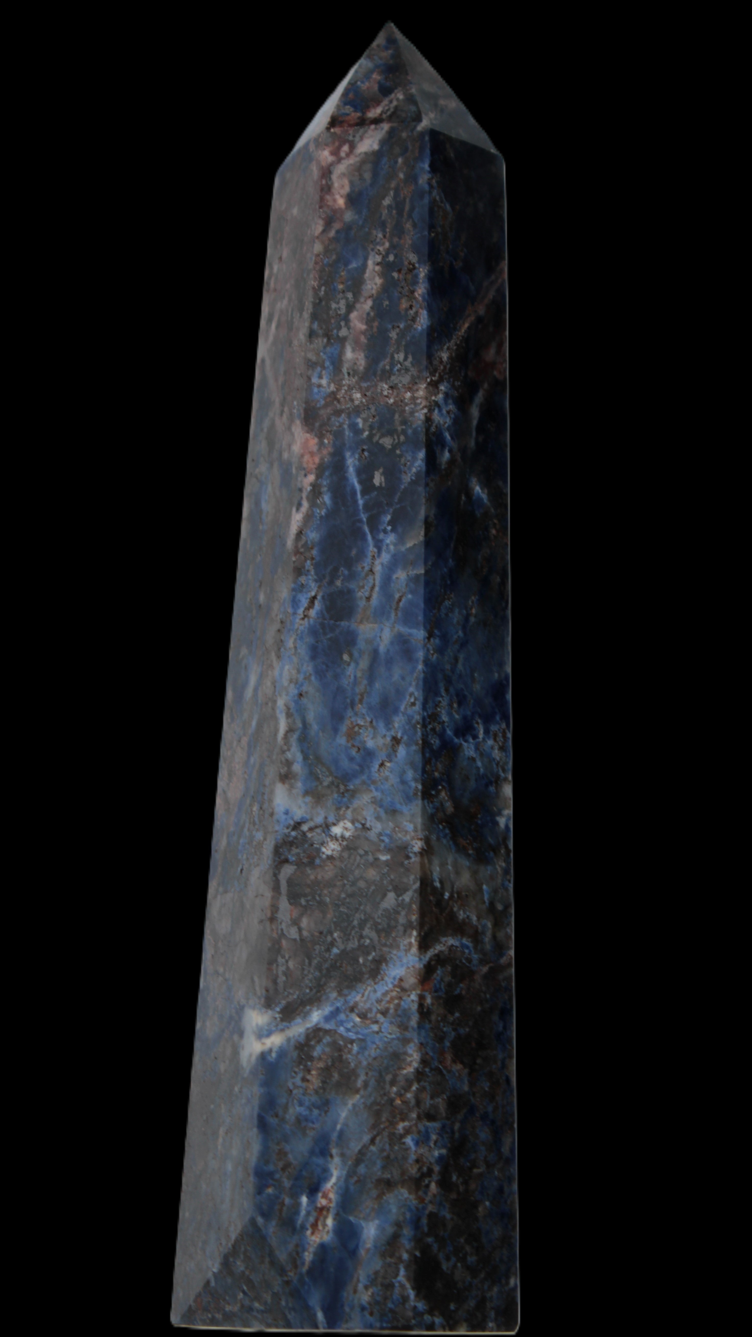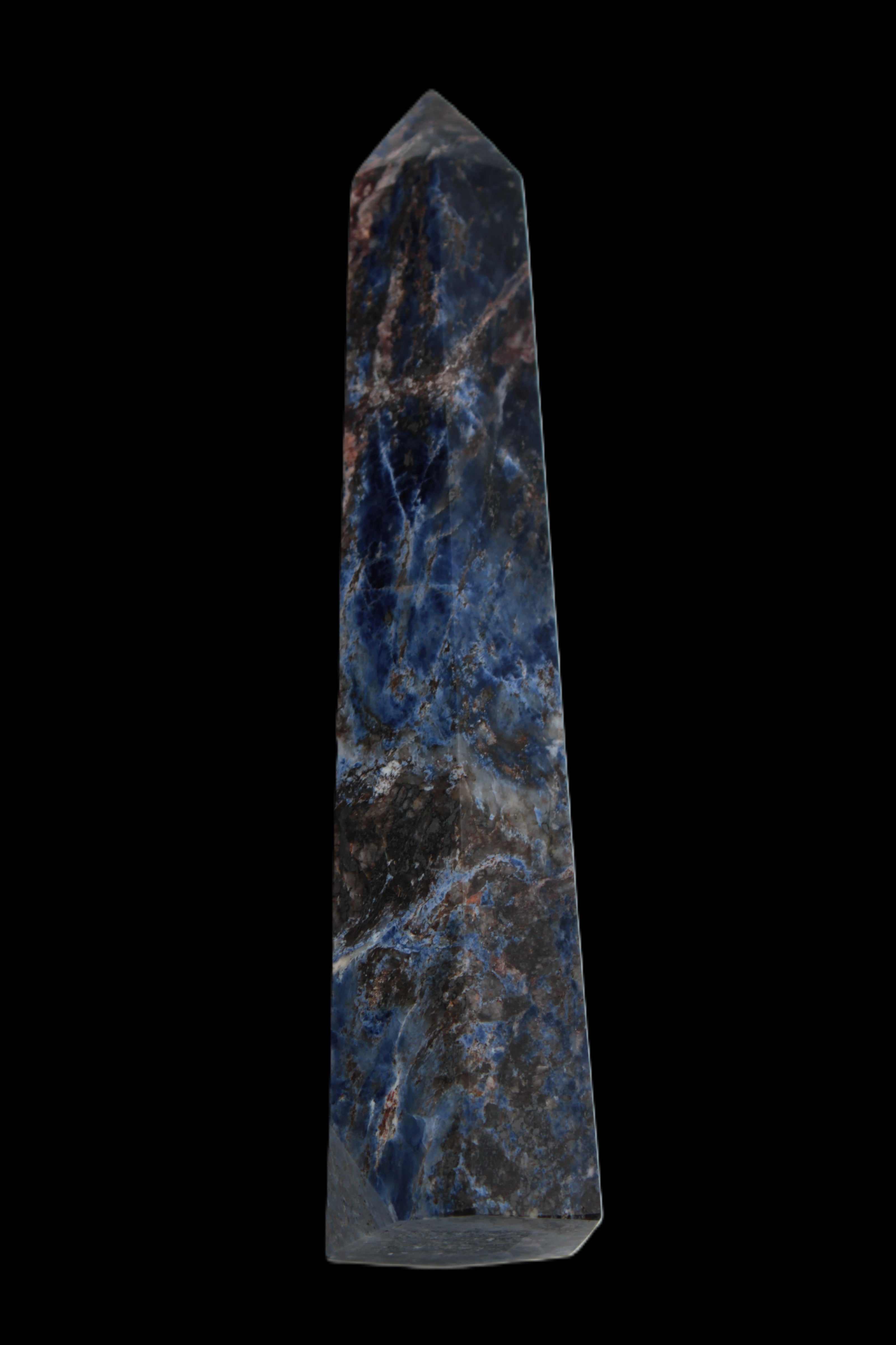 This item is a Sodalite obelisk that weighs 723g. Sodalite has a calming energy. Its name refers to the sodium content in the mineral. Sodalite is found as vein fillings in igneous rocks that formed deep in the Earth’s crust. Sodalite is opaque with a vitreous or greasy lustre. It is UV reactive. The best blue shades of Sodalite are found in deposits alongside white Calcite. Sodalite is a stone of insight and mental enhancement, stimulating thought and communication. It is a stone of truth, bringing this to all communications.