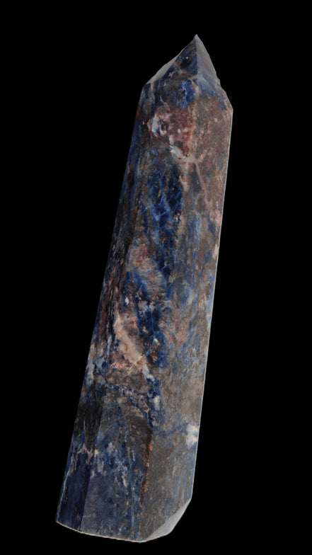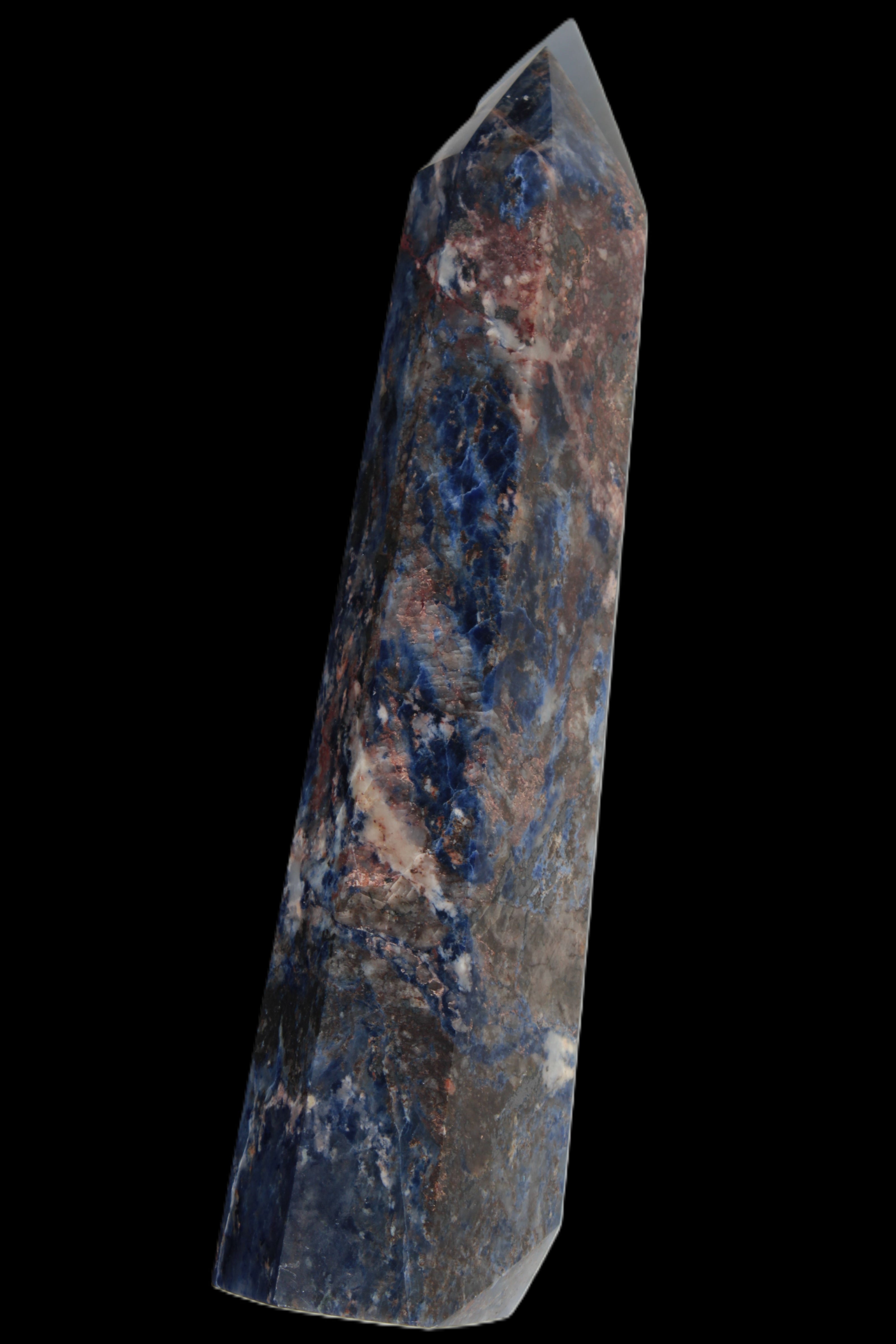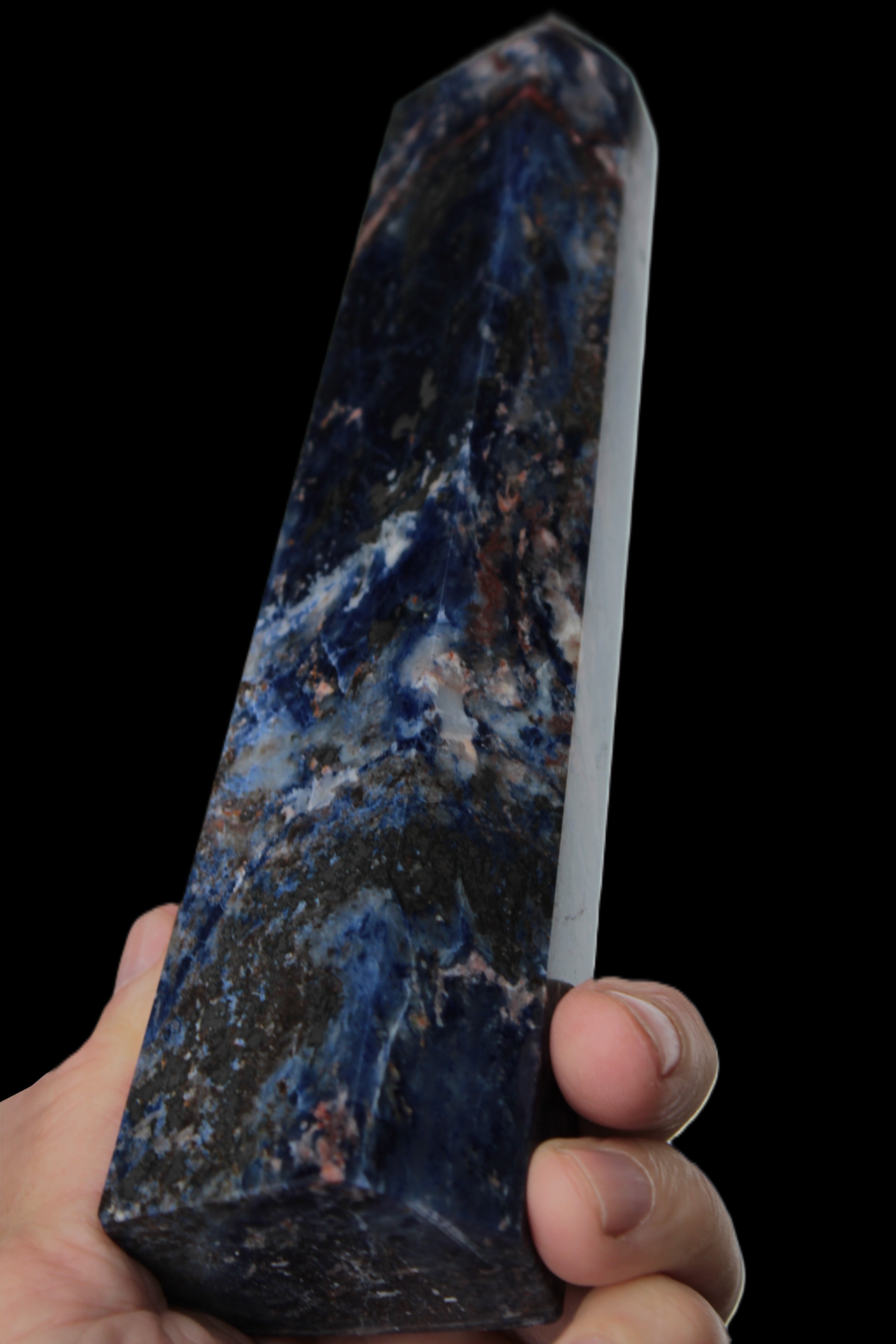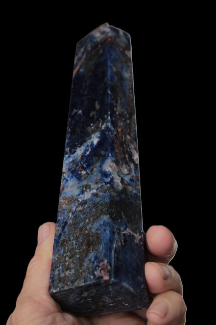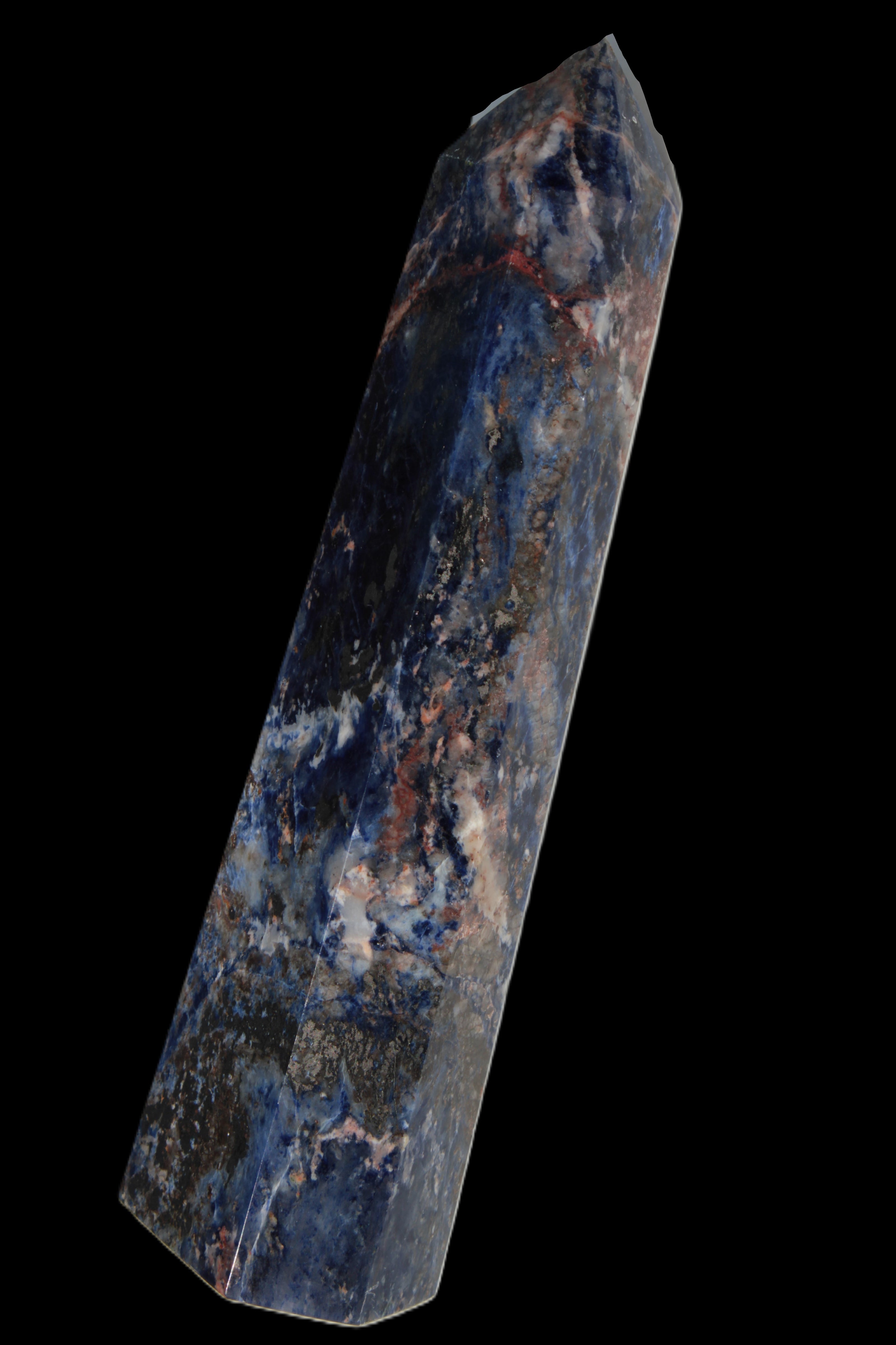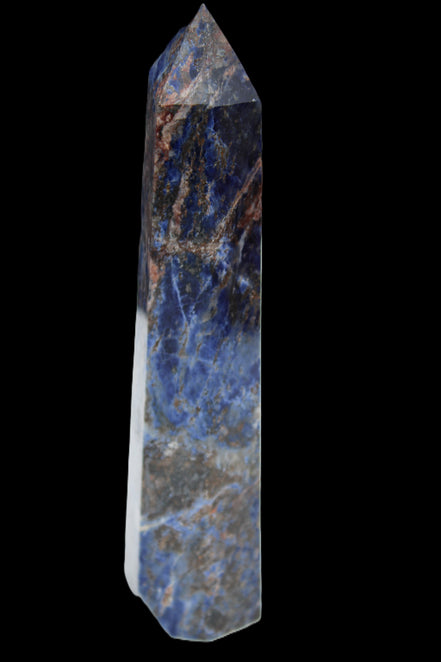 This item is a Sodalite obelisk that weighs 723g. Sodalite has a calming energy. Its name refers to the sodium content in the mineral. Sodalite is found as vein fillings in igneous rocks that formed deep in the Earth’s crust. Sodalite is opaque with a vitreous or greasy lustre. It is UV reactive. The best blue shades of Sodalite are found in deposits alongside white Calcite. Sodalite is a stone of insight and mental enhancement, stimulating thought and communication. It is a stone of truth, bringing this to all communications.