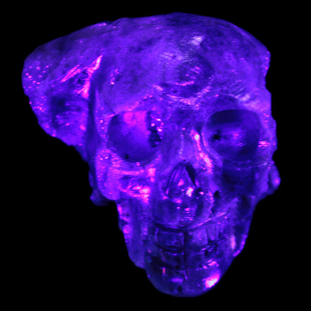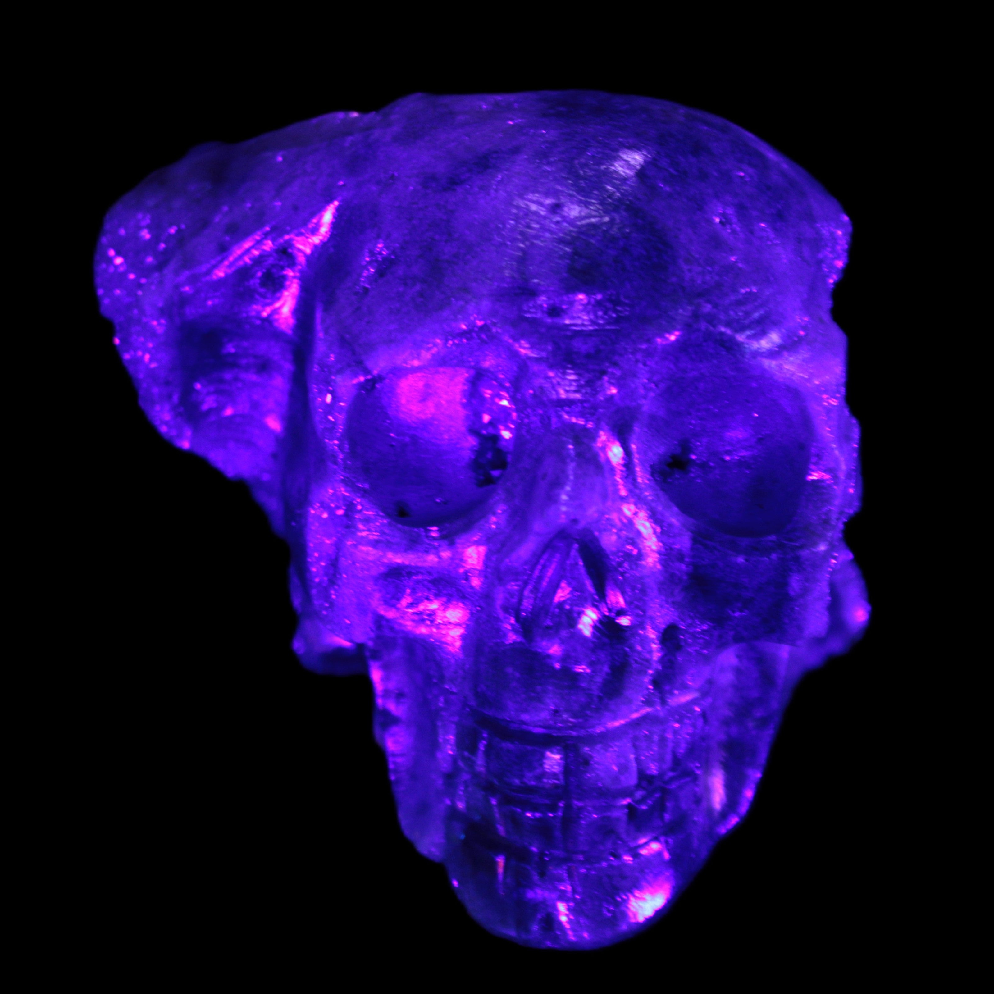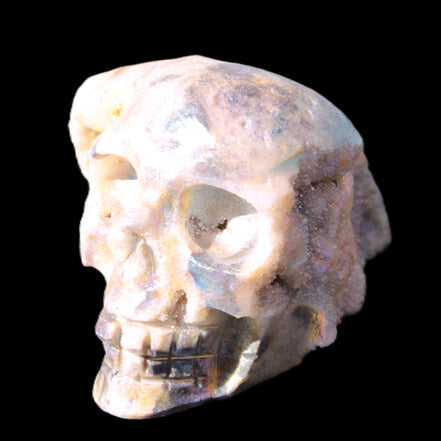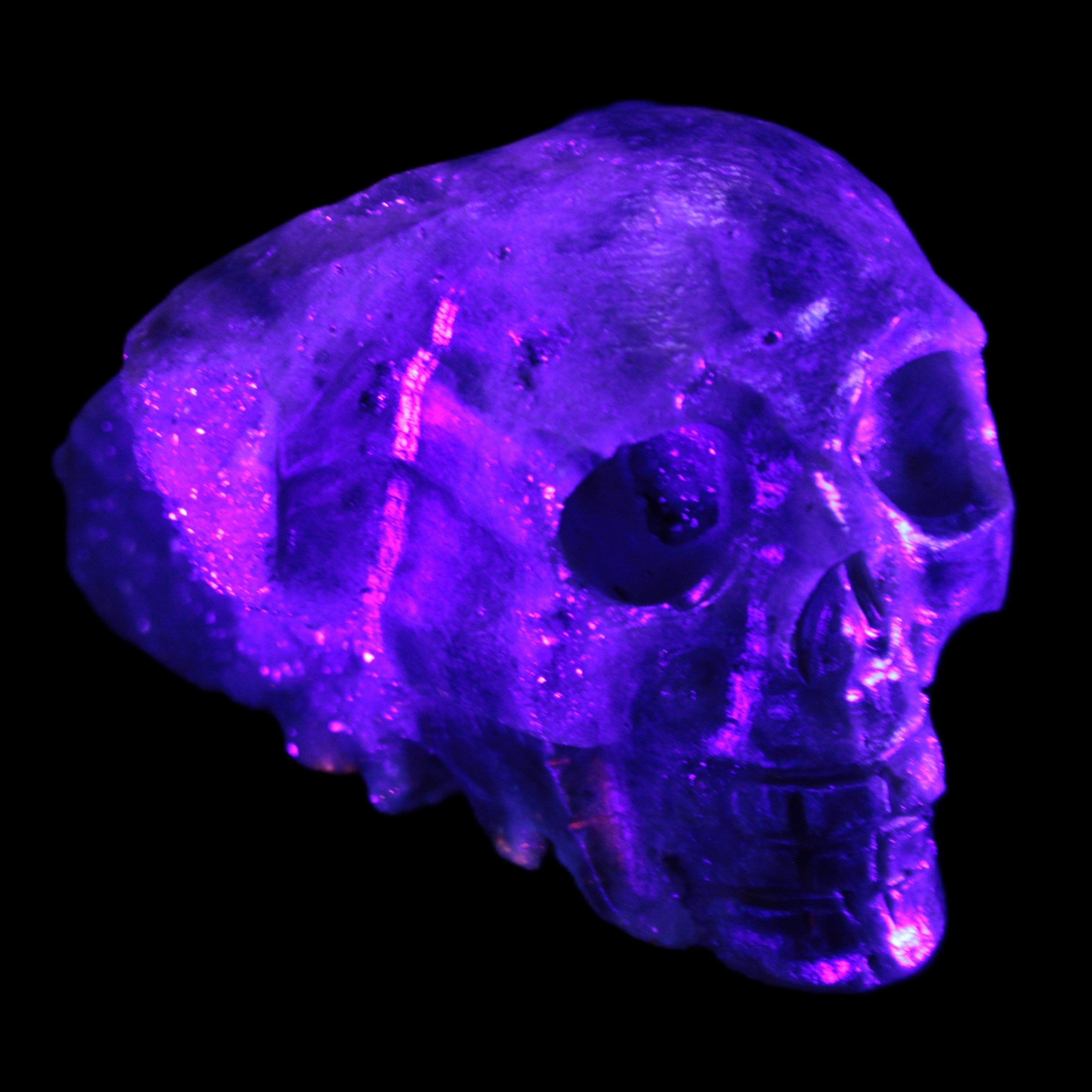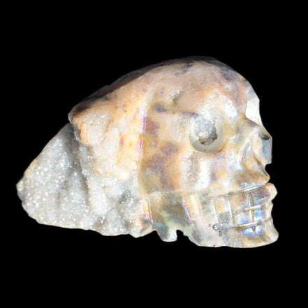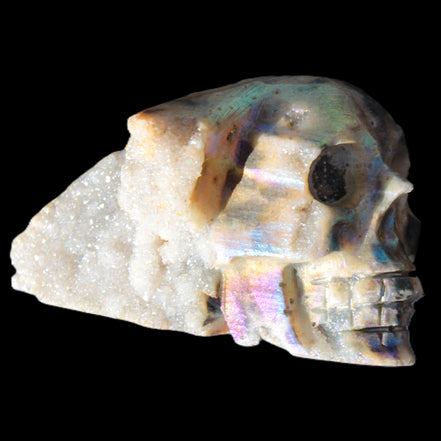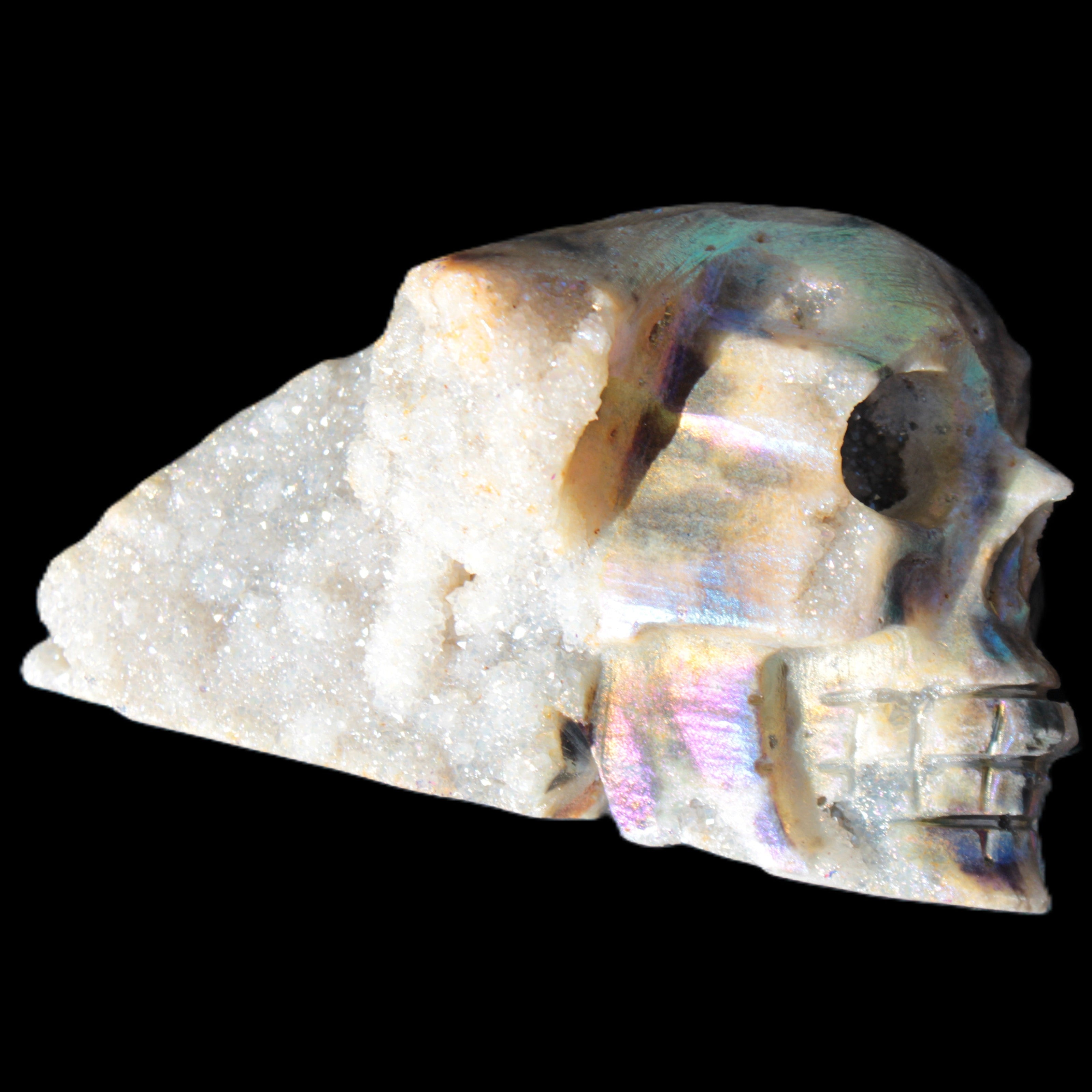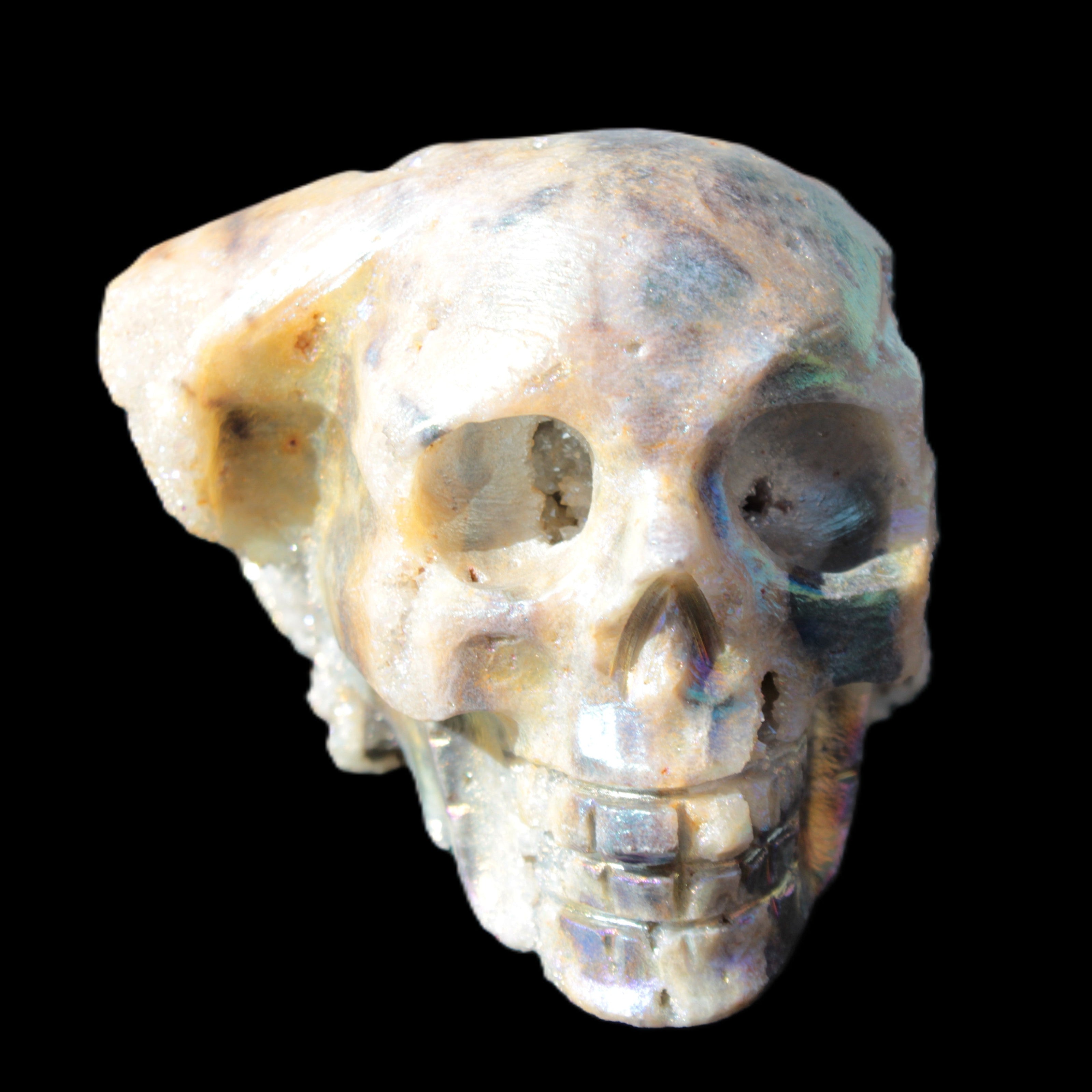 This Sphalerite hand-carved skull 69*106*64mm weighs 441g. It has been electroplated tro give it extra sparkle and rainbow effects. Sphalerite also reacts to UV light, so this is a stunning piece under any light.