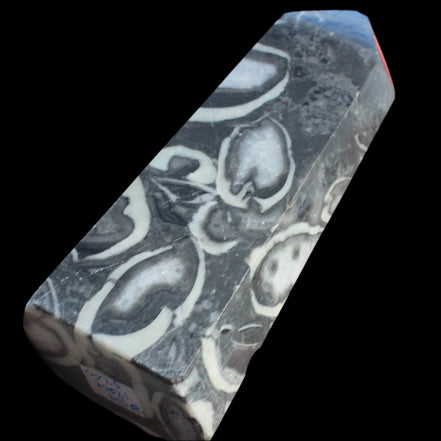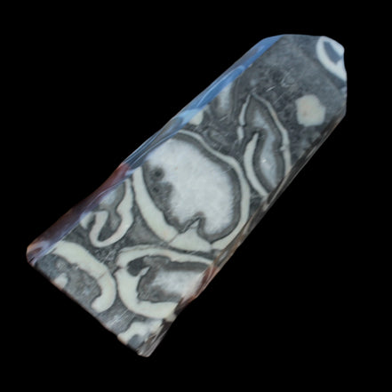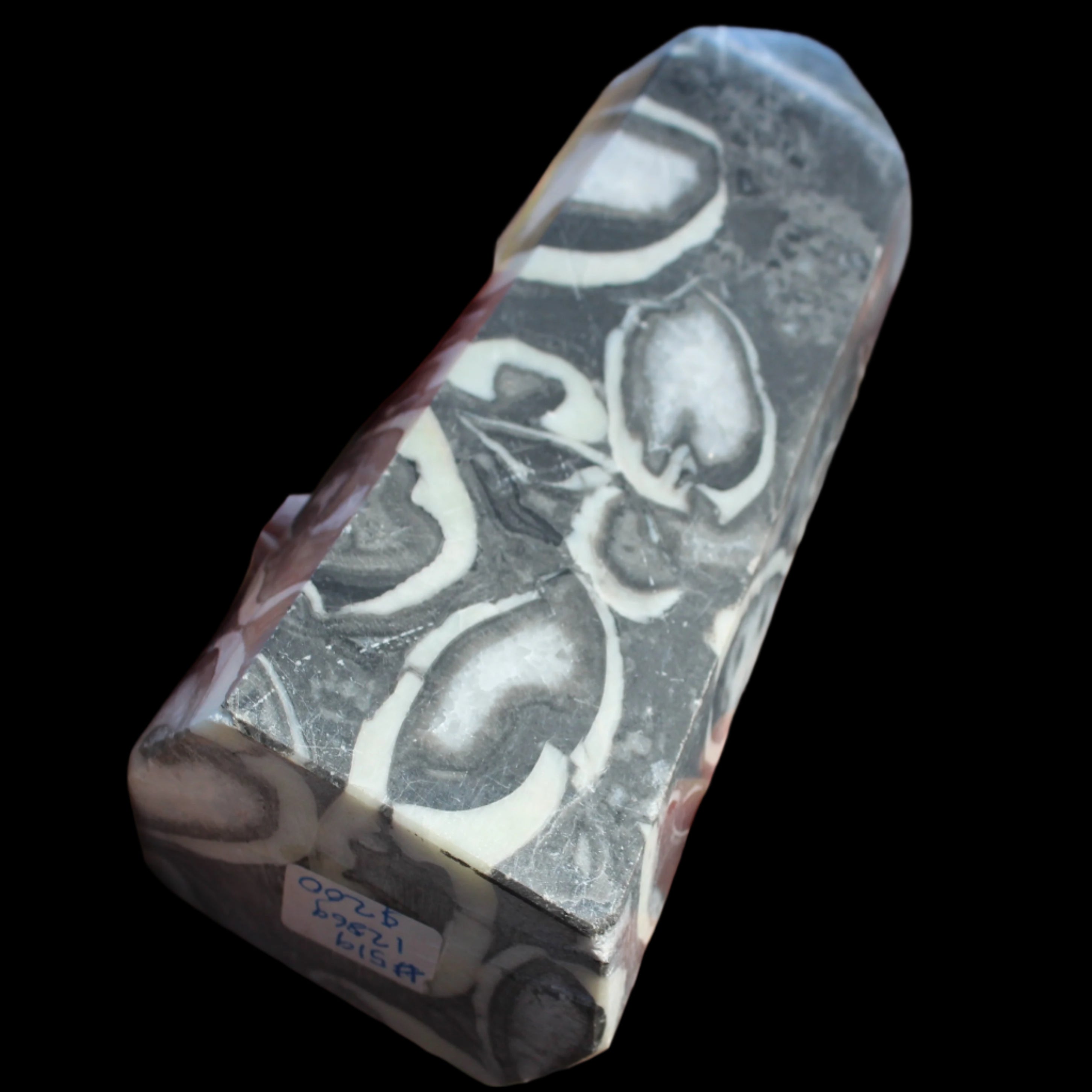 This Thousand Eye Stone obelisk weighs 1286g. Thousand Eye Stone is also called Fossil Shell Jasper, Seashell Jasper and Shell Marble. It is a form of Marble and not Jasper. Marble is a nurturing and protective stone. It is highly grounding.