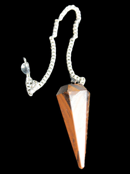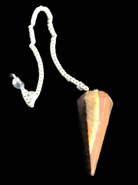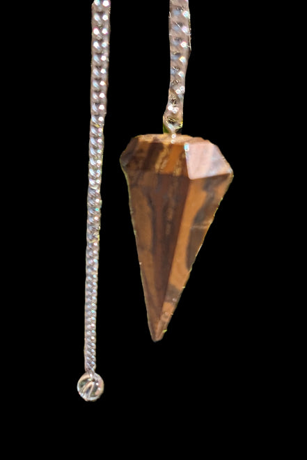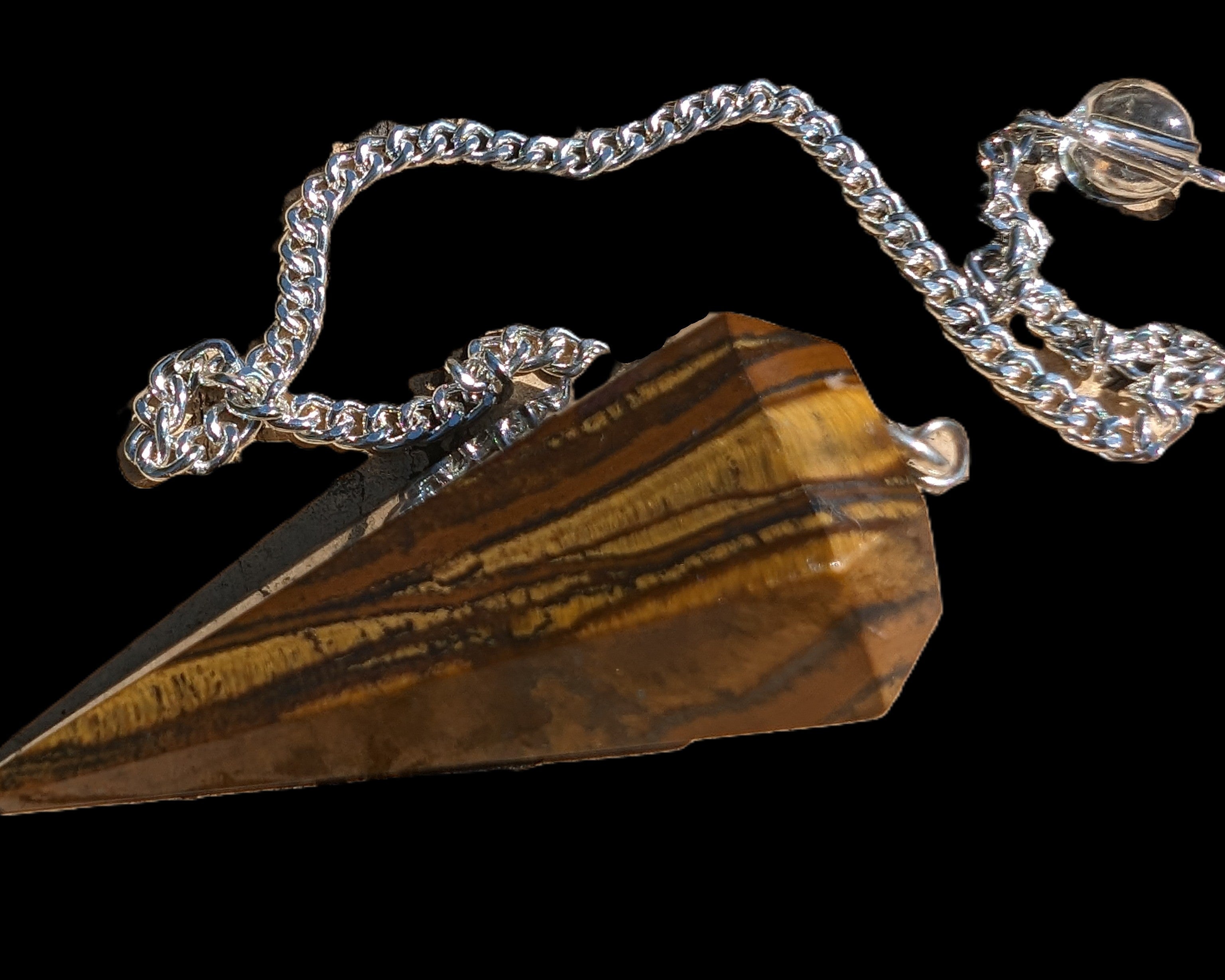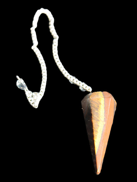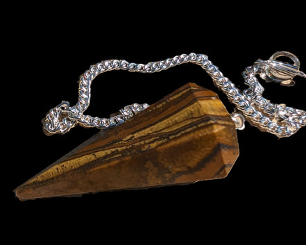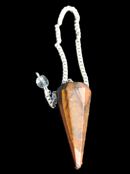 These Tigers Eye faceted pendulum are perfect for dowsing. Each was made in India for this purpose. Combining the energy of the Earth and the Sun, Golden Tigers Eye draws Spiritual energy down to the Earth, while keeping you centred here on the ground. It brings sunny brightness and optimism to a situation, shining insight onto problems.