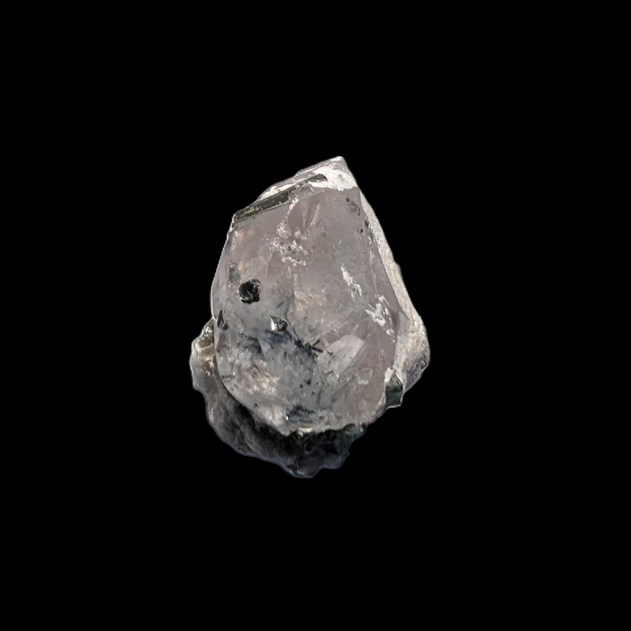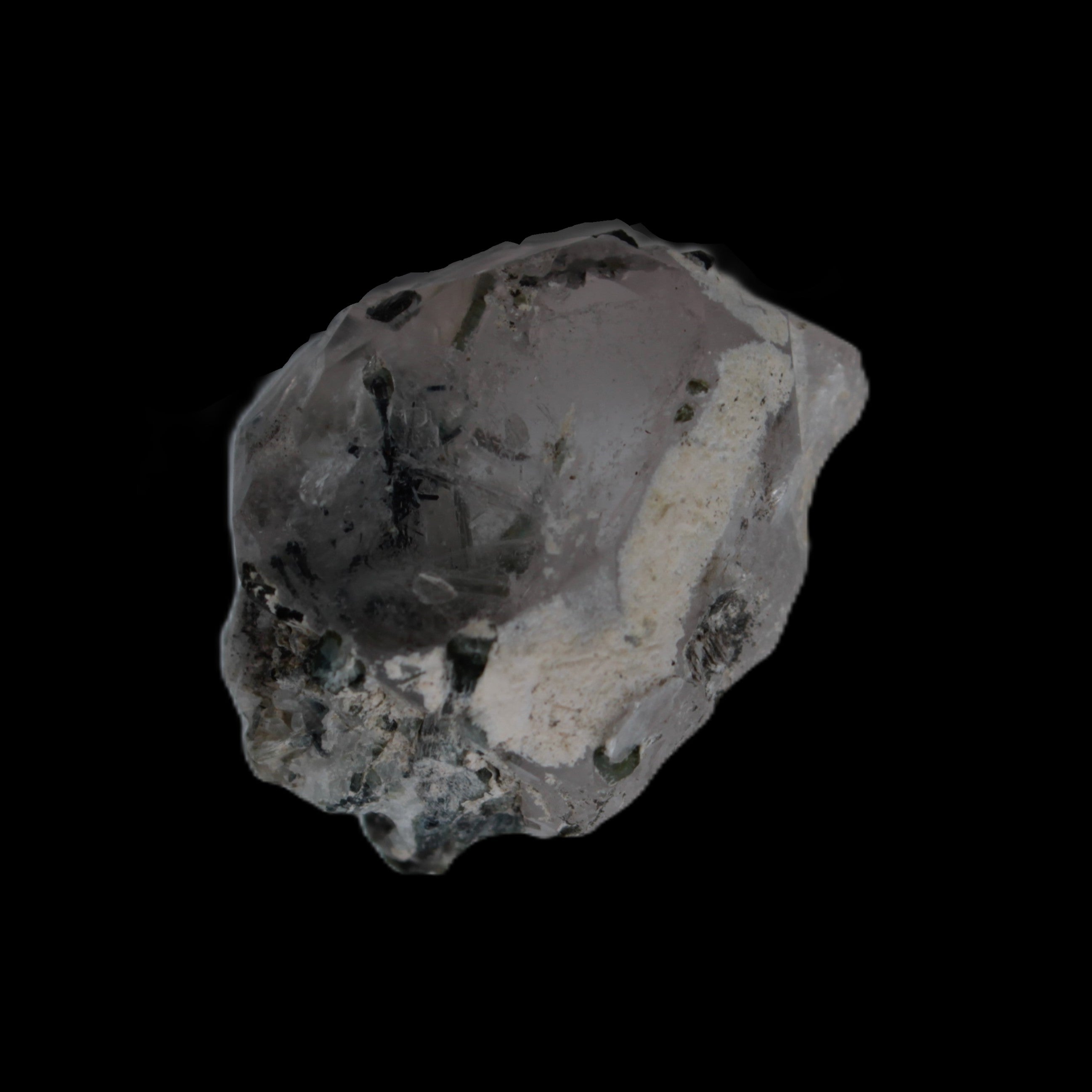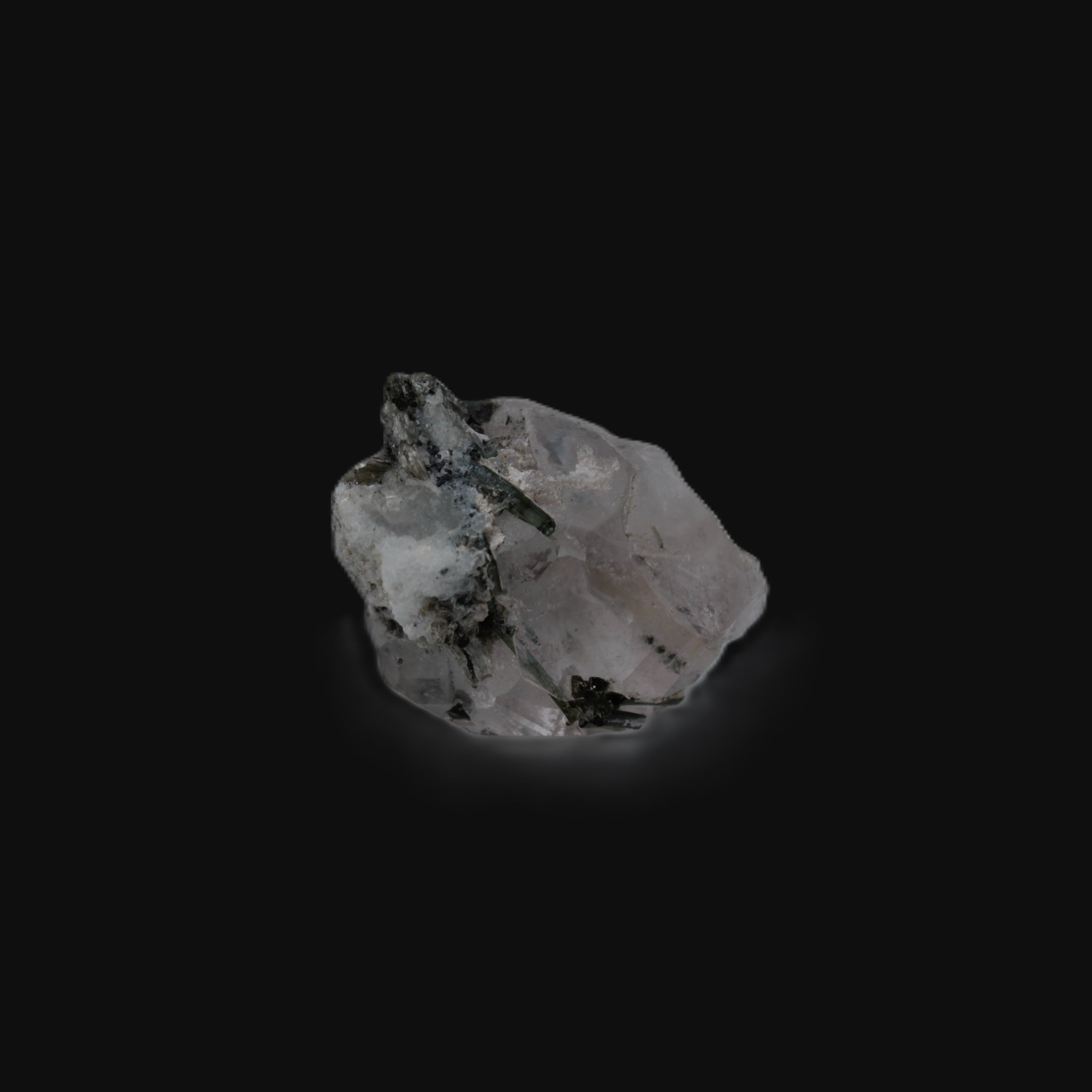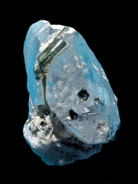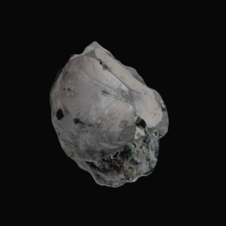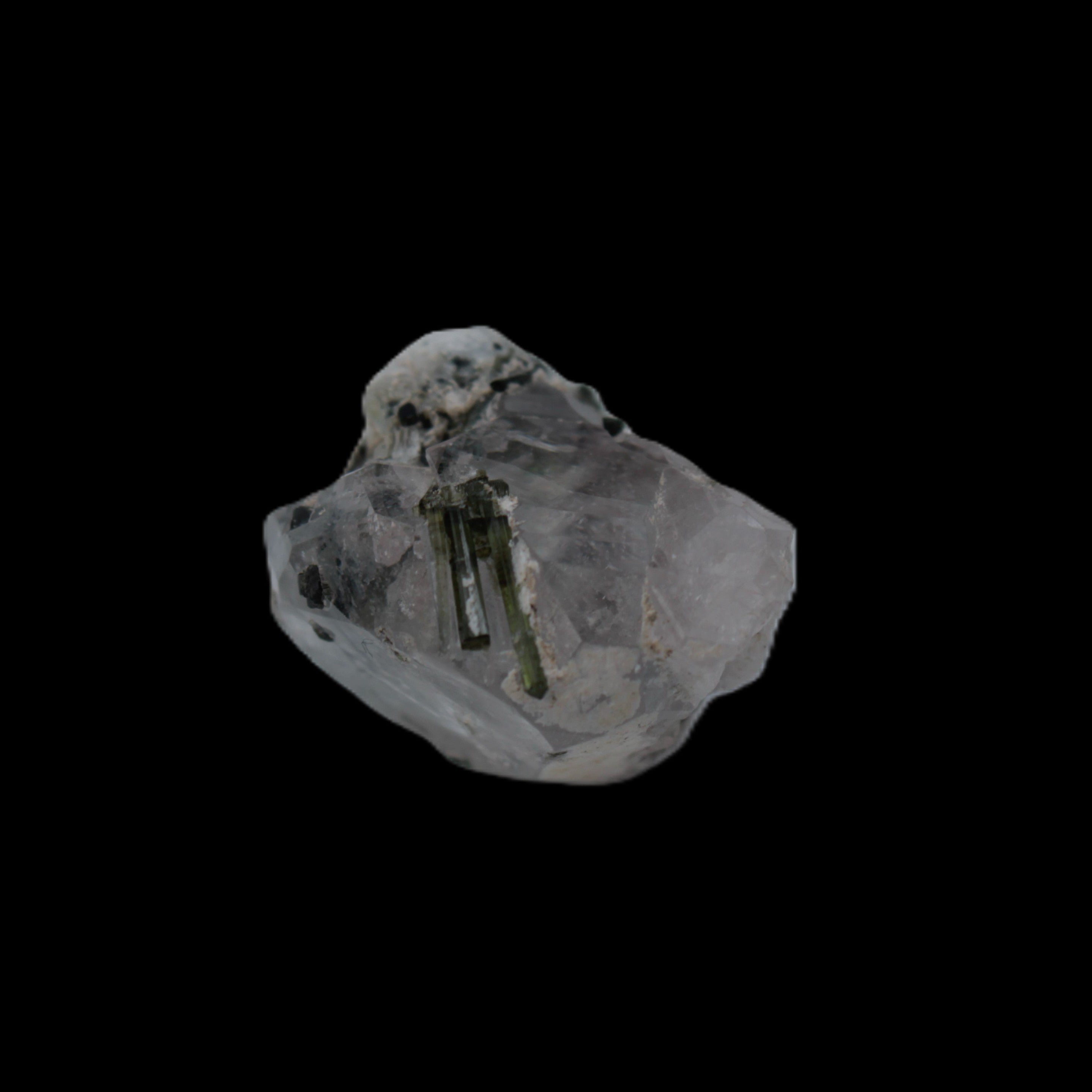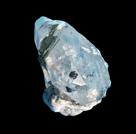 This specimen is Green Tourmaline crystals on twinned Quartz with extra features. It weighs 33.4ct, which is 6.7g. This small but complicated specimen is formed by a twinned Clear Quartz crystal and Green Tourmaline. The quartz has a number of unusual crystal structure formations including a five-sided Isis face and a window timelink, which is an extra diamond-shaped facet. It was sourced from the gem fields of Afghanistan for Rocks and Things Store by Lawrence Handicrafts.