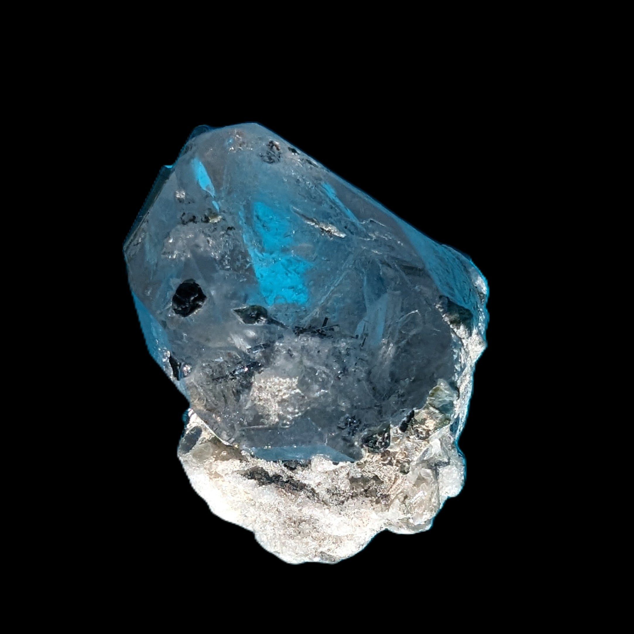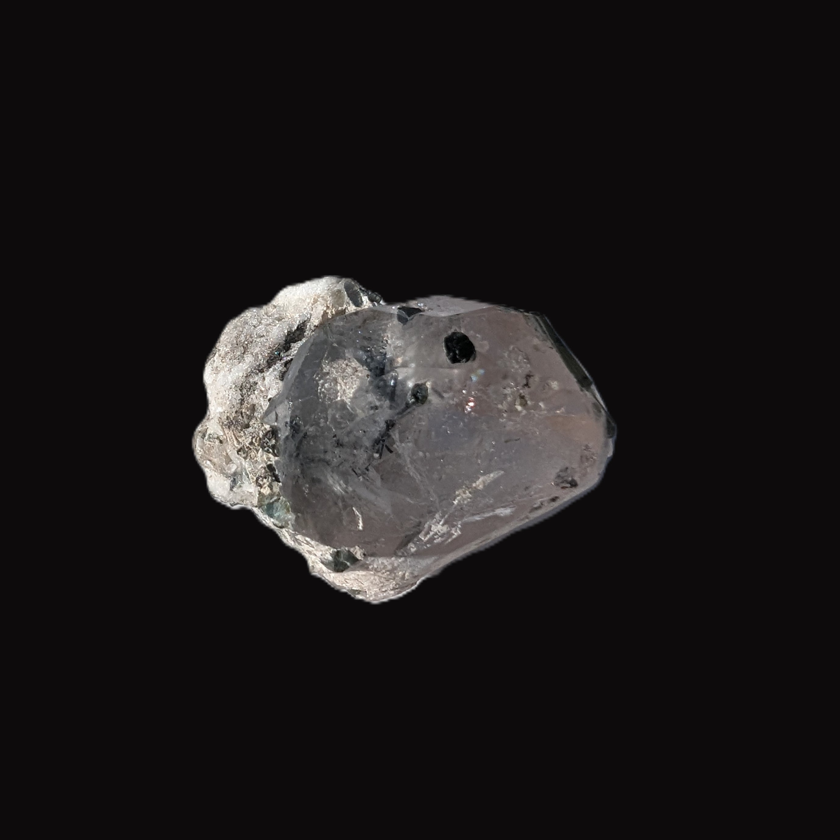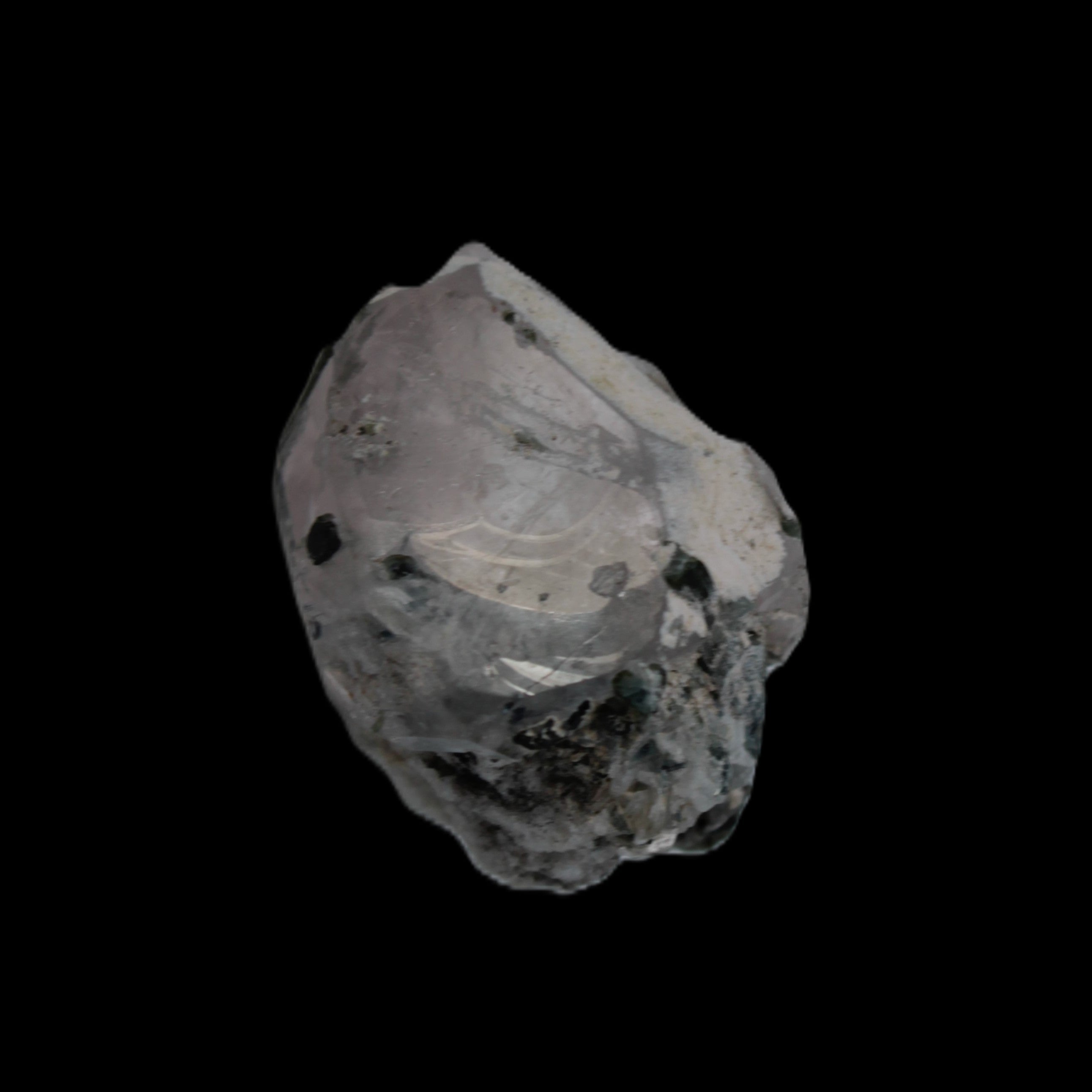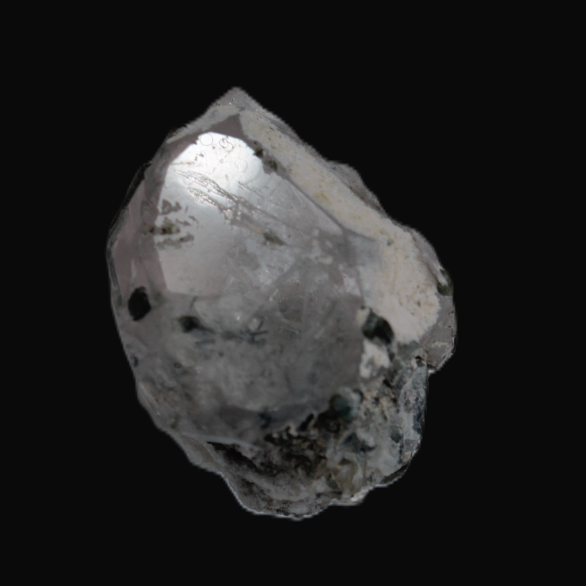 This specimen is Green Tourmaline crystals on twinned Quartz with extra features. It weighs 33.4ct, which is 6.7g. This small but complicated specimen is formed by a twinned Clear Quartz crystal and Green Tourmaline. The quartz has a number of unusual crystal structure formations including a five-sided Isis face and a window timelink, which is an extra diamond-shaped facet. It was sourced from the gem fields of Afghanistan for Rocks and Things Store by Lawrence Handicrafts.