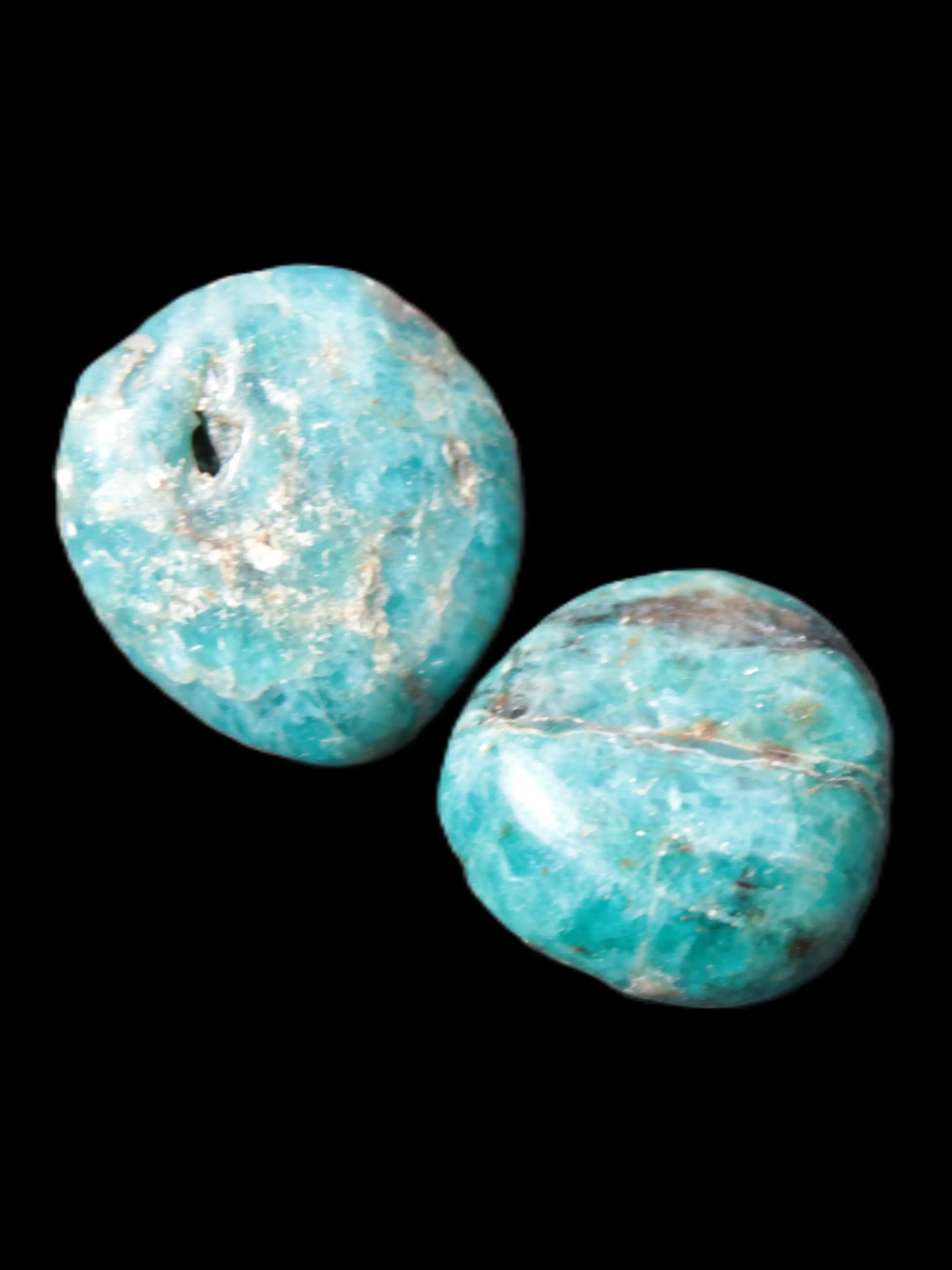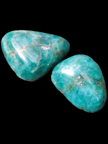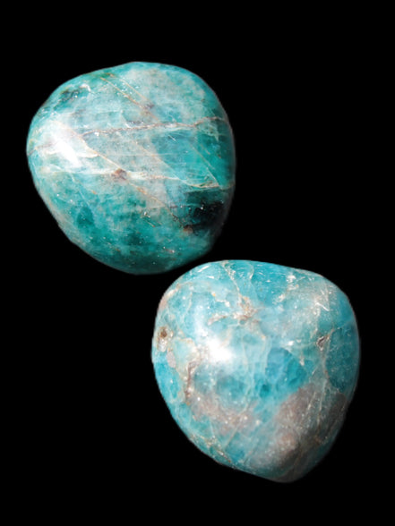 This item is a selection of two Blue Apatite stones that weigh 16-19g. This beautiful stone is found in Madagascar. The stone is also called Neon Apatite for its bright electric blue to blue-green colour.