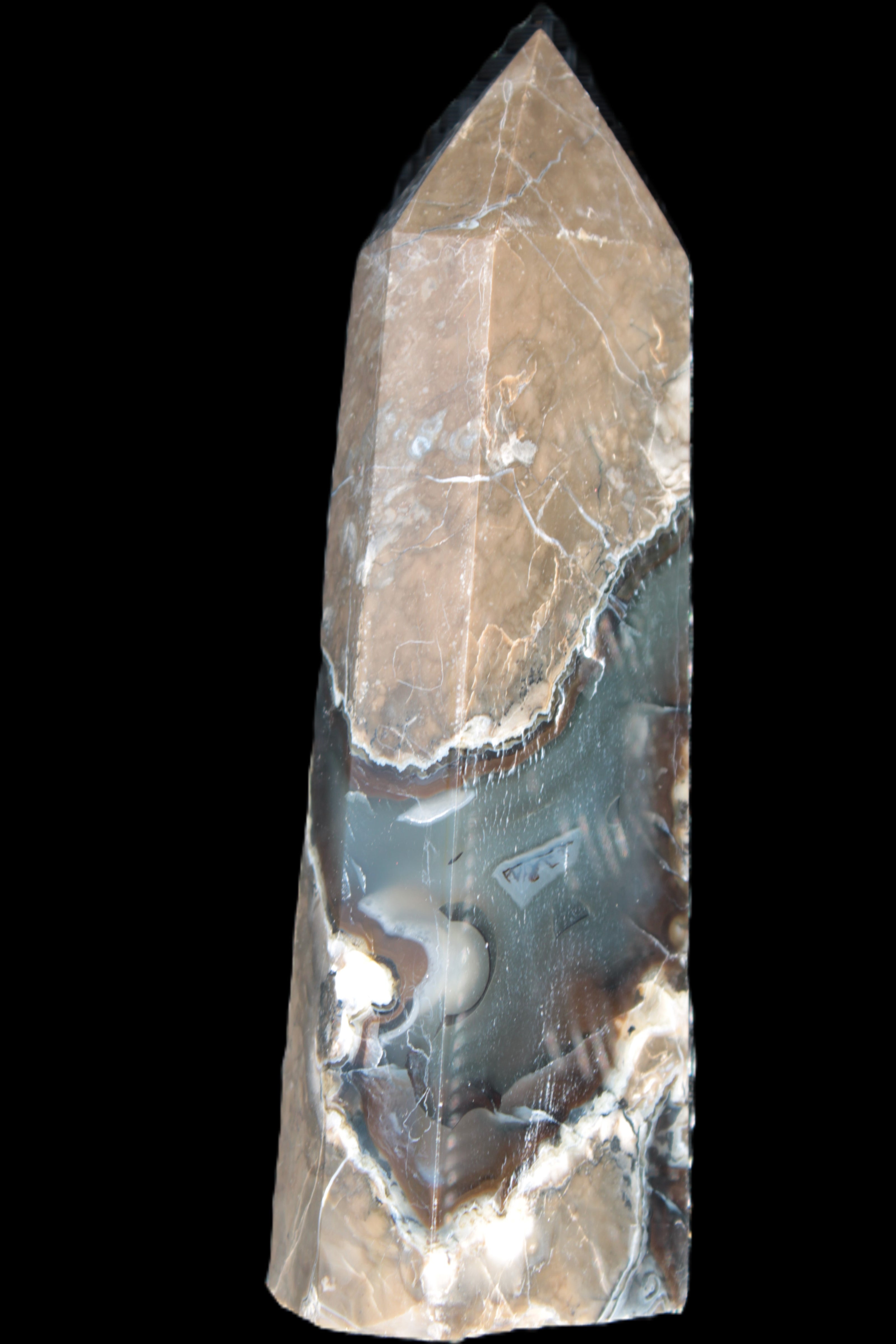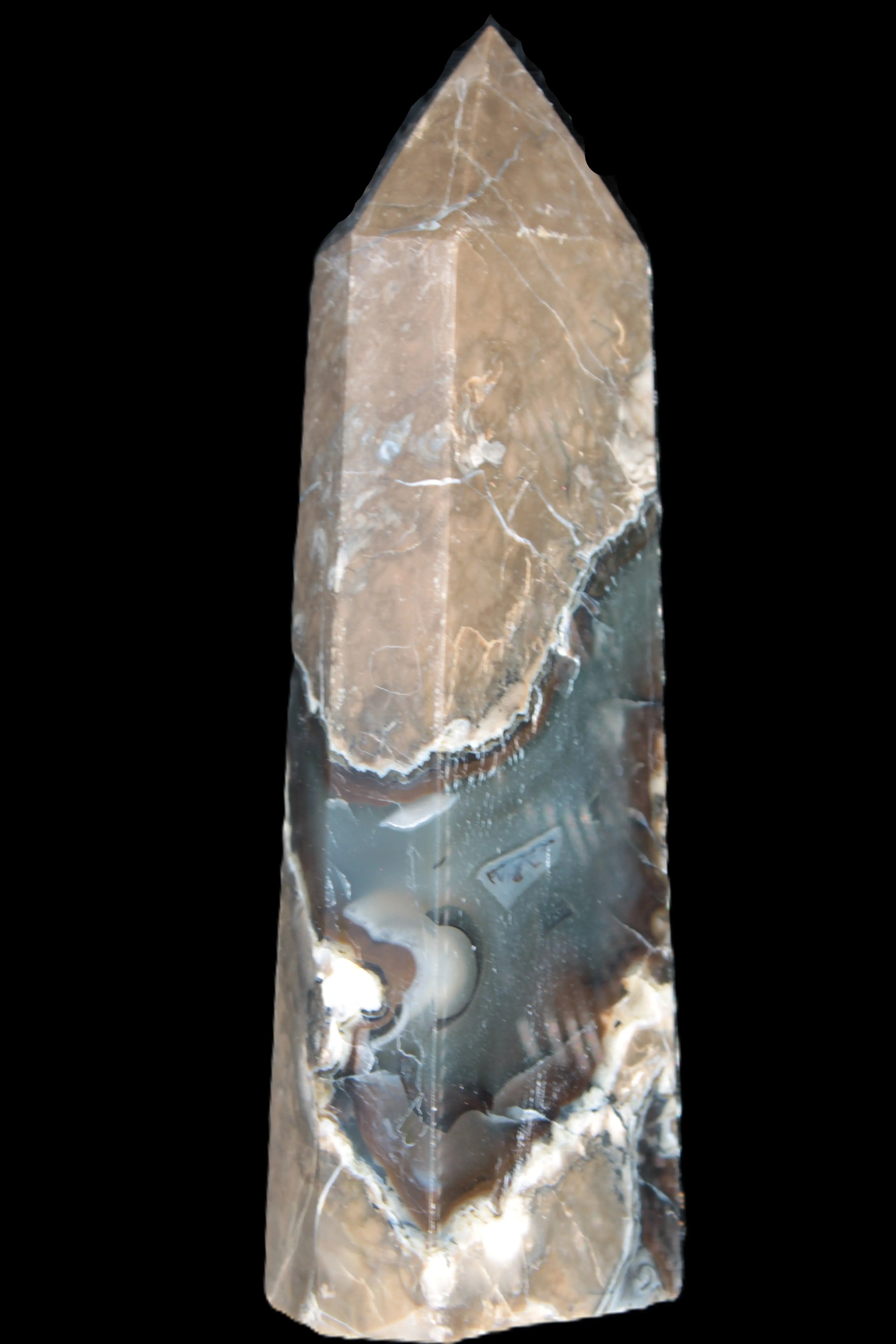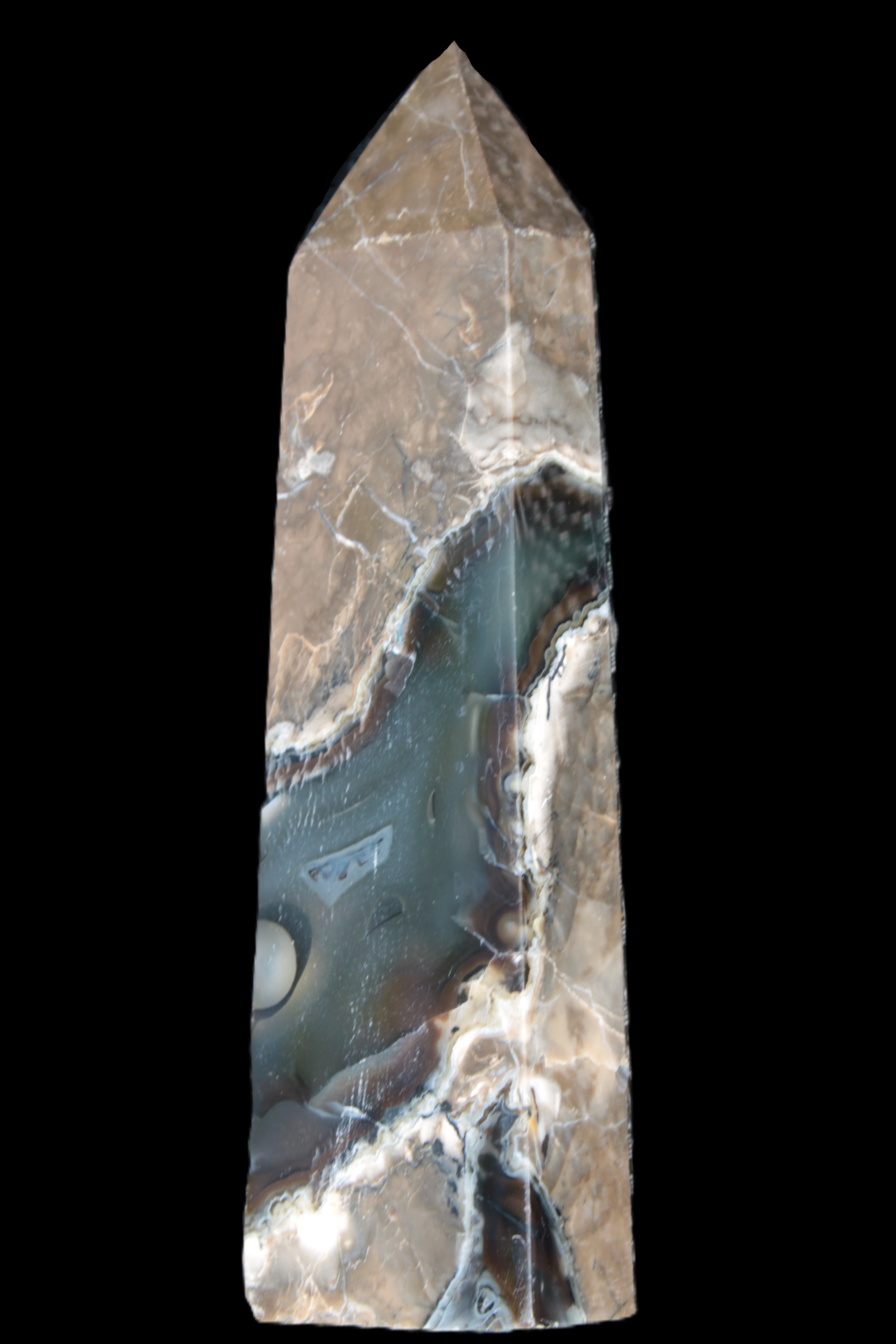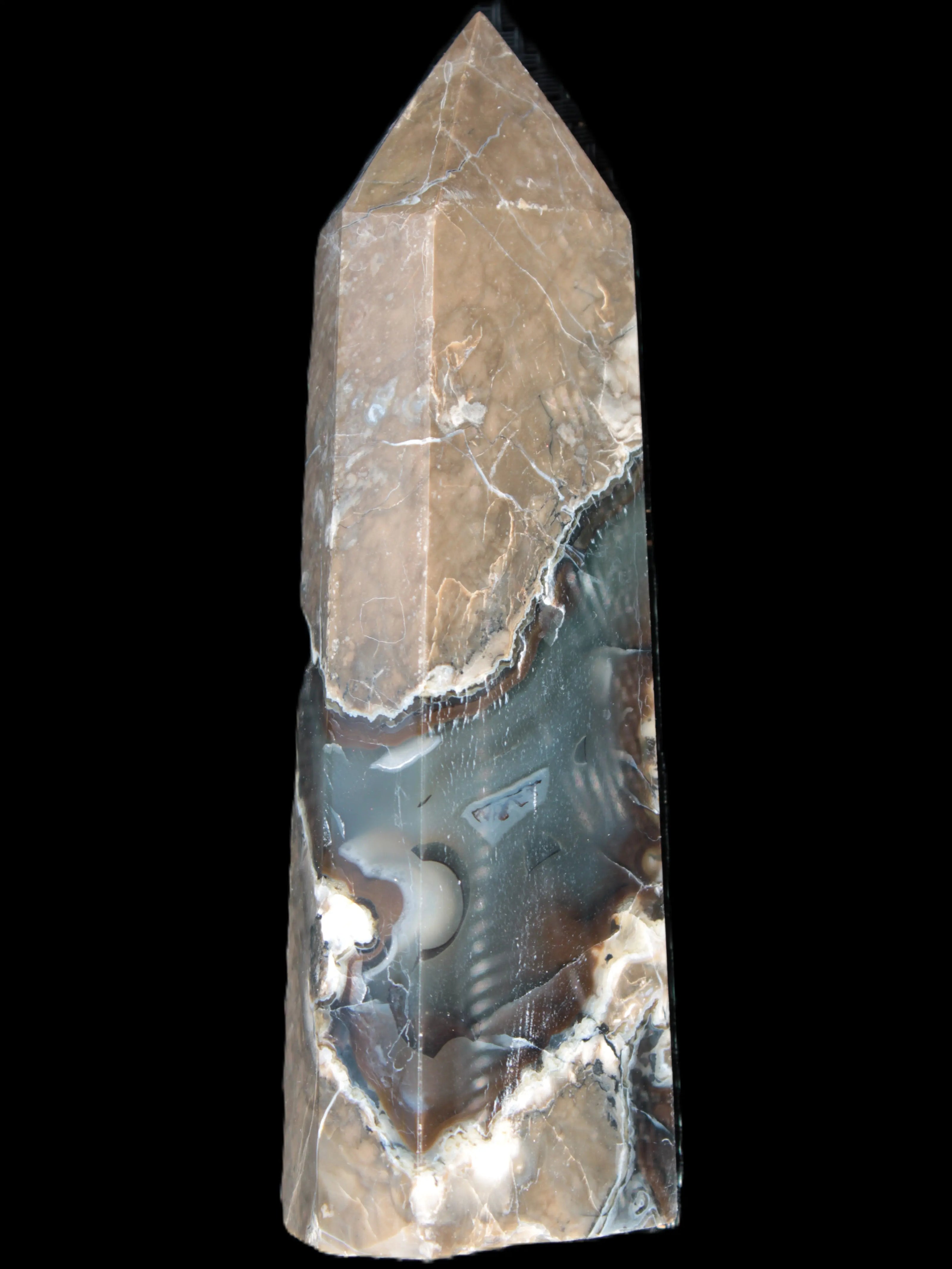 This Volcano Agate obelisk is 143mm high and weighs 328g. The rock it was shaped from formed in a volcanic environment, within a cavity in the volcanic rocks. This gives it some different features compared to other more typical agates that formed in sedimentary or metamorphic rock.