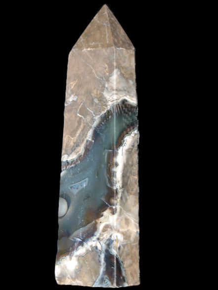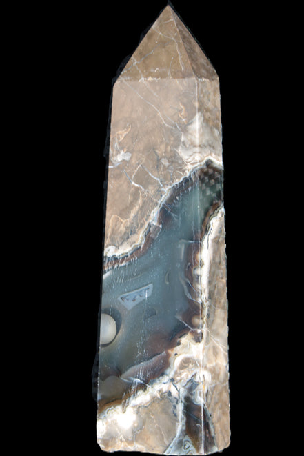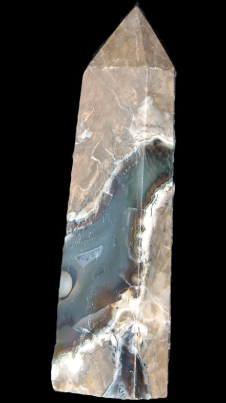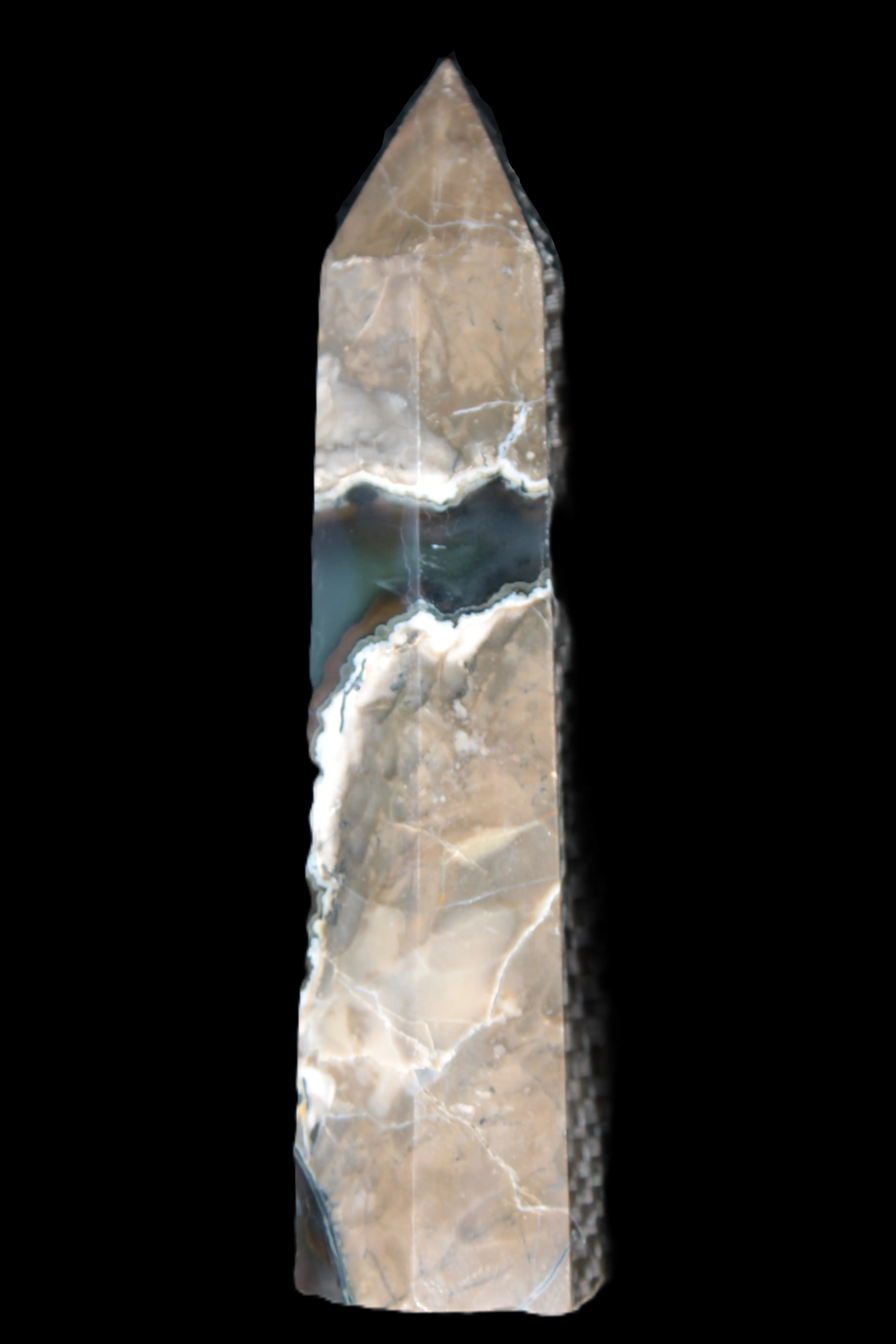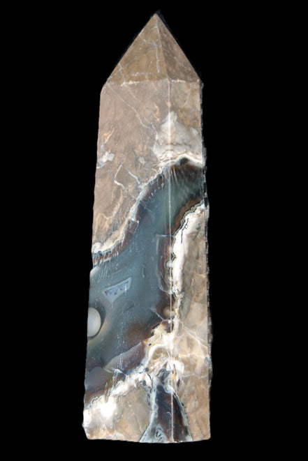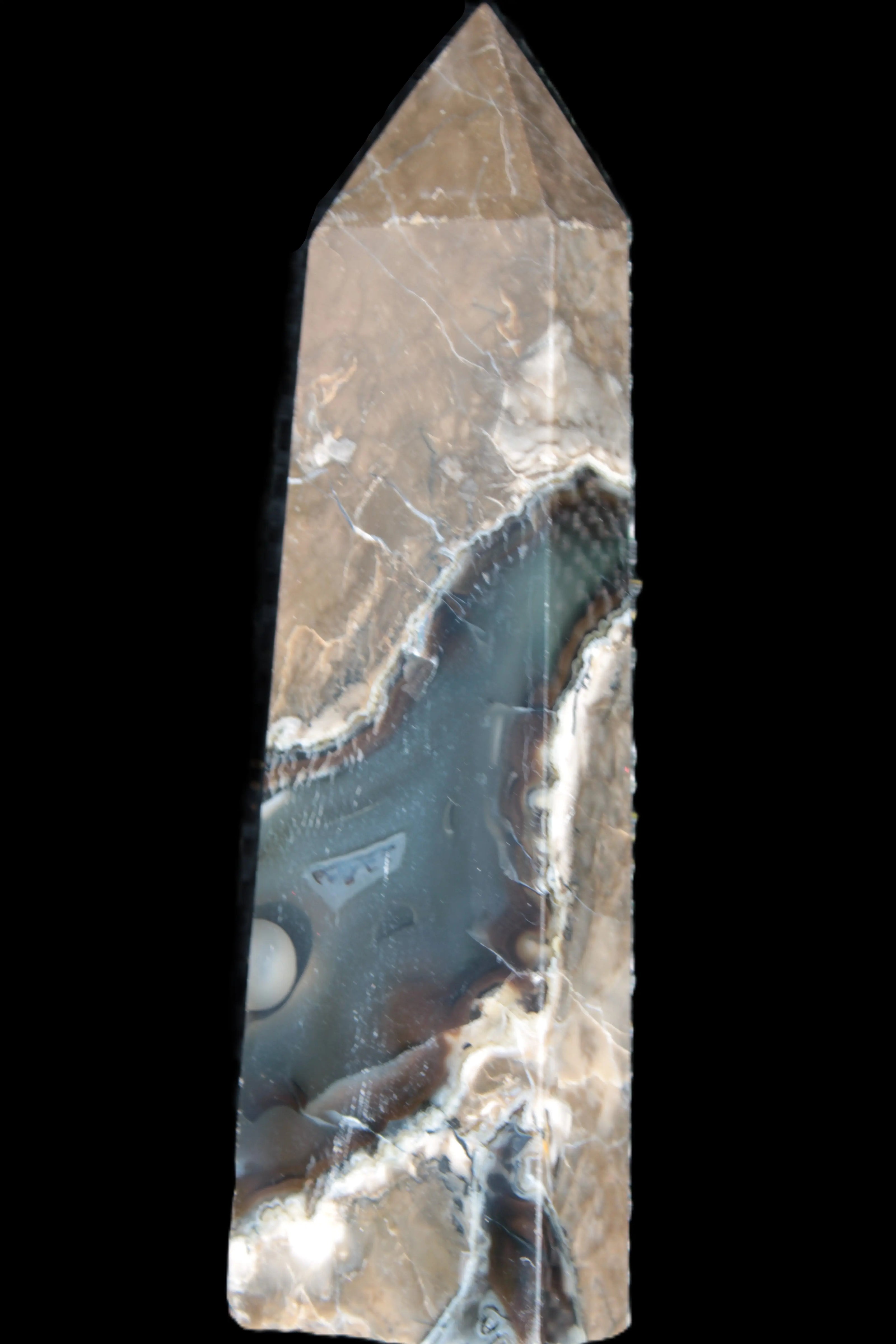This Volcano Agate obelisk is 143mm high and weighs 328g. The rock it was shaped from formed in a volcanic environment, within a cavity in the volcanic rocks. This gives it some different features compared to other more typical agates that formed in sedimentary or metamorphic rock.