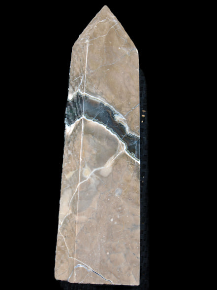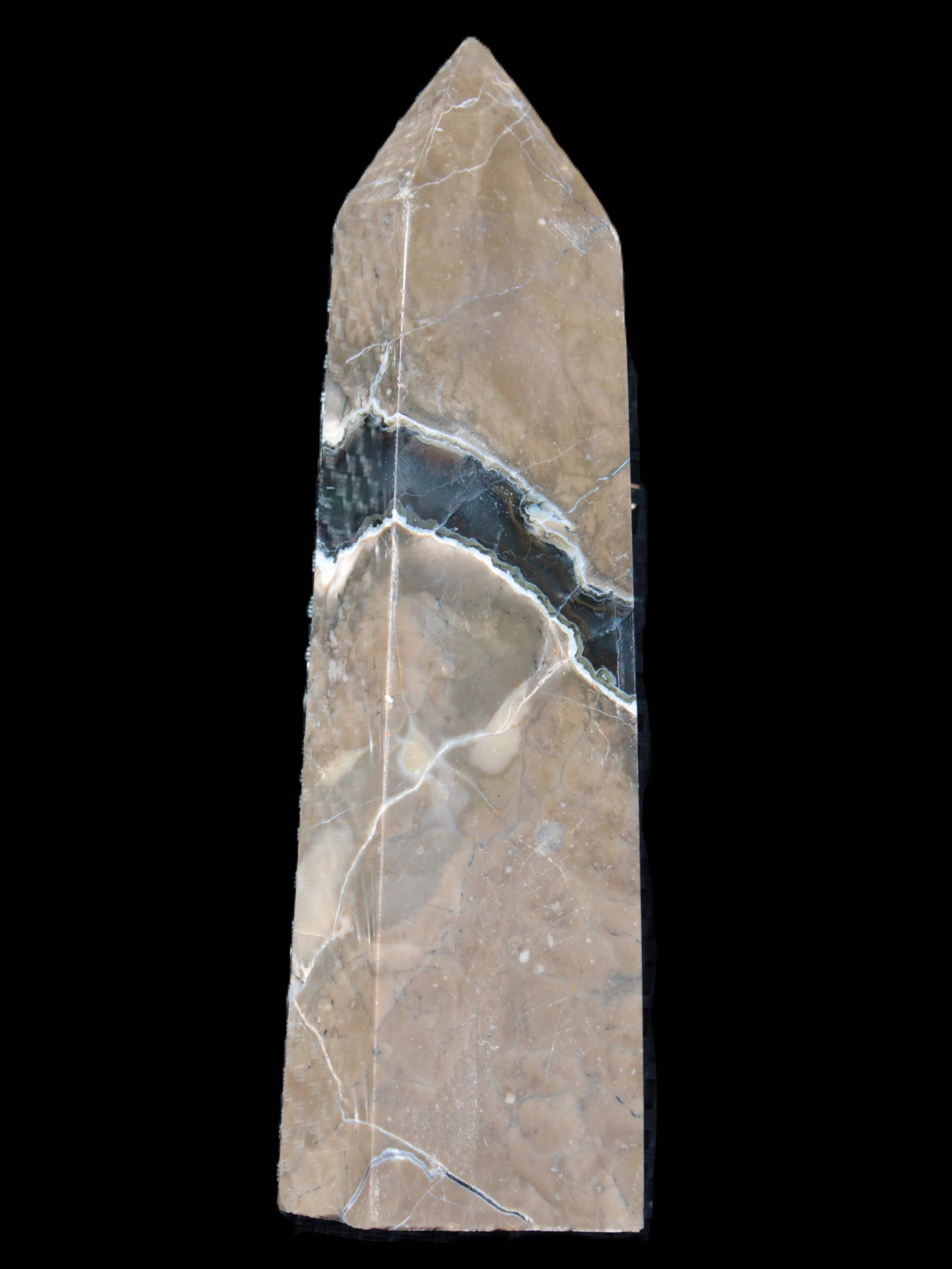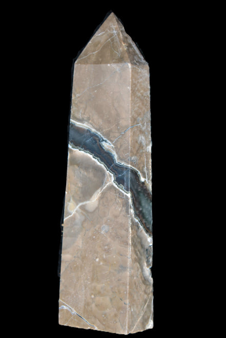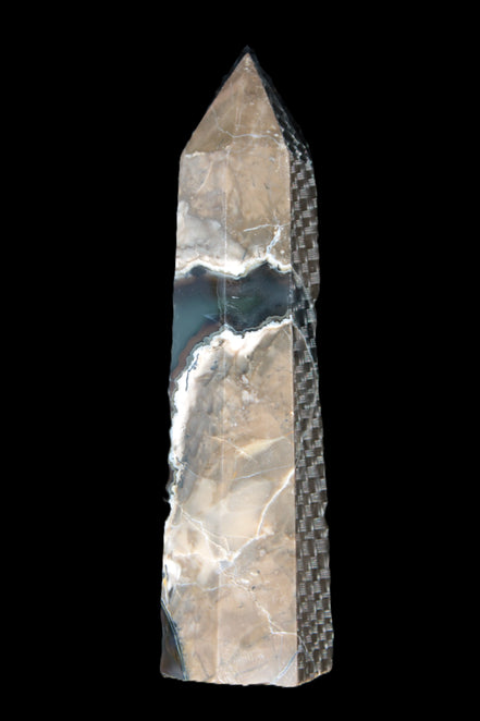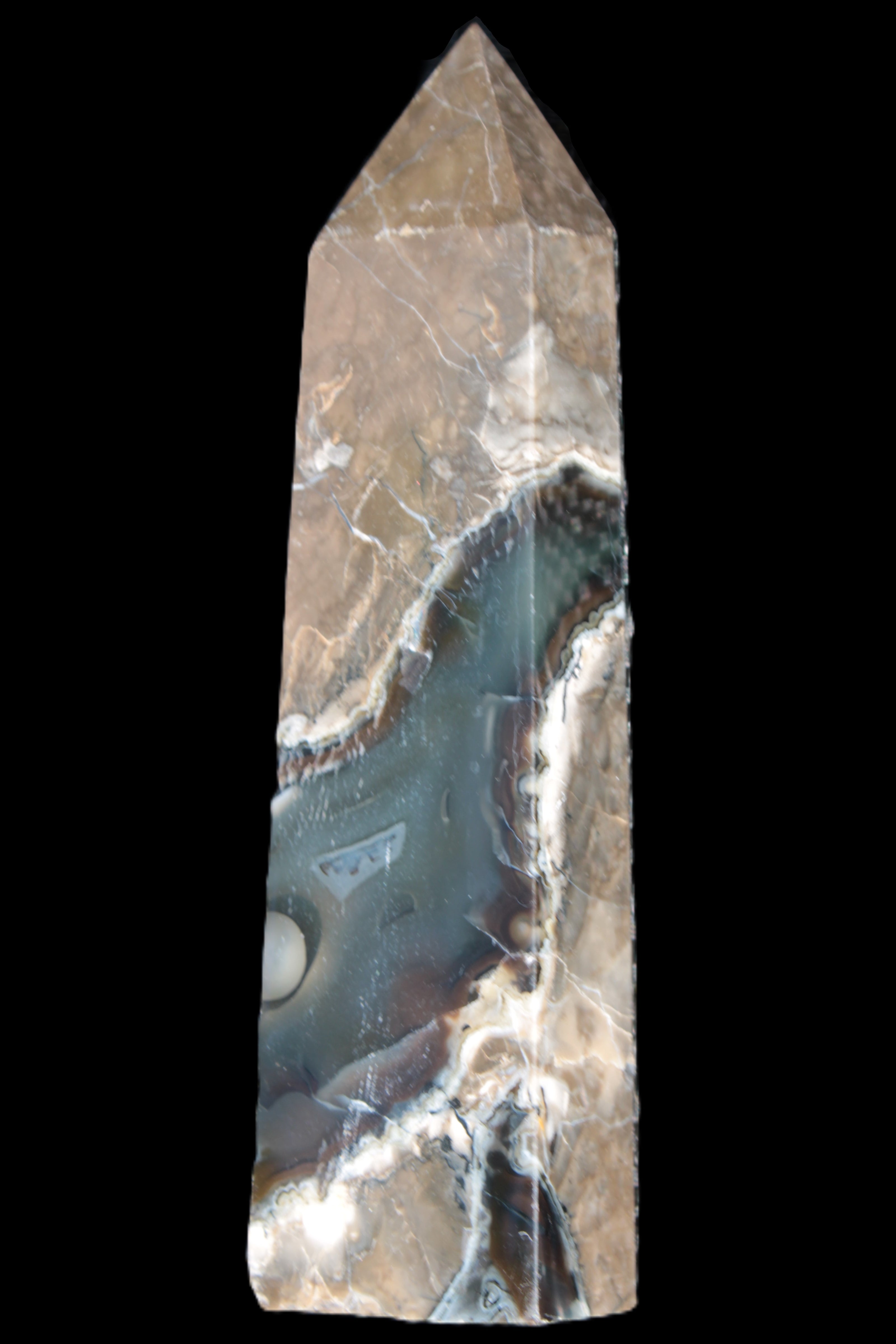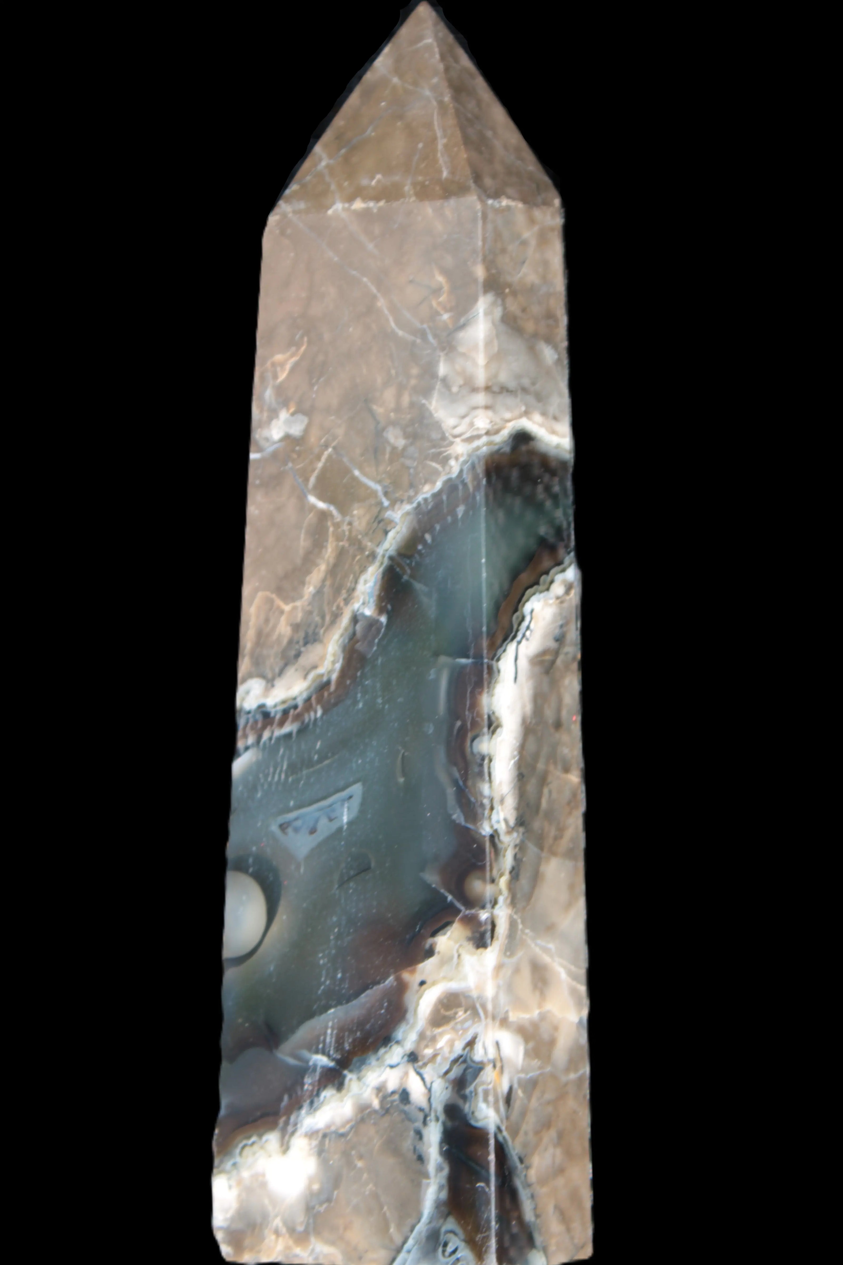 This Volcano Agate obelisk is 143mm high and weighs 328g. The rock it was shaped from formed in a volcanic environment, within a cavity in the volcanic rocks. This gives it some different features compared to other more typical agates that formed in sedimentary or metamorphic rock.