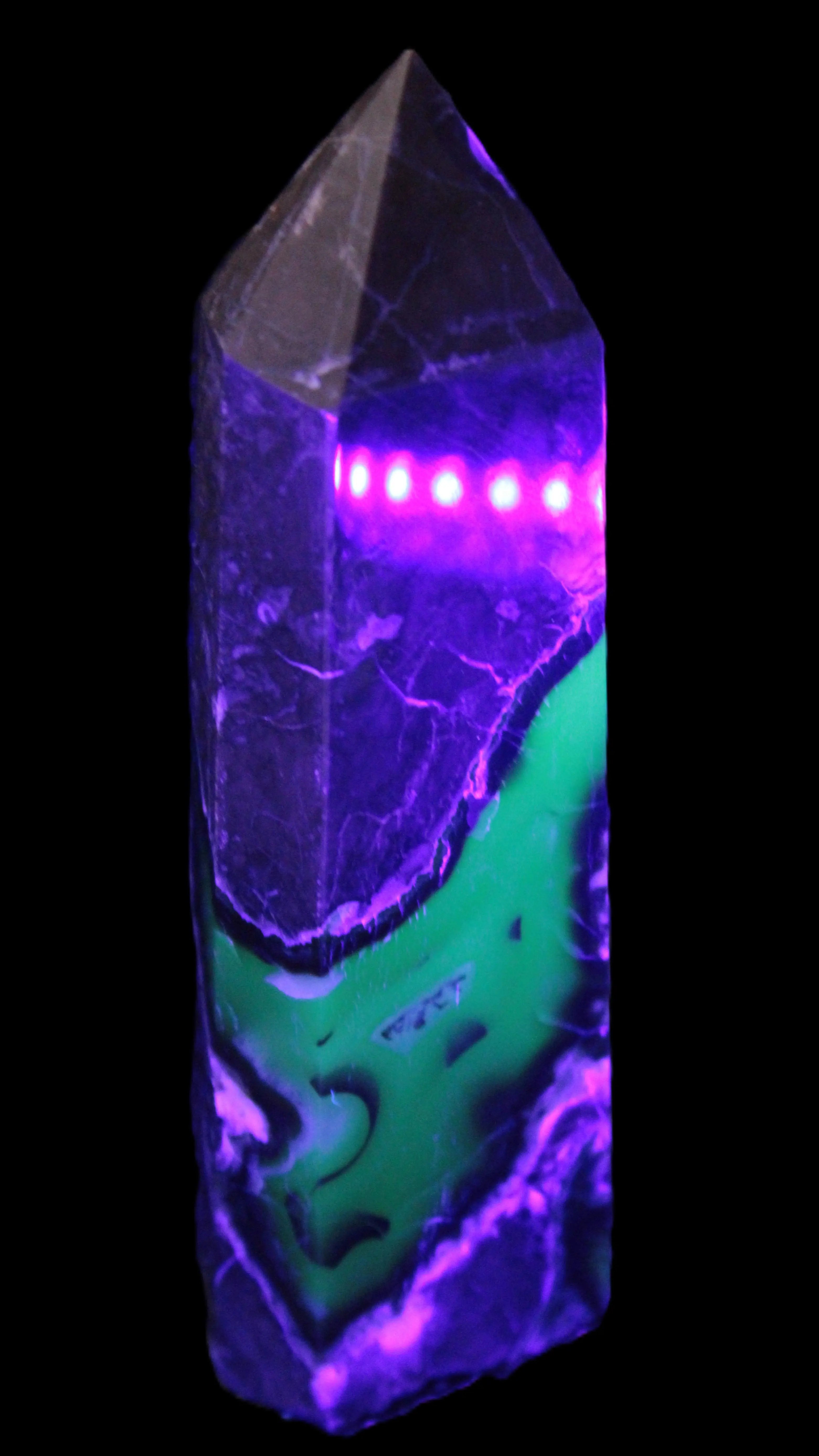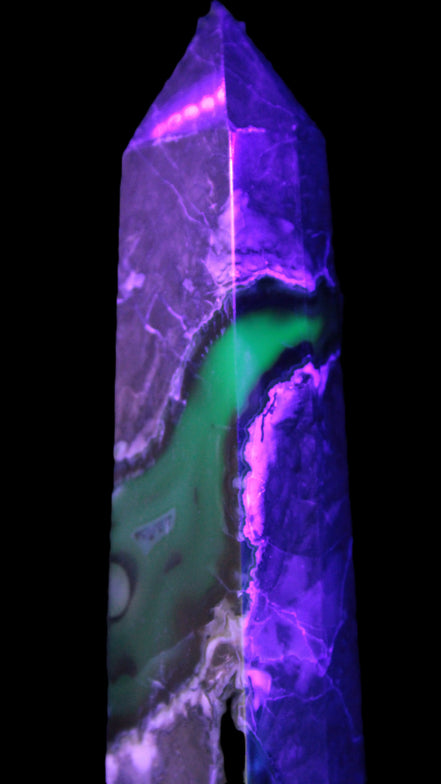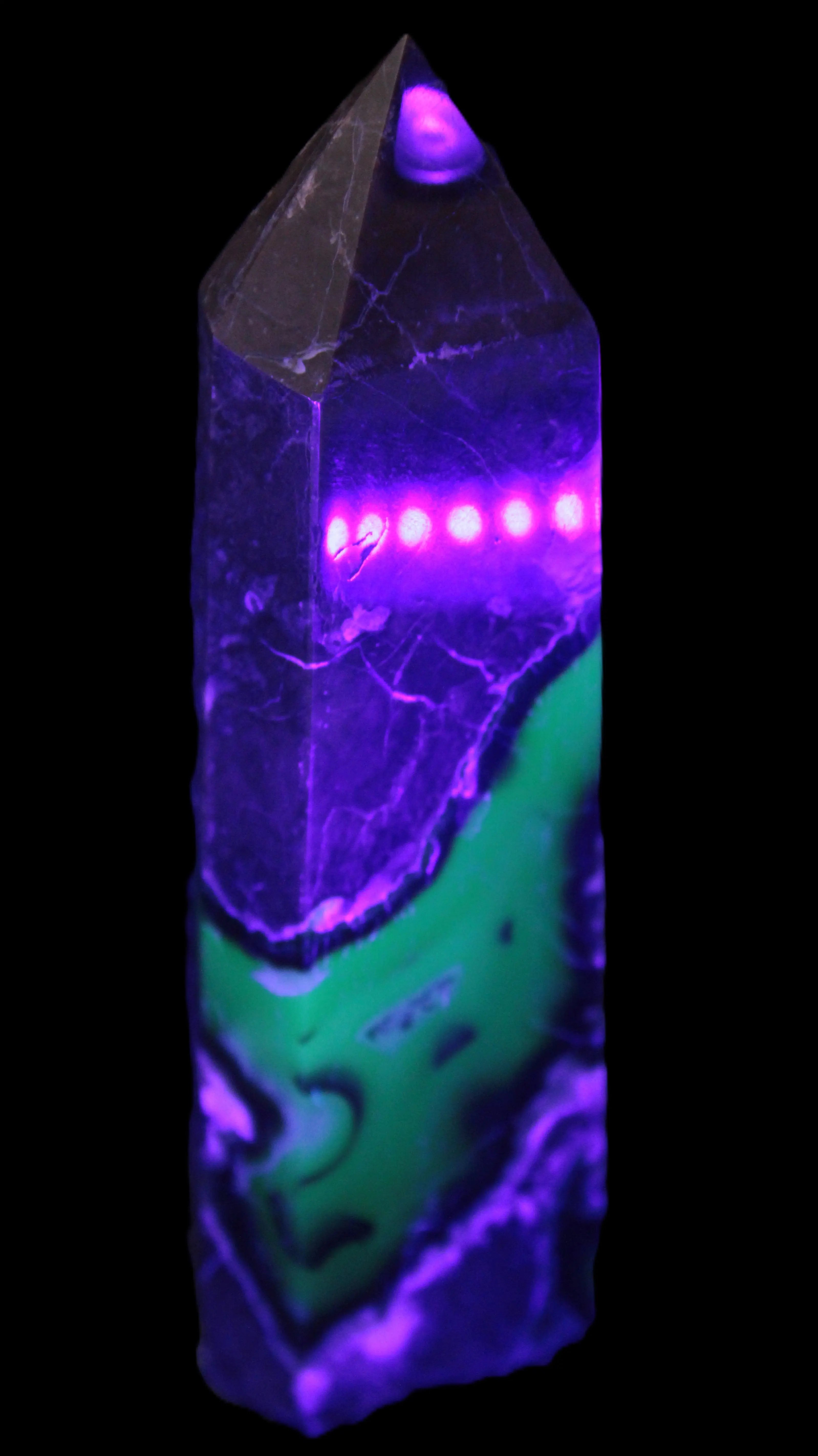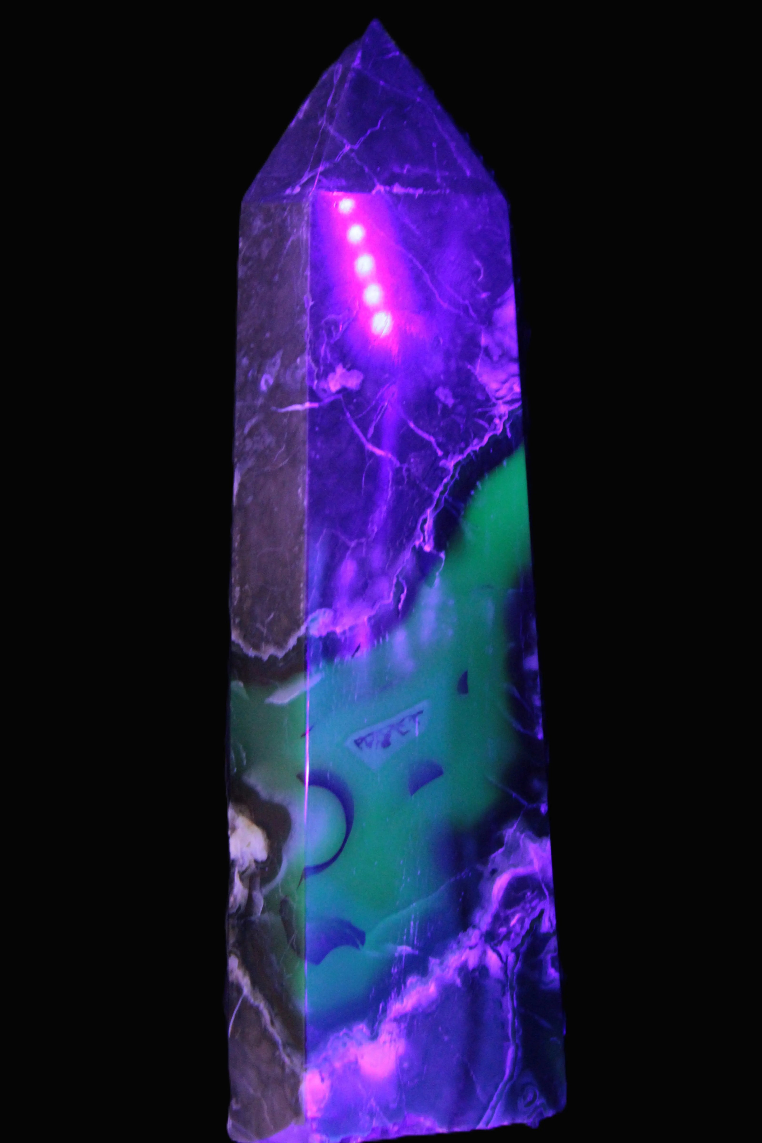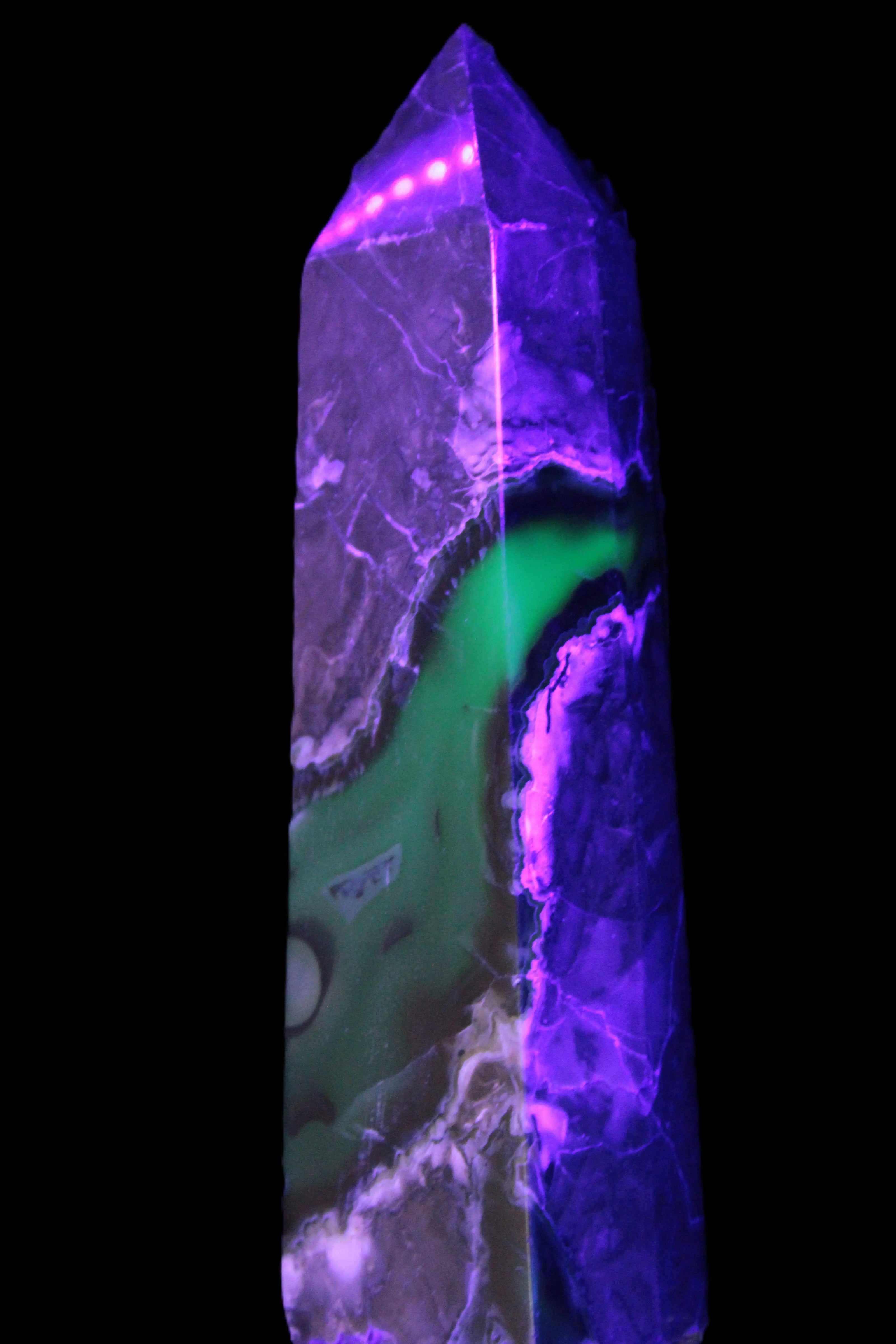 The dark Volcano Agate obelisk has unique patterns and hidden features. Strong colours emerge from the dark stone in reaction to Ultra-Violet light. The strong UV reaction of this Volcano Agate obelisk with vibrant greens is particularly striking. These qualities reflect its origins in volcanic activity and the minerals present in the lava from which the rock formed. This has resulted in its striking appearance with banding and inclusions of other minerals.