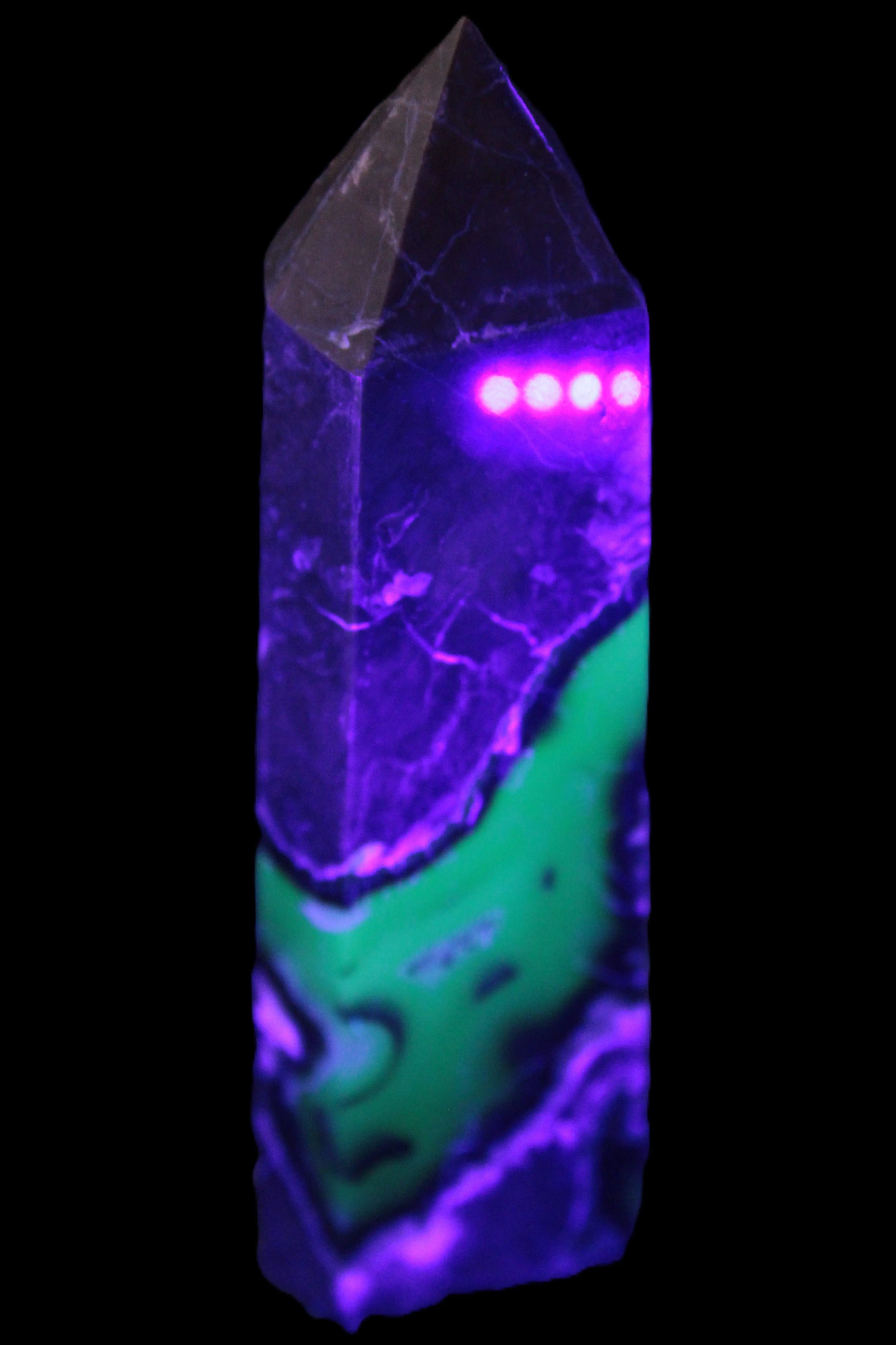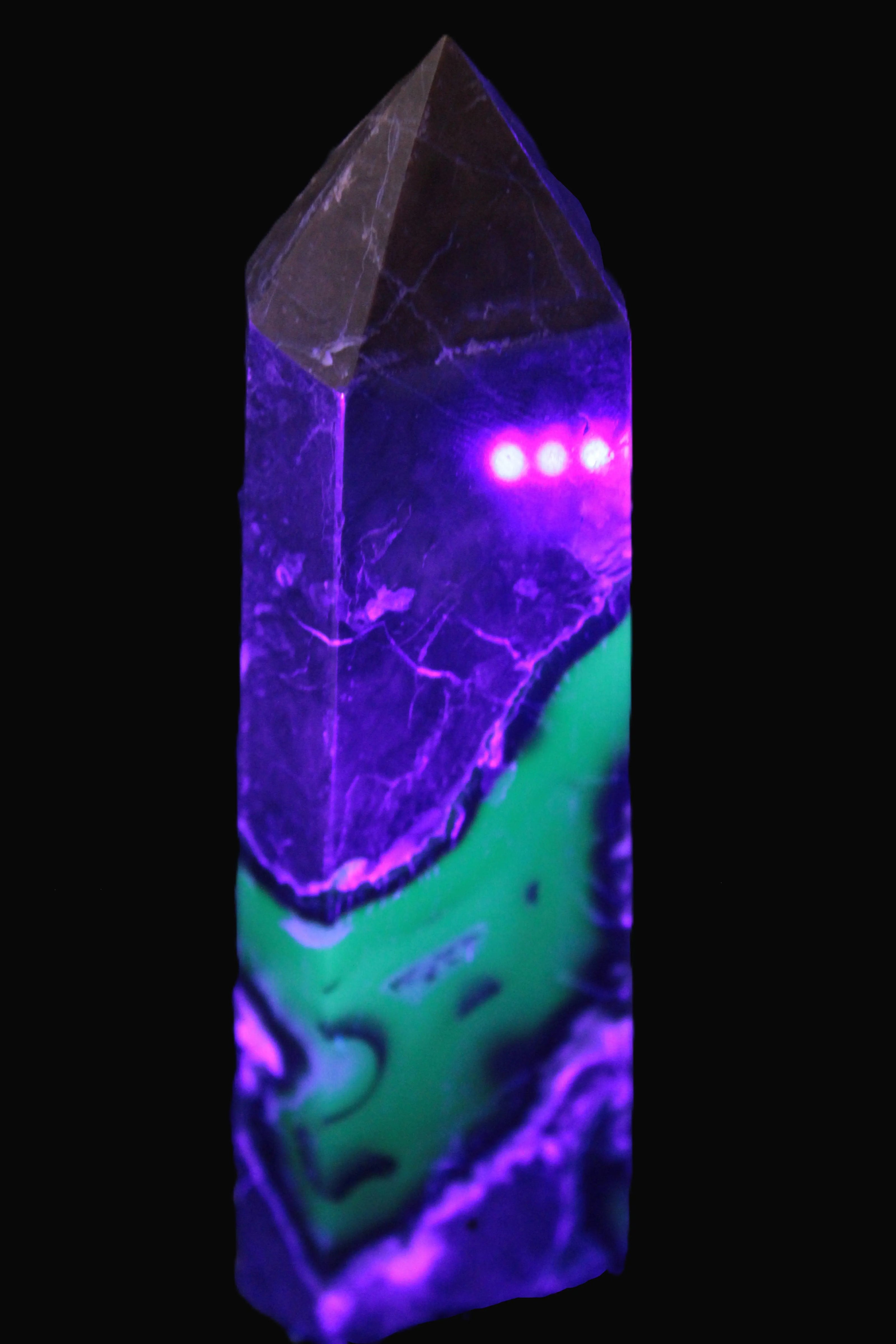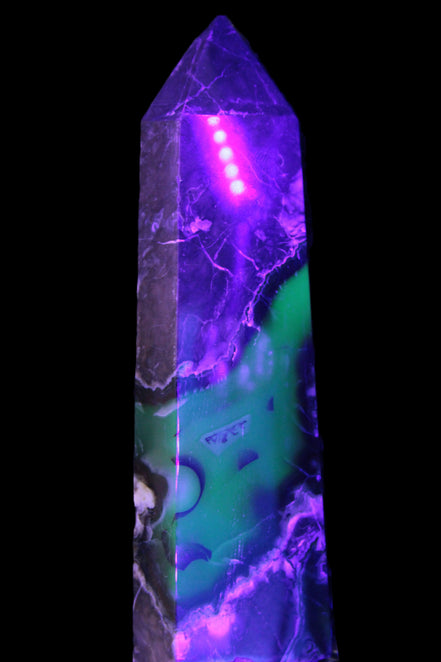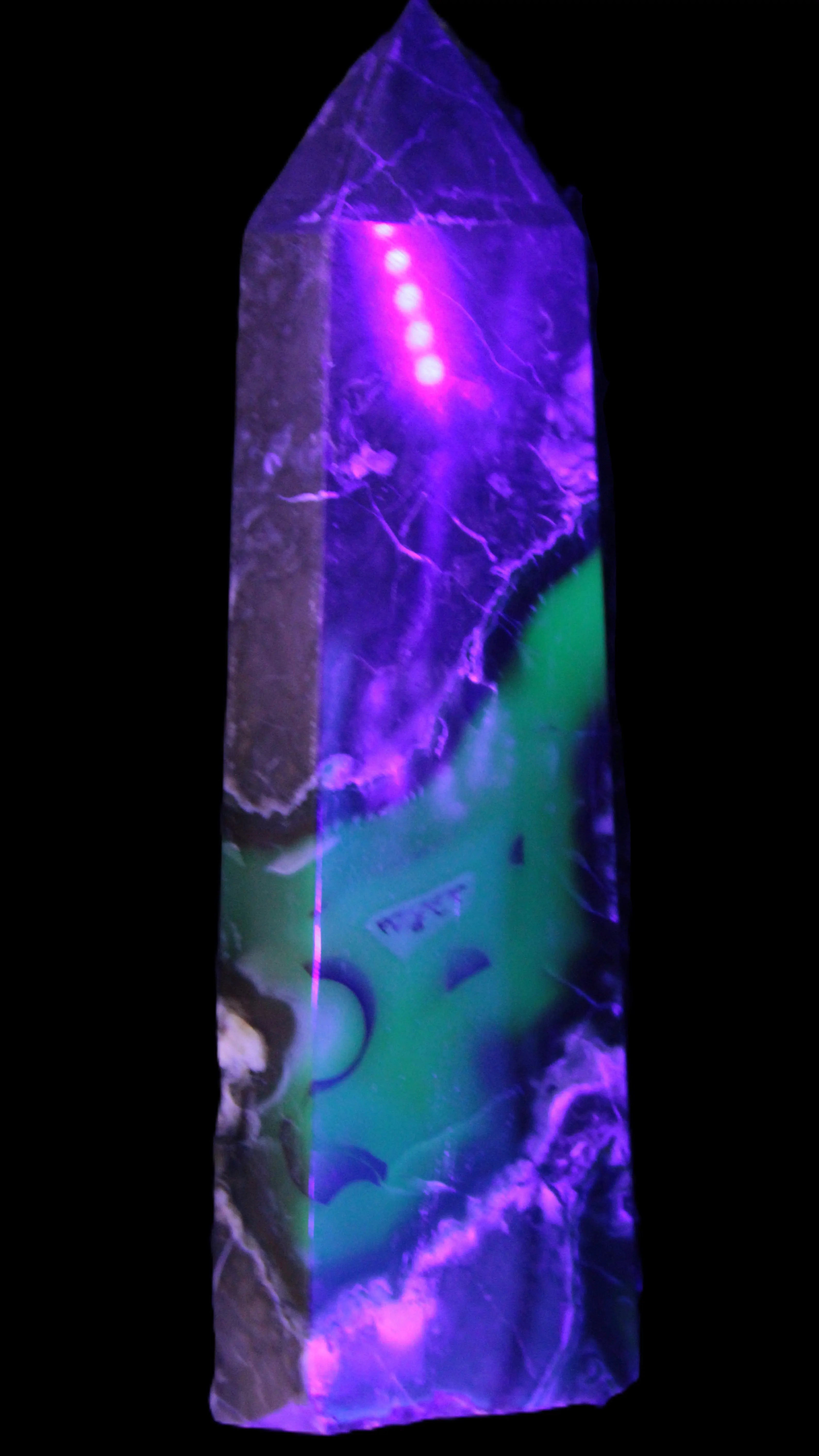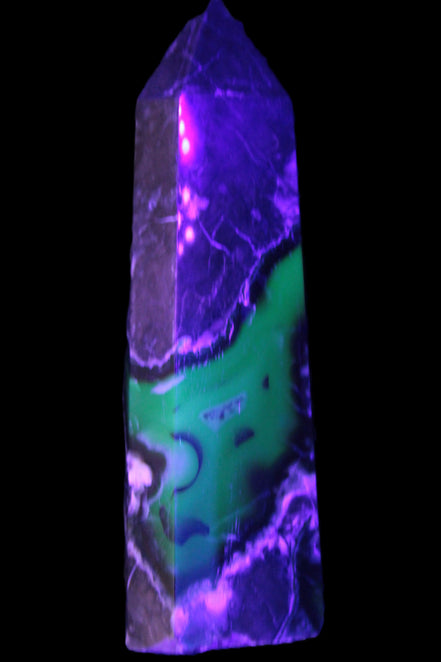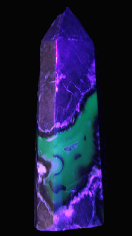 The dark Volcano Agate obelisk has unique patterns and hidden features. Strong colours emerge from the dark stone in reaction to Ultra-Violet light. The strong UV reaction of this Volcano Agate obelisk with vibrant greens is particularly striking. These qualities reflect its origins in volcanic activity and the minerals present in the lava from which the rock formed. This has resulted in its striking appearance with banding and inclusions of other minerals.