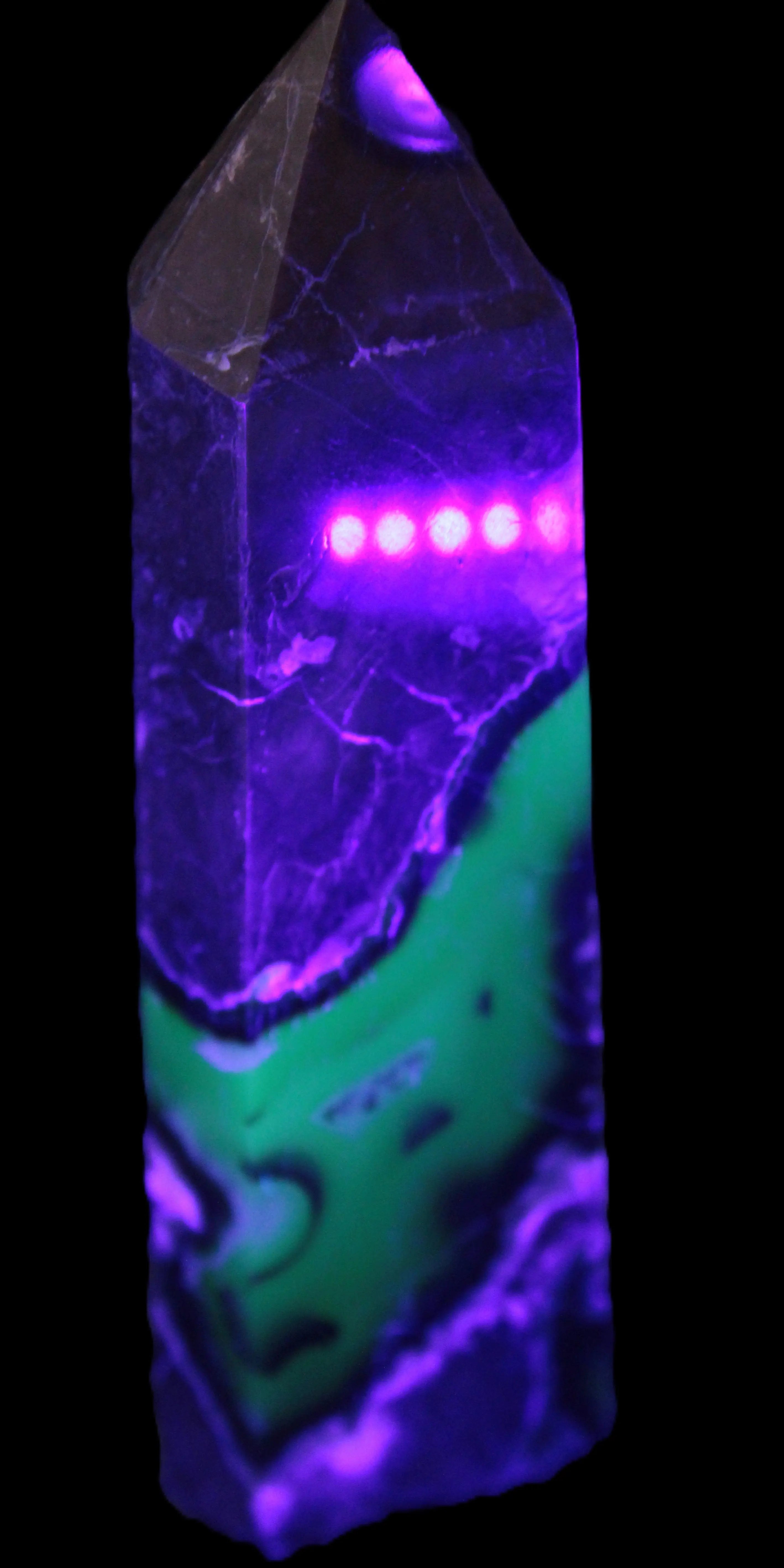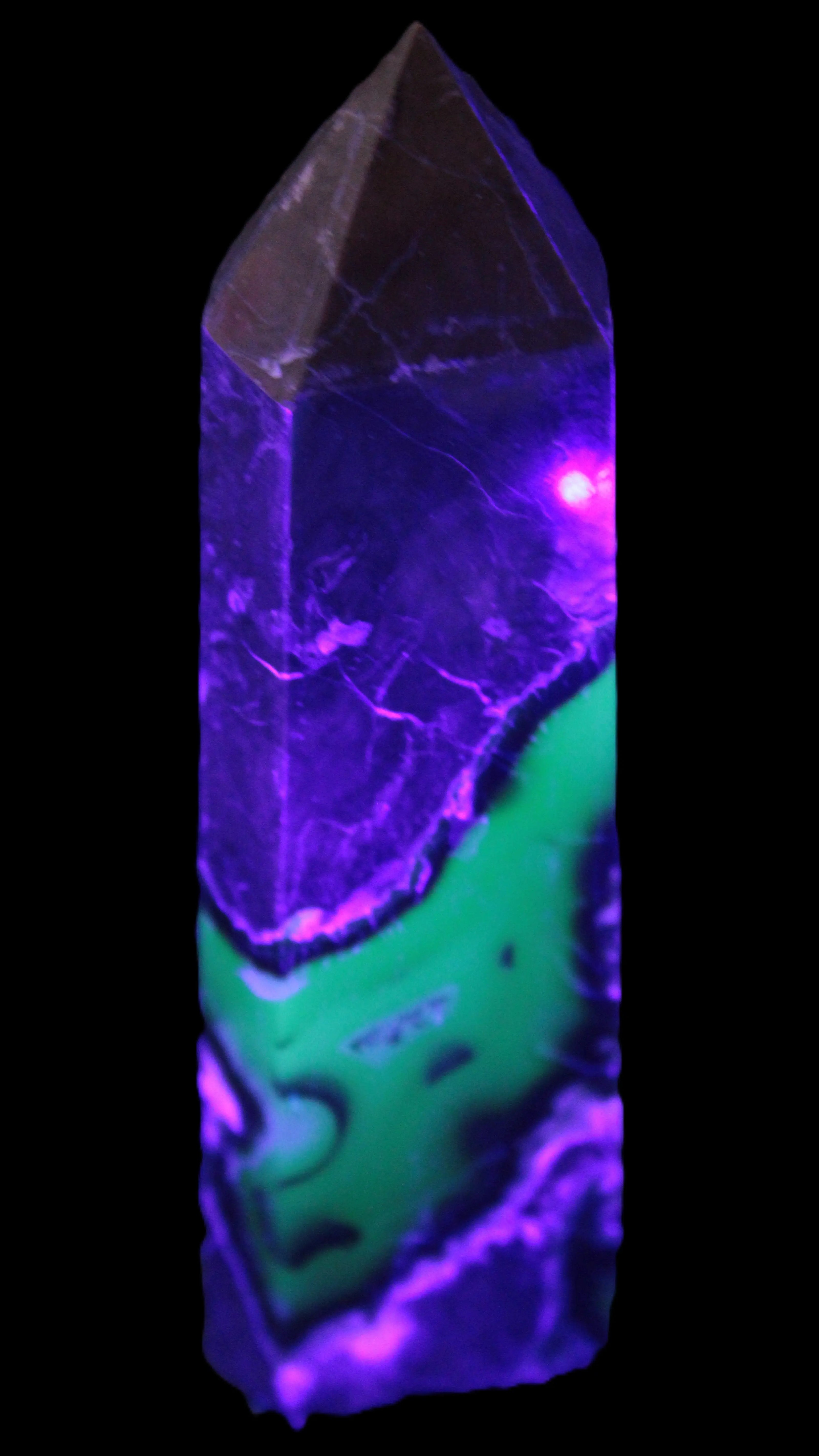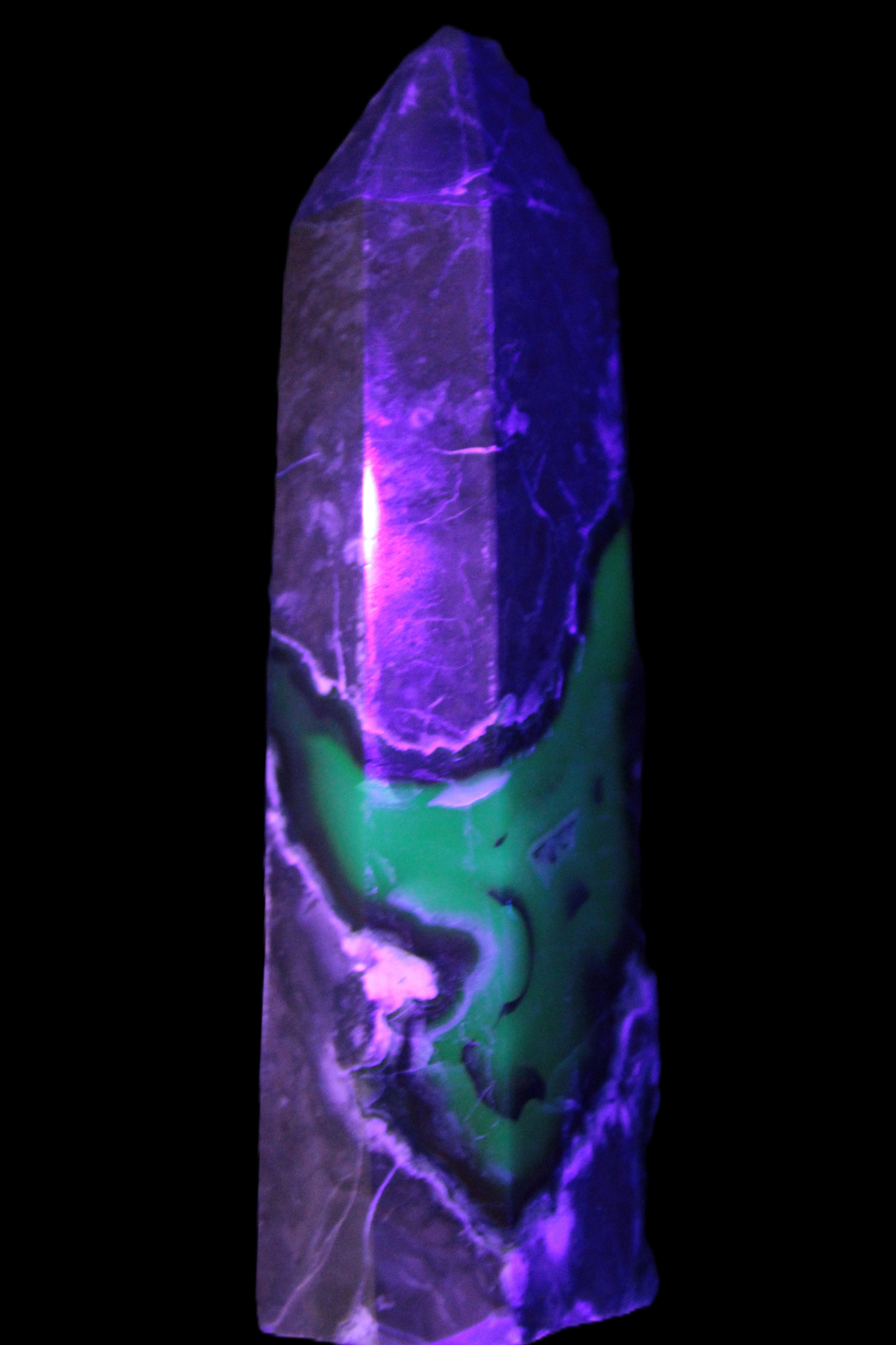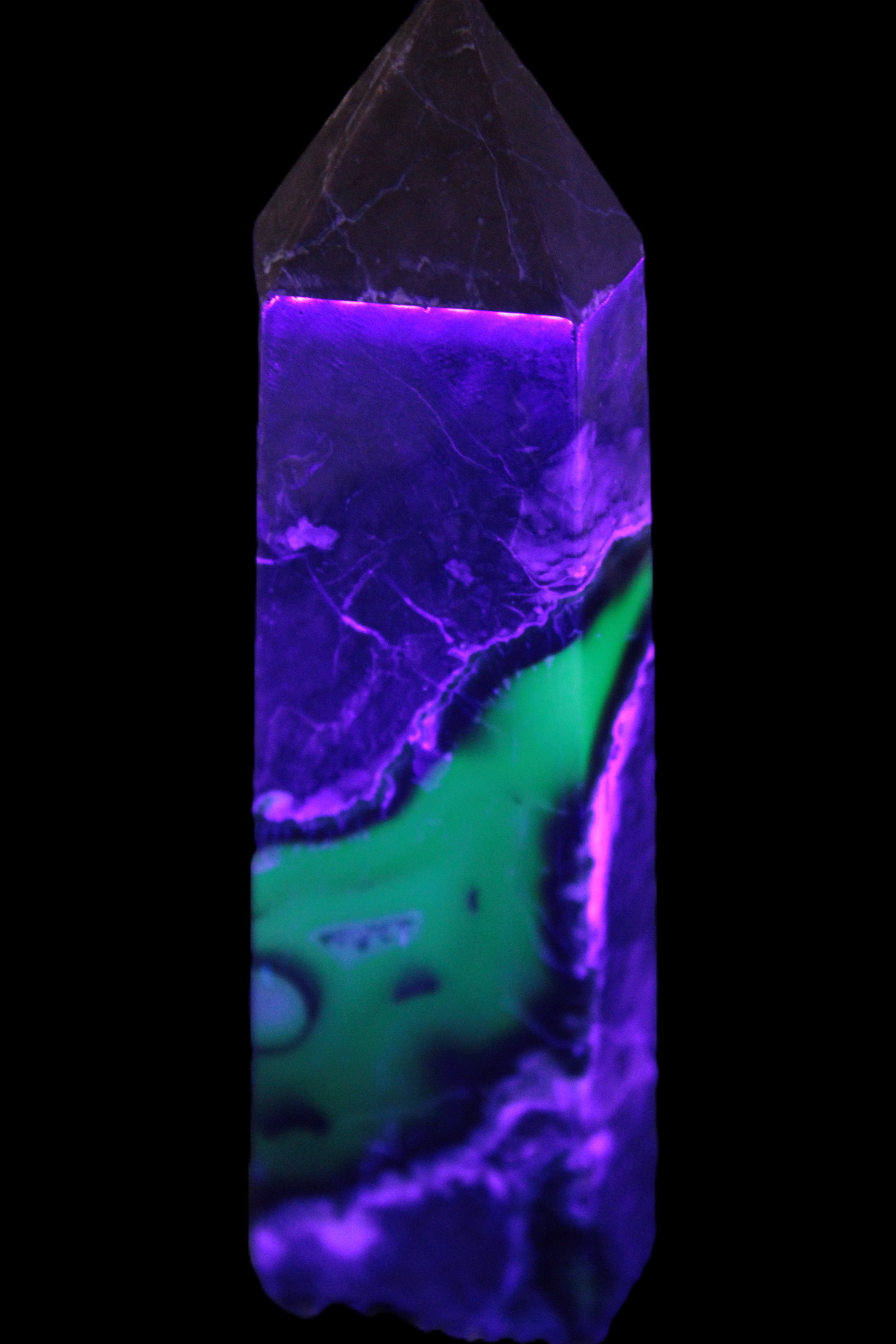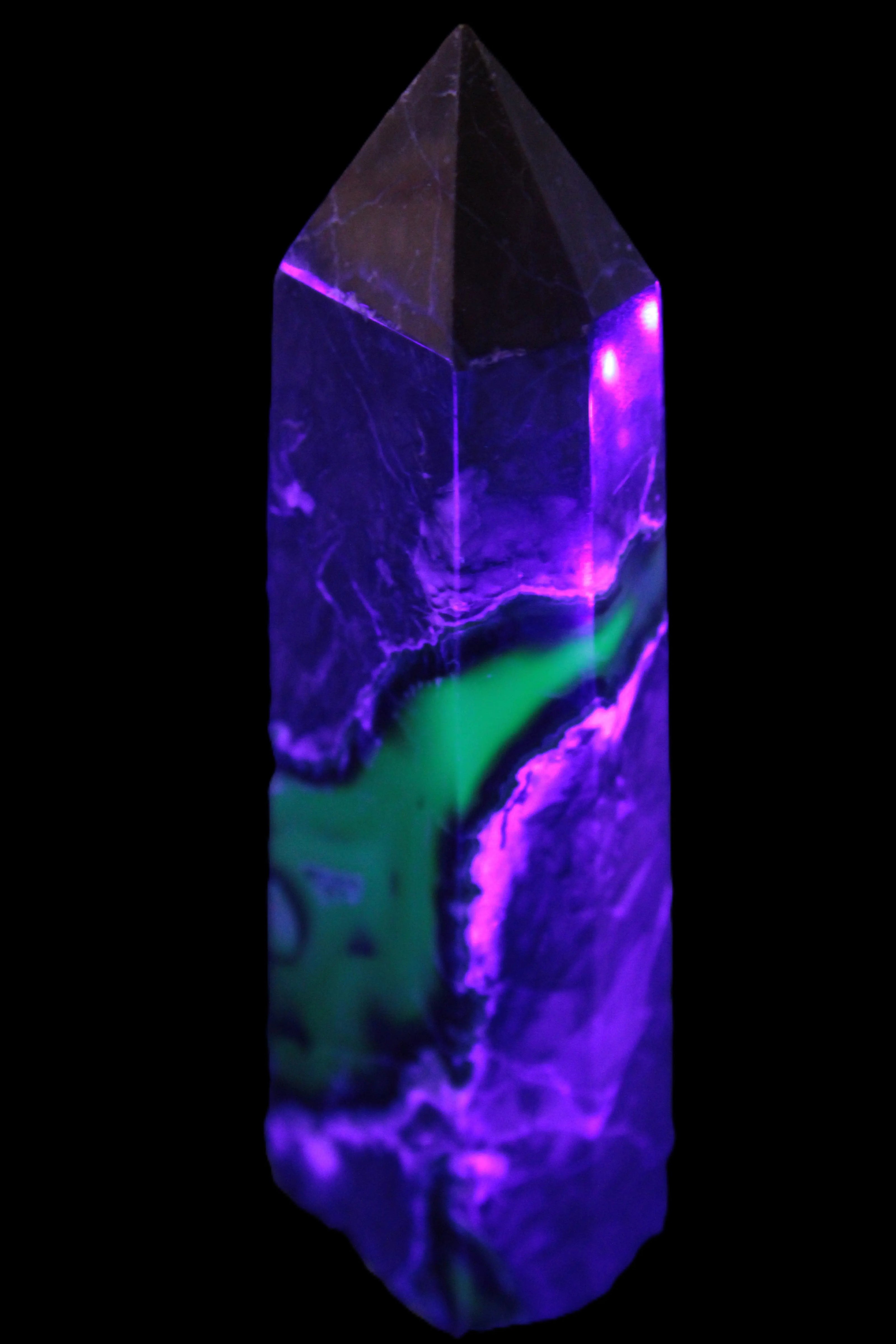 The dark Volcano Agate obelisk has unique patterns and hidden features. Strong colours emerge from the dark stone in reaction to Ultra-Violet light. The strong UV reaction of this Volcano Agate obelisk with vibrant greens is particularly striking. These qualities reflect its origins in volcanic activity and the minerals present in the lava from which the rock formed. This has resulted in its striking appearance with banding and inclusions of other minerals.