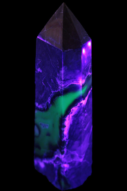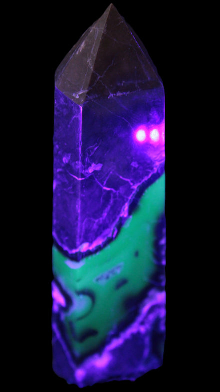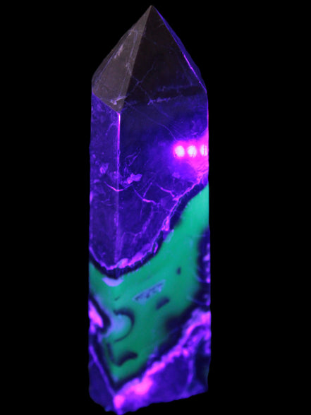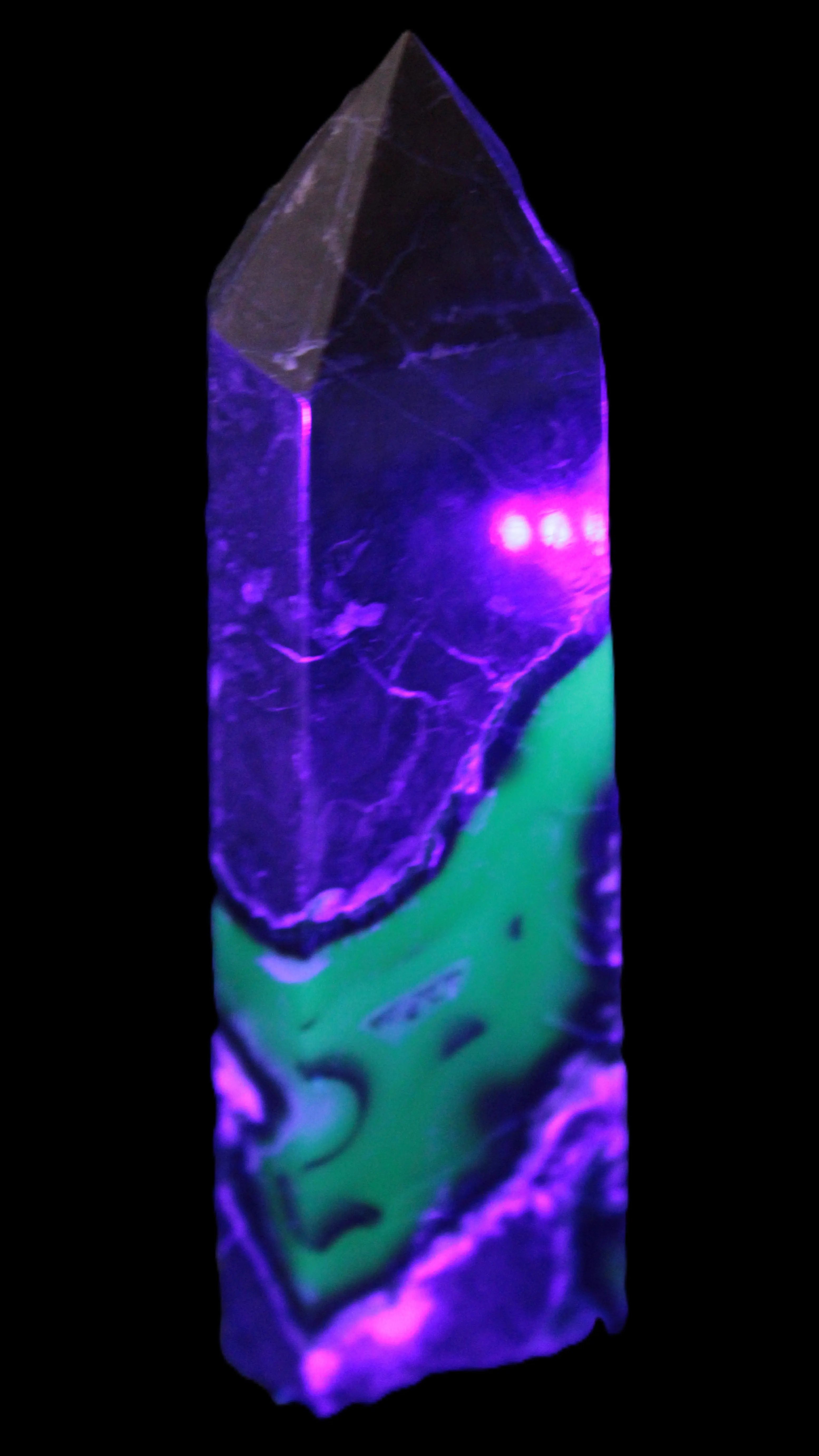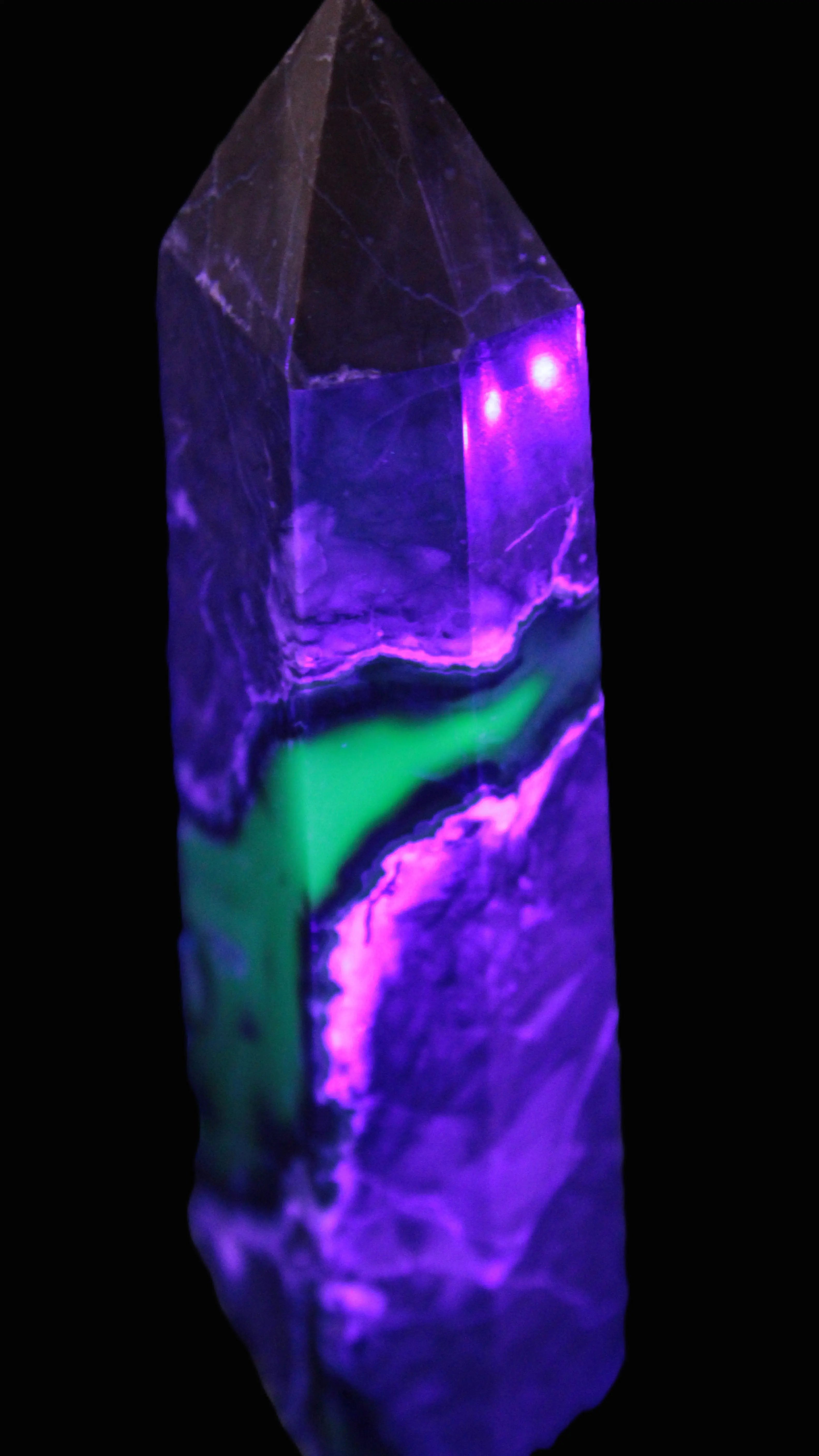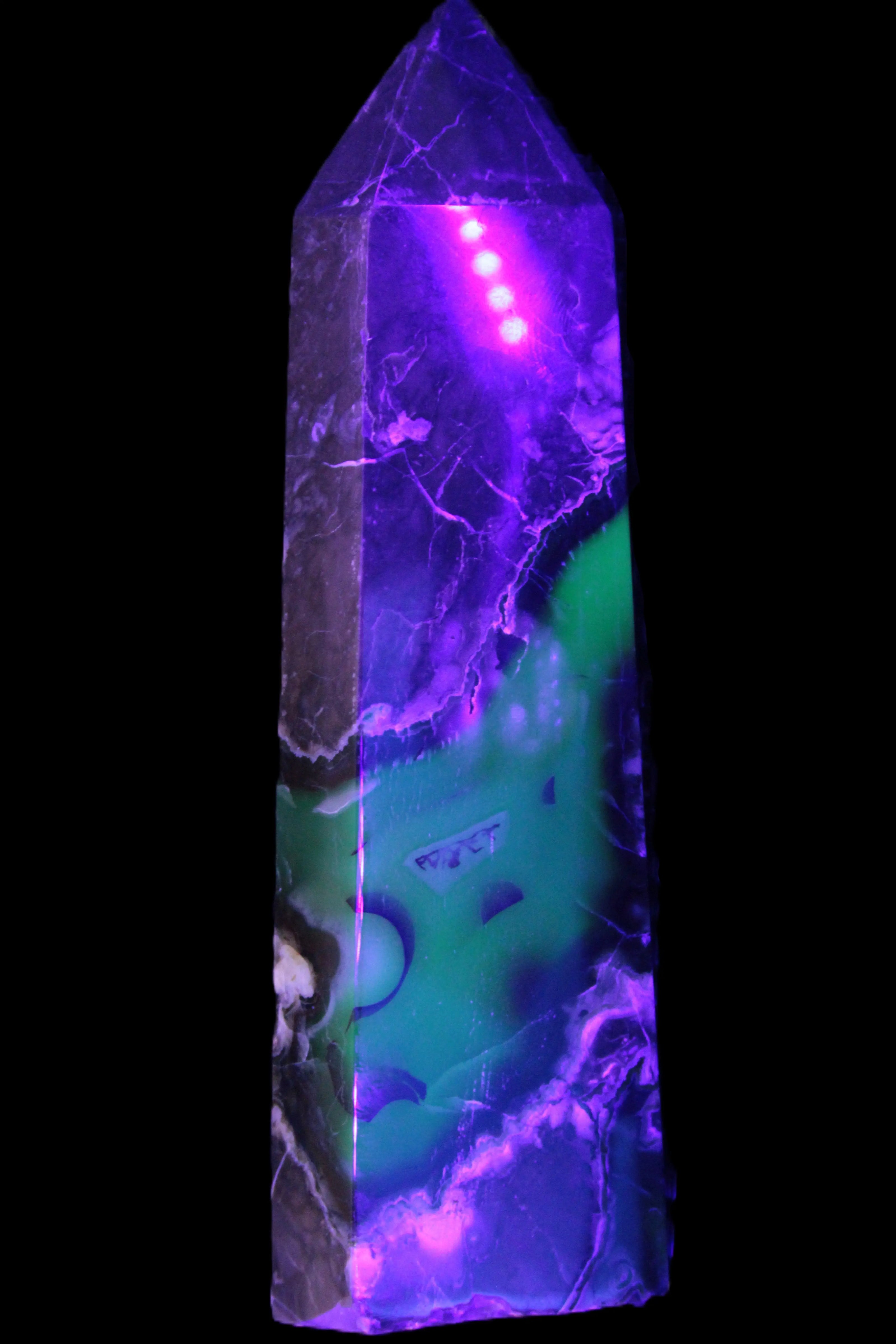 The dark Volcano Agate obelisk has unique patterns and hidden features. Strong colours emerge from the dark stone in reaction to Ultra-Violet light. The strong UV reaction of this Volcano Agate obelisk with vibrant greens is particularly striking. These qualities reflect its origins in volcanic activity and the minerals present in the lava from which the rock formed. This has resulted in its striking appearance with banding and inclusions of other minerals.