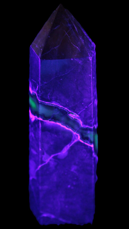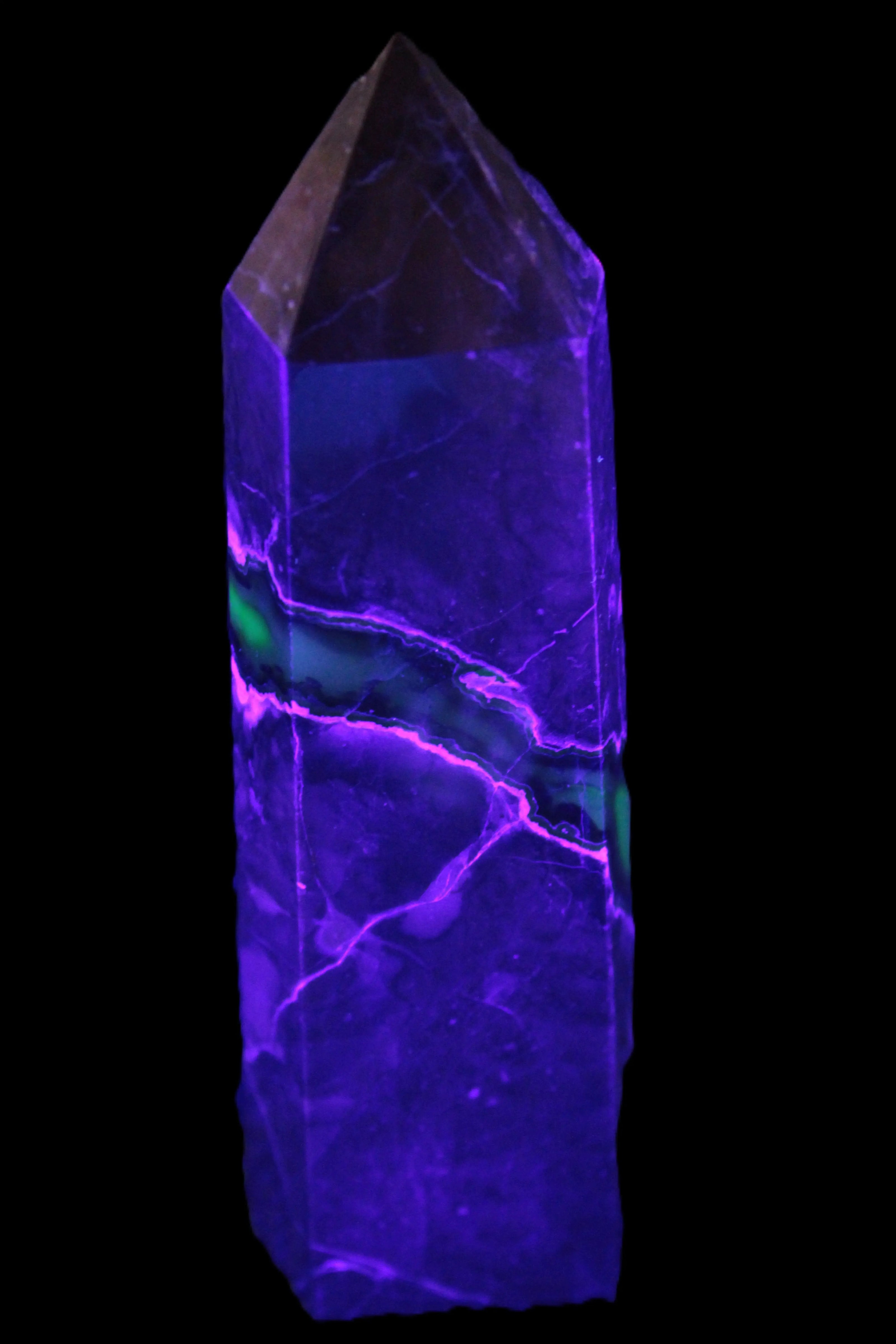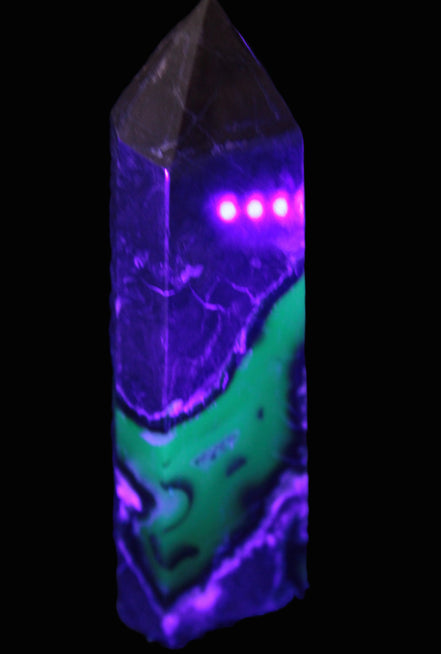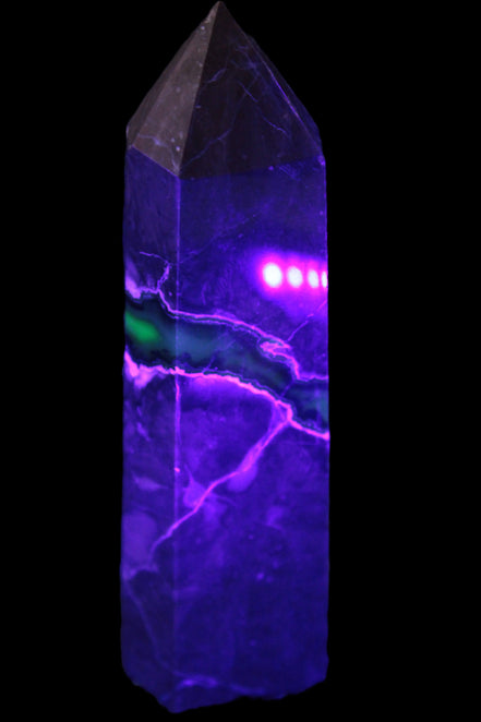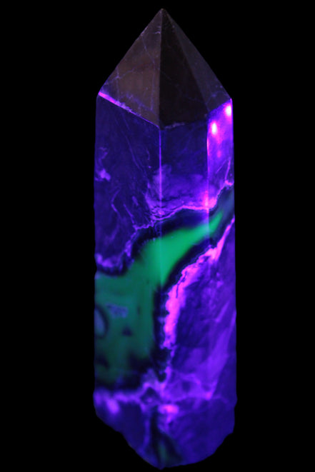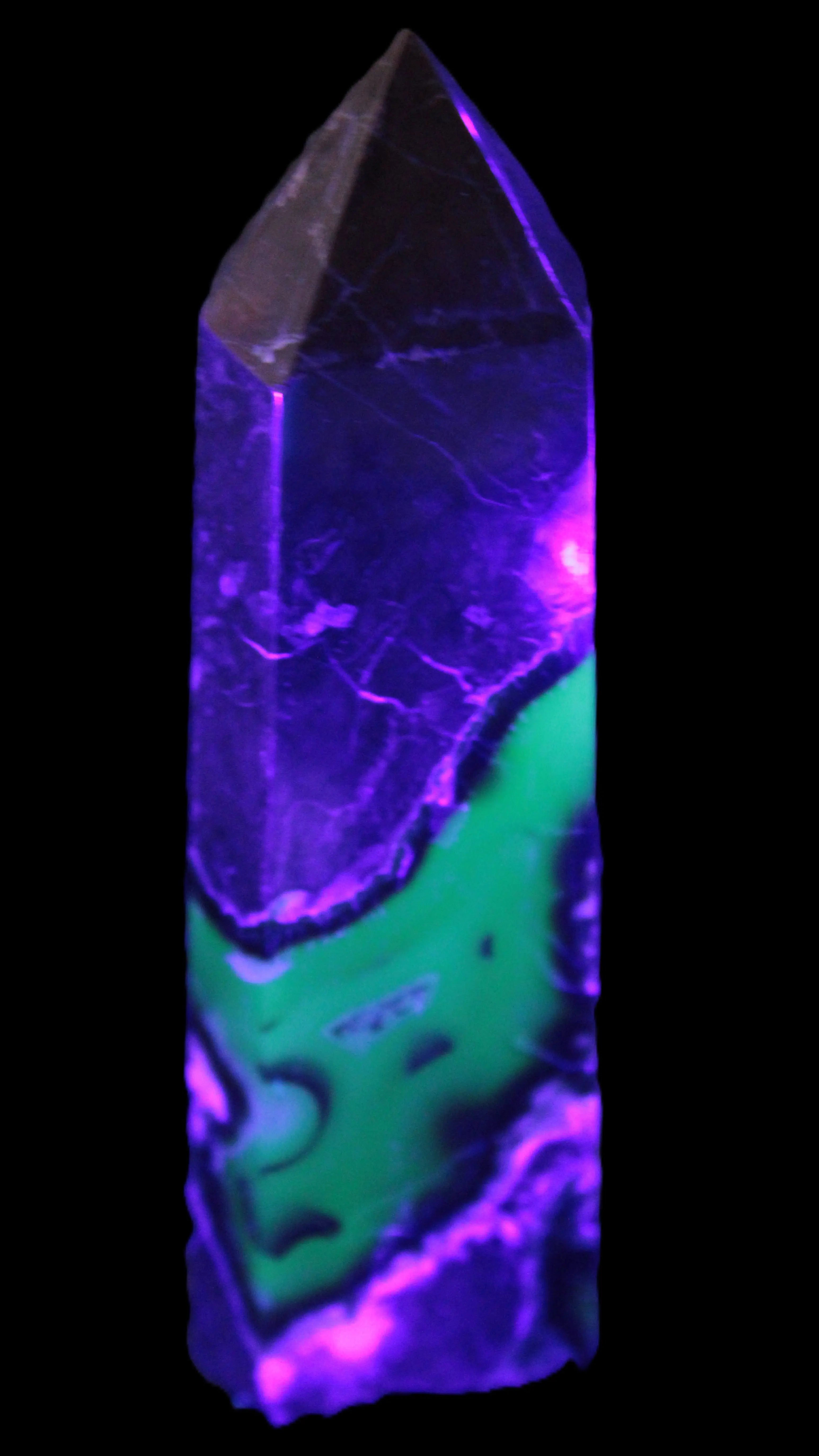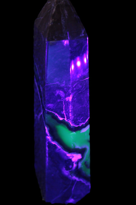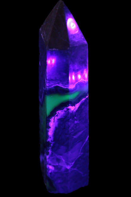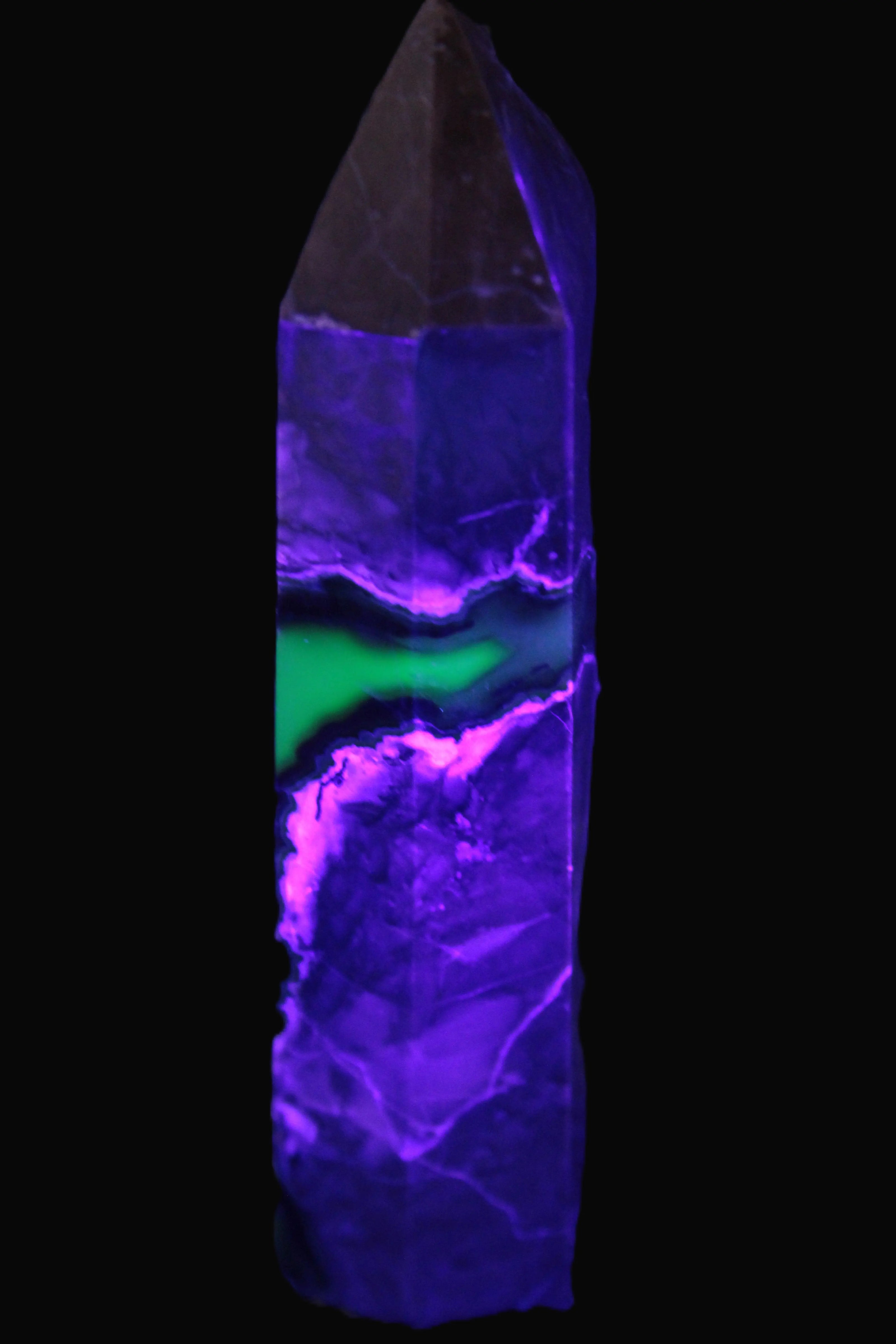 The dark Volcano Agate obelisk has unique patterns and hidden features. Strong colours emerge from the dark stone in reaction to Ultra-Violet light. The strong UV reaction of this Volcano Agate obelisk with vibrant greens is particularly striking. These qualities reflect its origins in volcanic activity and the minerals present in the lava from which the rock formed. This has resulted in its striking appearance with banding and inclusions of other minerals.
