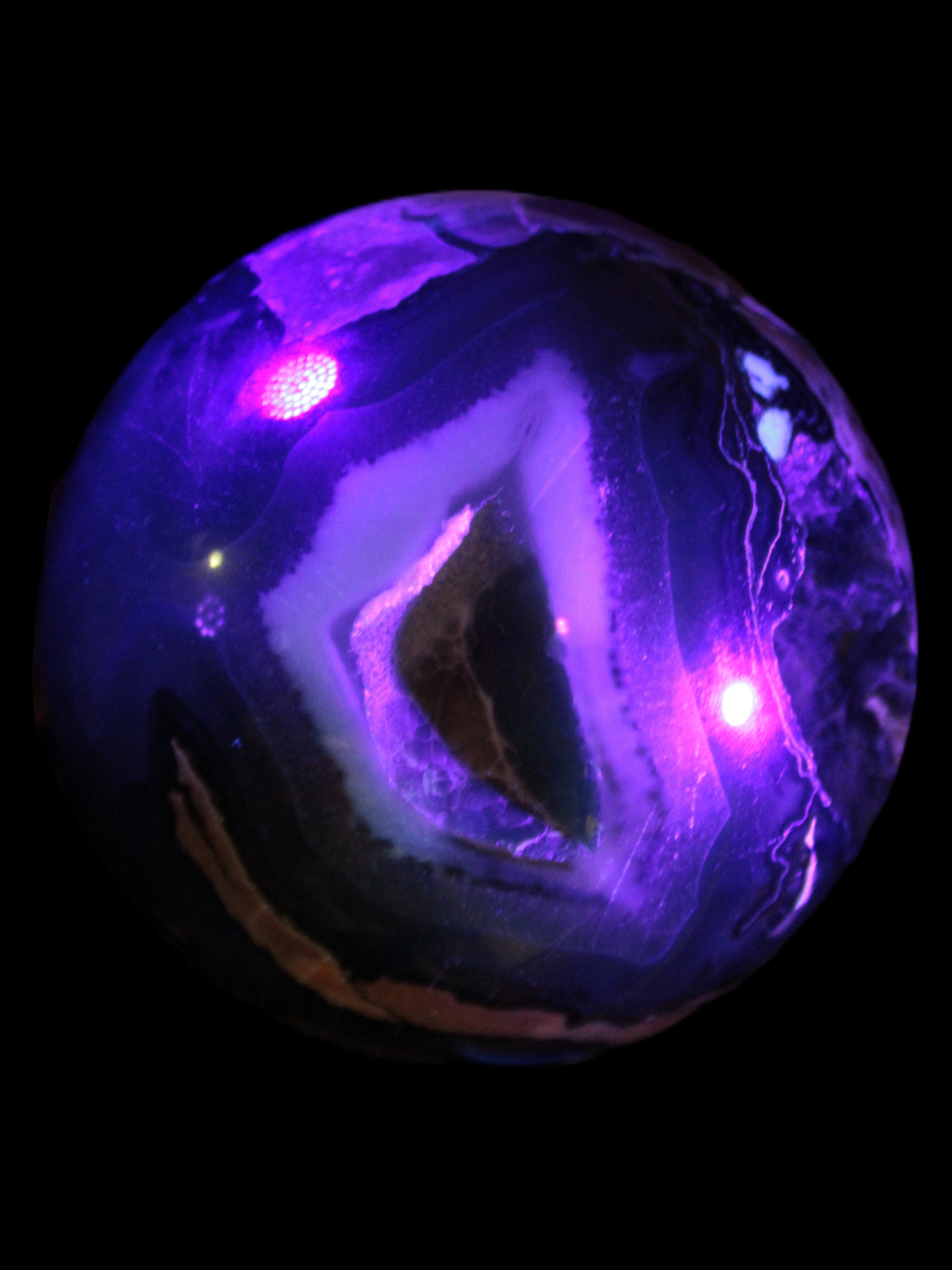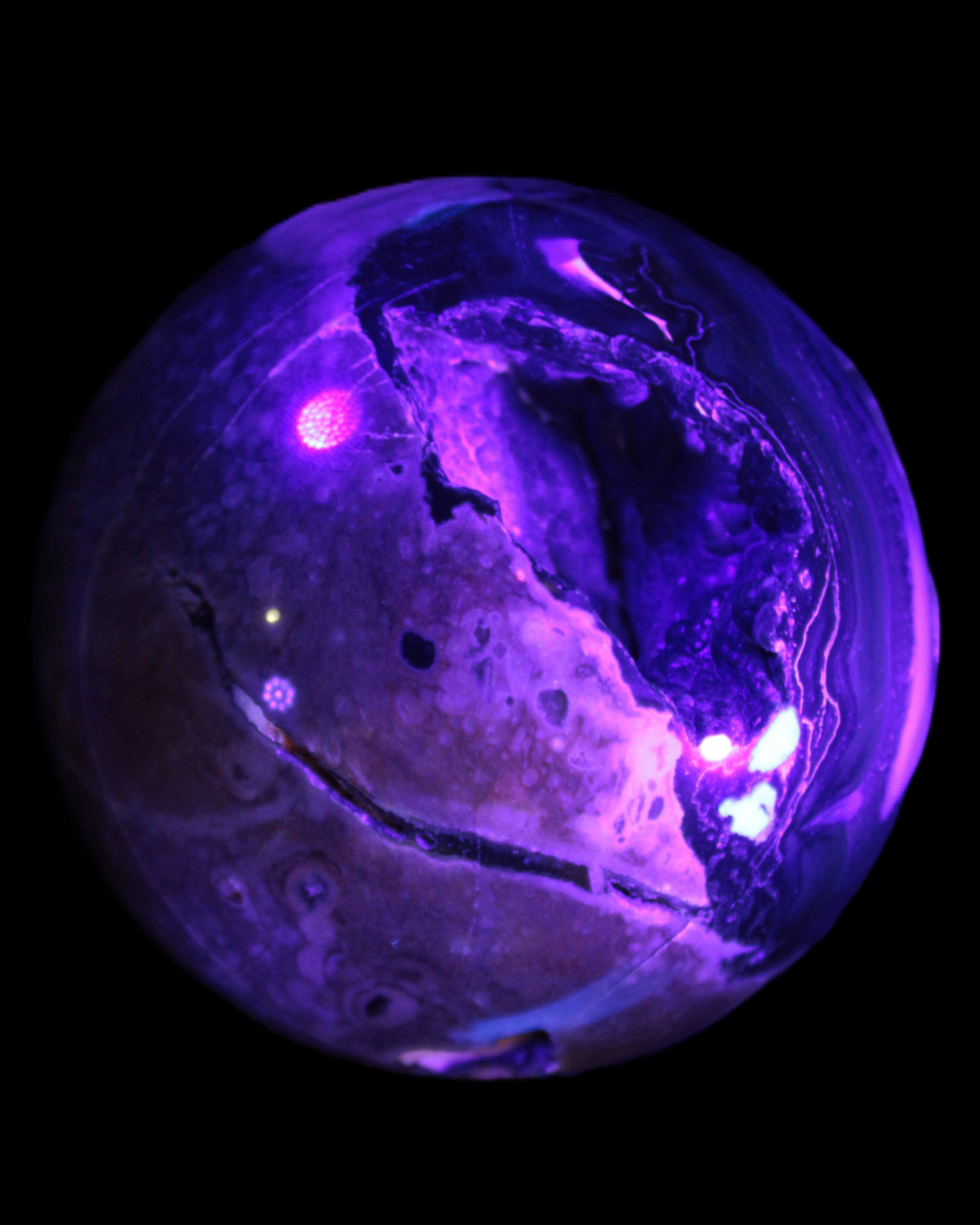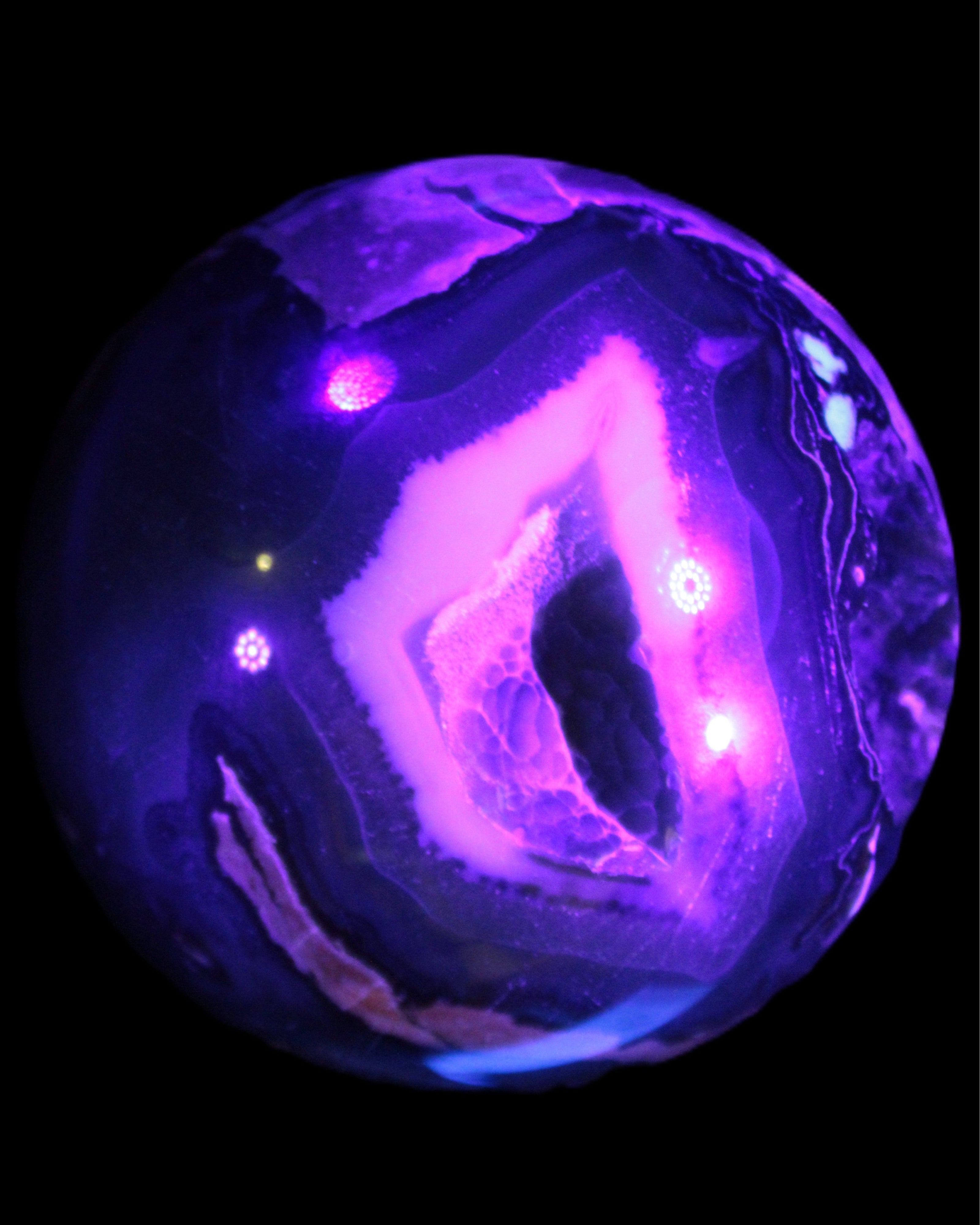 Its unique patterns and striking appearance are due to its volcanic formation and the minerals present in the lava from which the rock formed. It also gives it a show of colours in both natural light and UV light that reflect its fiery origins.