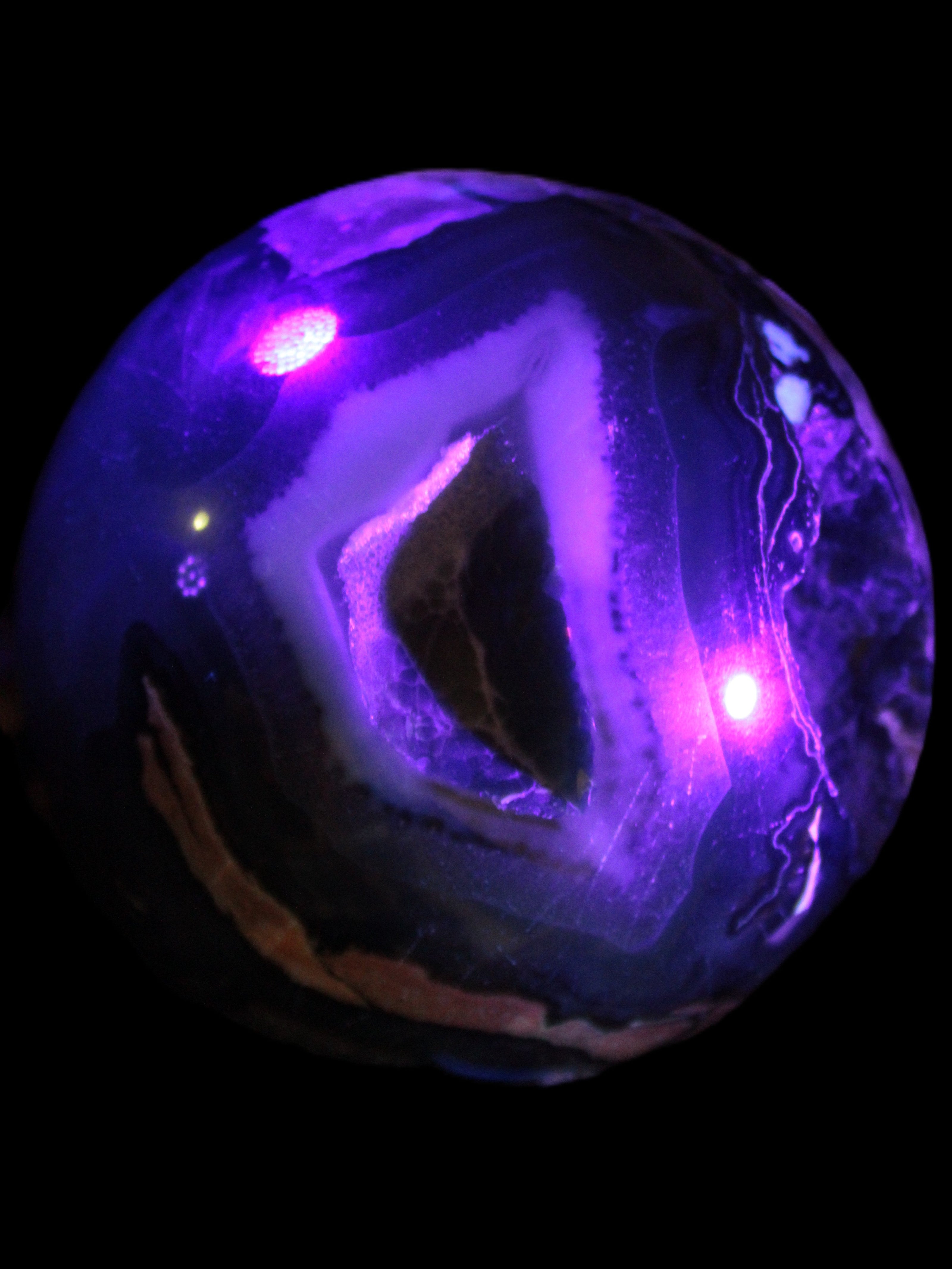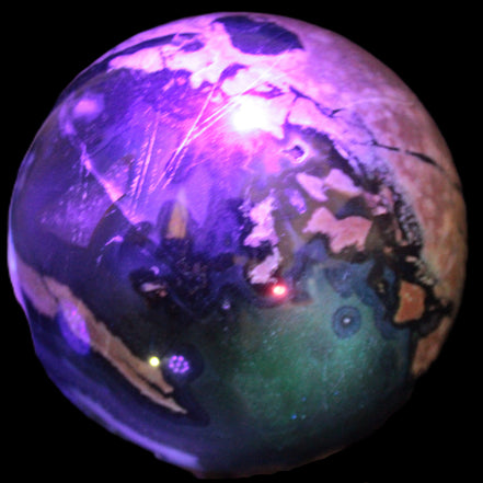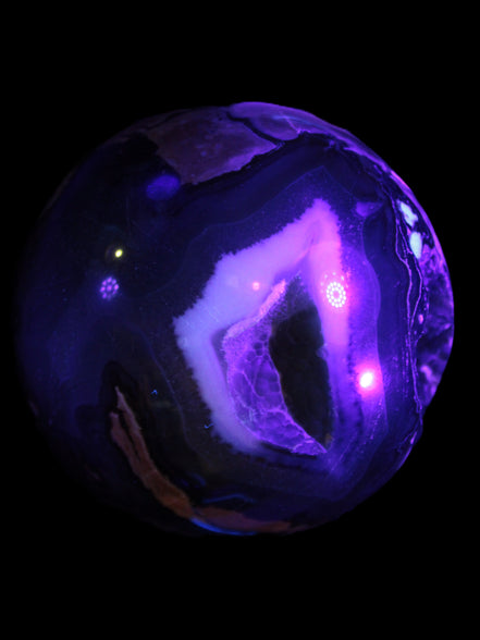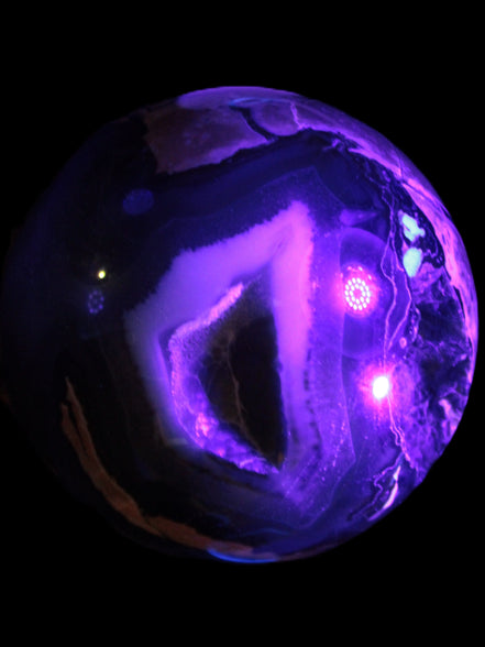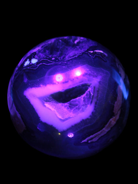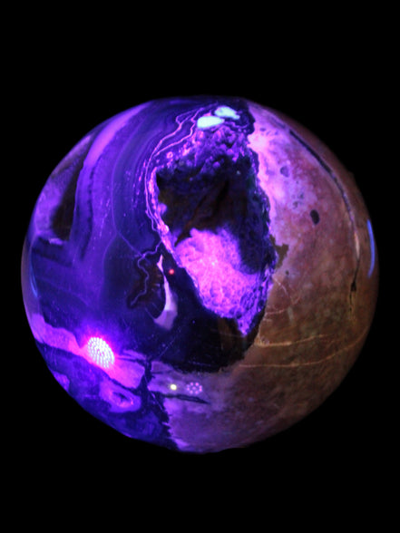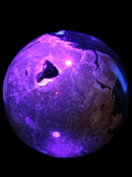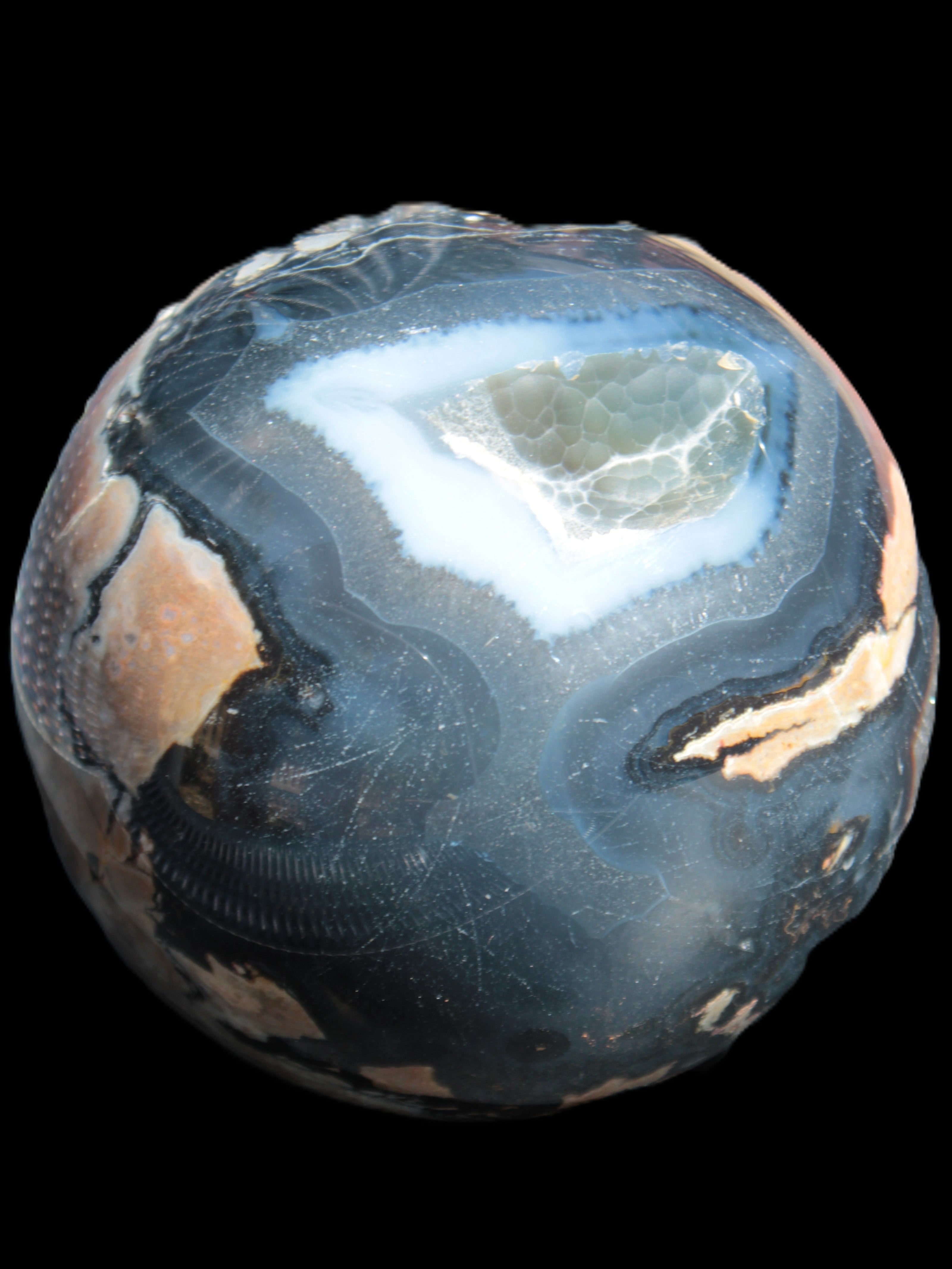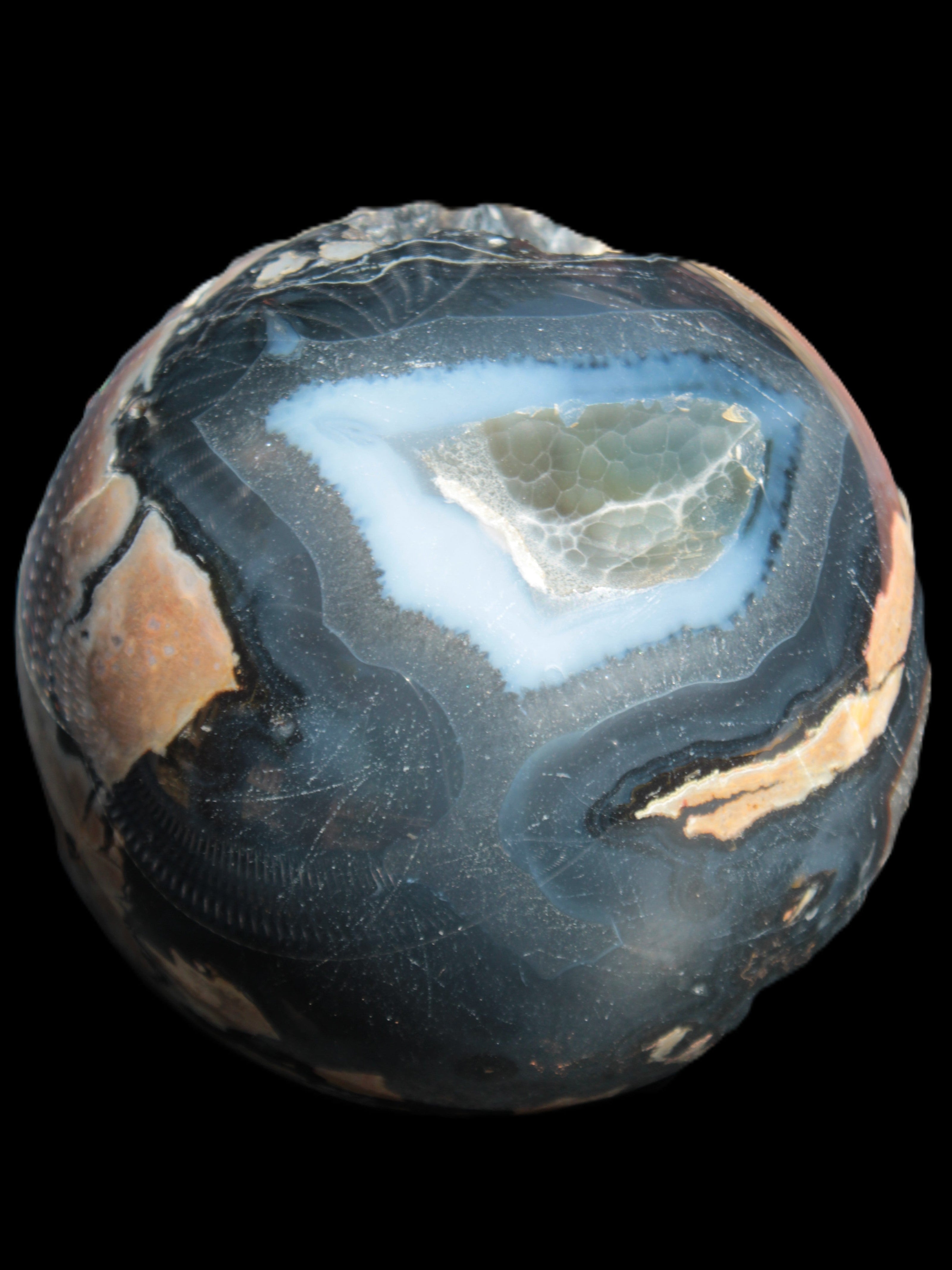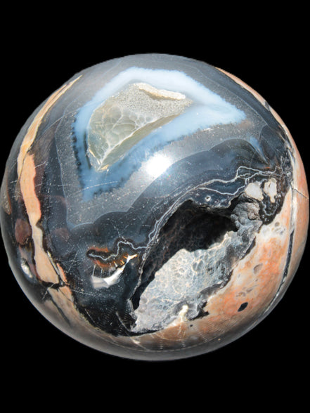 This big Volcano Agate sphere 119mm weighs 2167g. This Volcano Agate was formed in a volcanic environment. This formation gives it features that differ from more common agates, which formed in more sedate metamorphic rock.