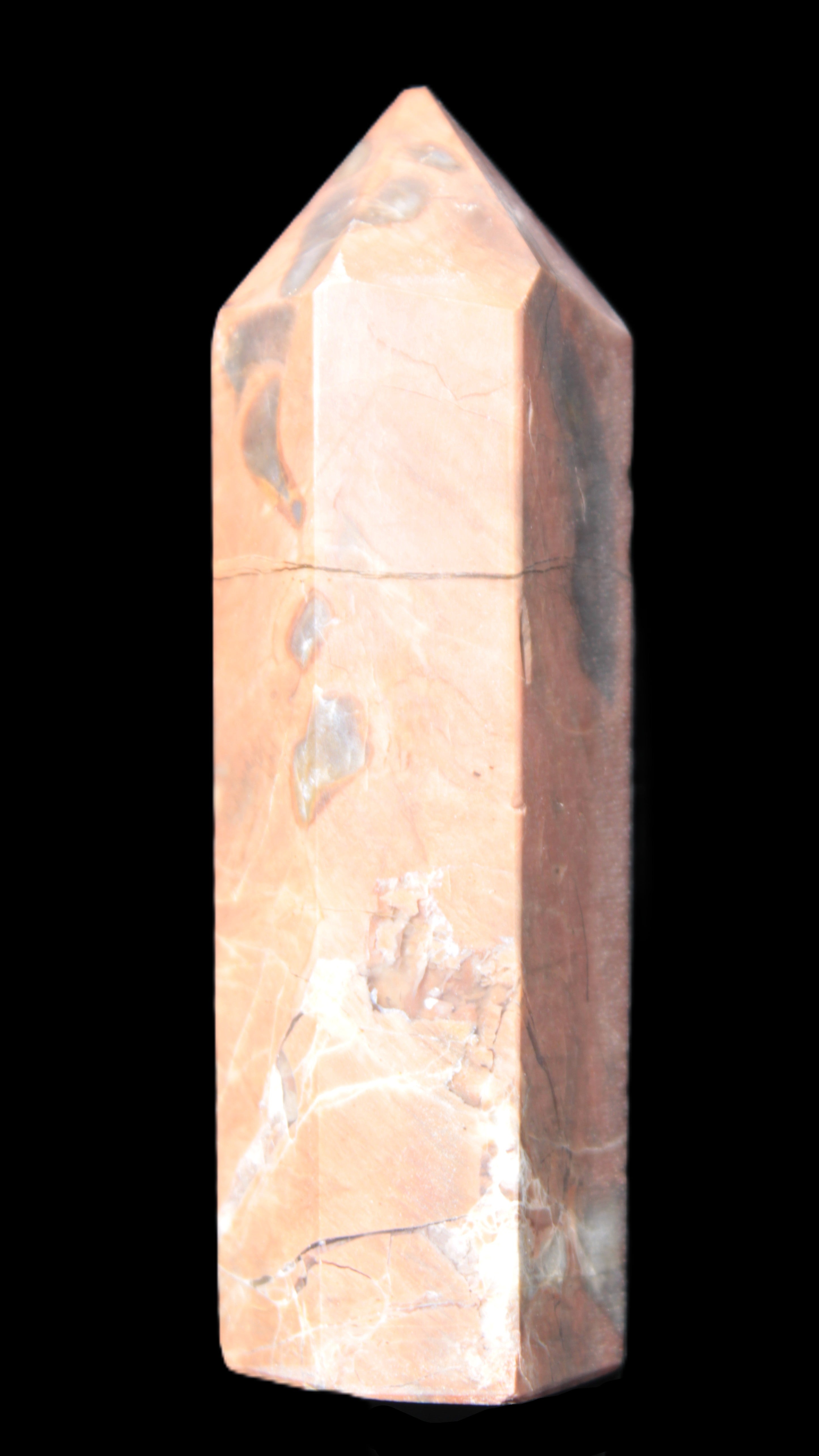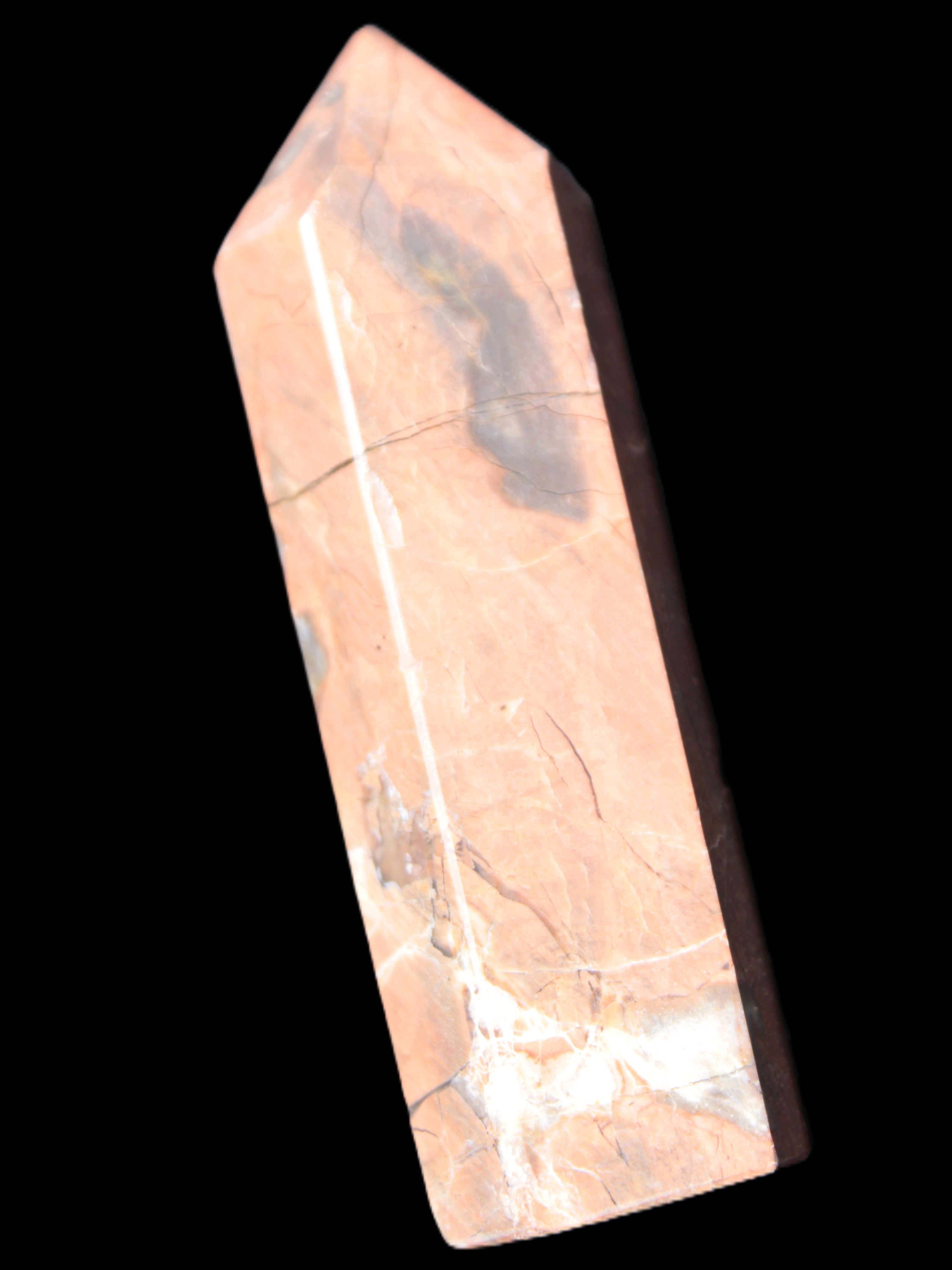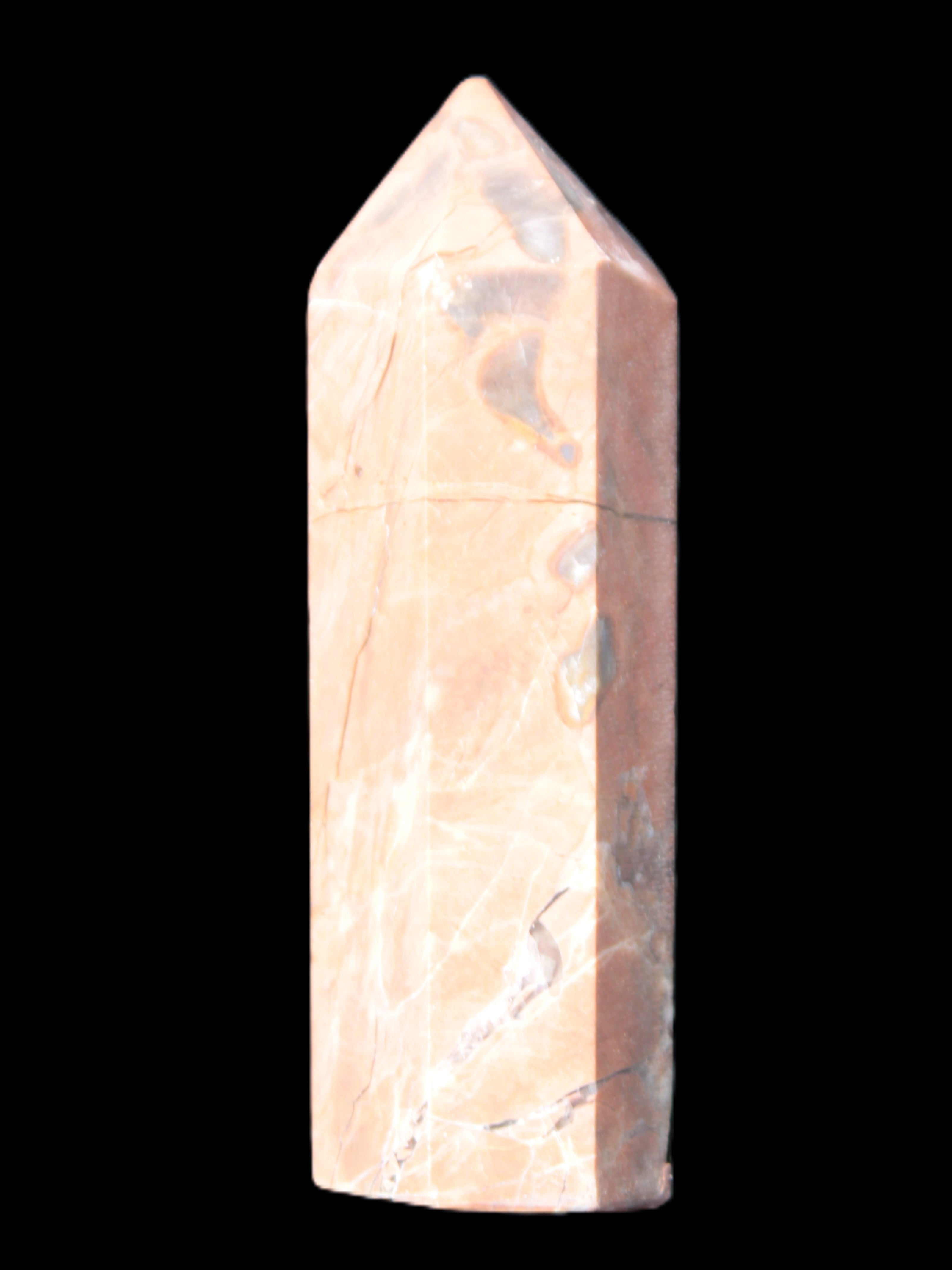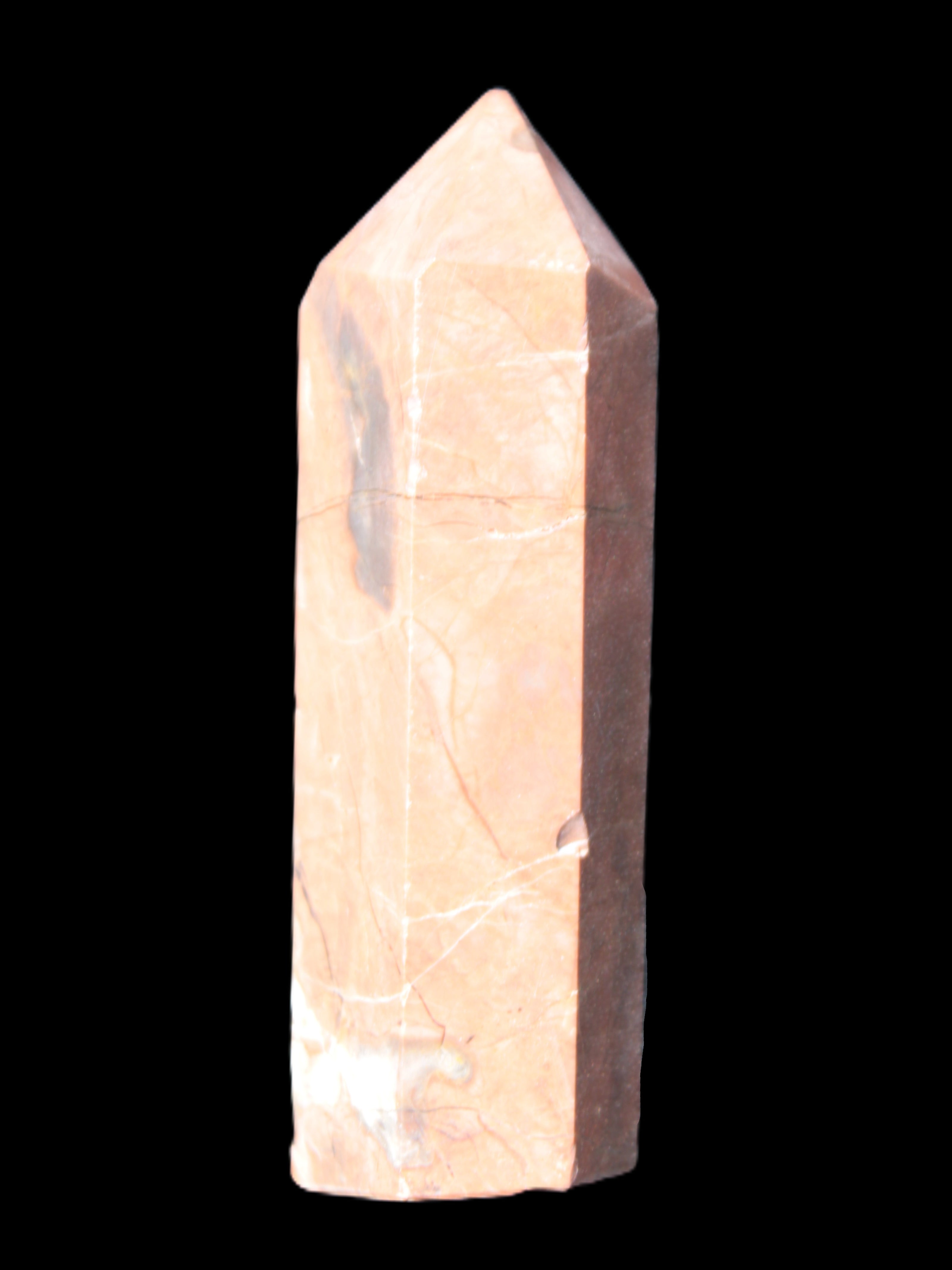 This Volcano Agate obelisk 242g was born in a volcano. forming within a cavity or crevice in the cooling volcanic rocks. This birthplace gives it features that differ from agates that formed in metamorphic or sedimentary rock. One such feature is its reaction to UV light. This fascinating wand is 22 mm wide at the base and stands 80mm tall.