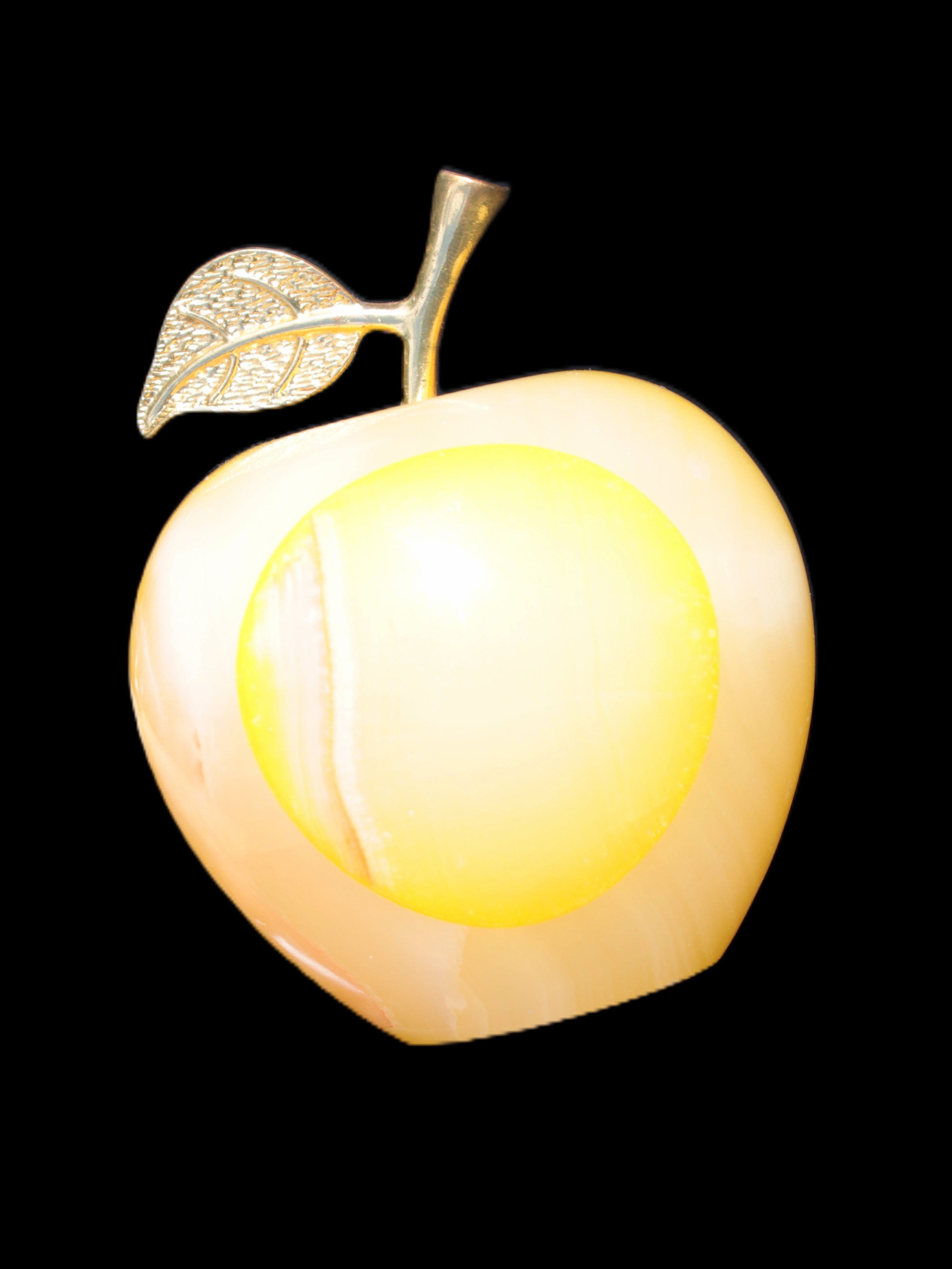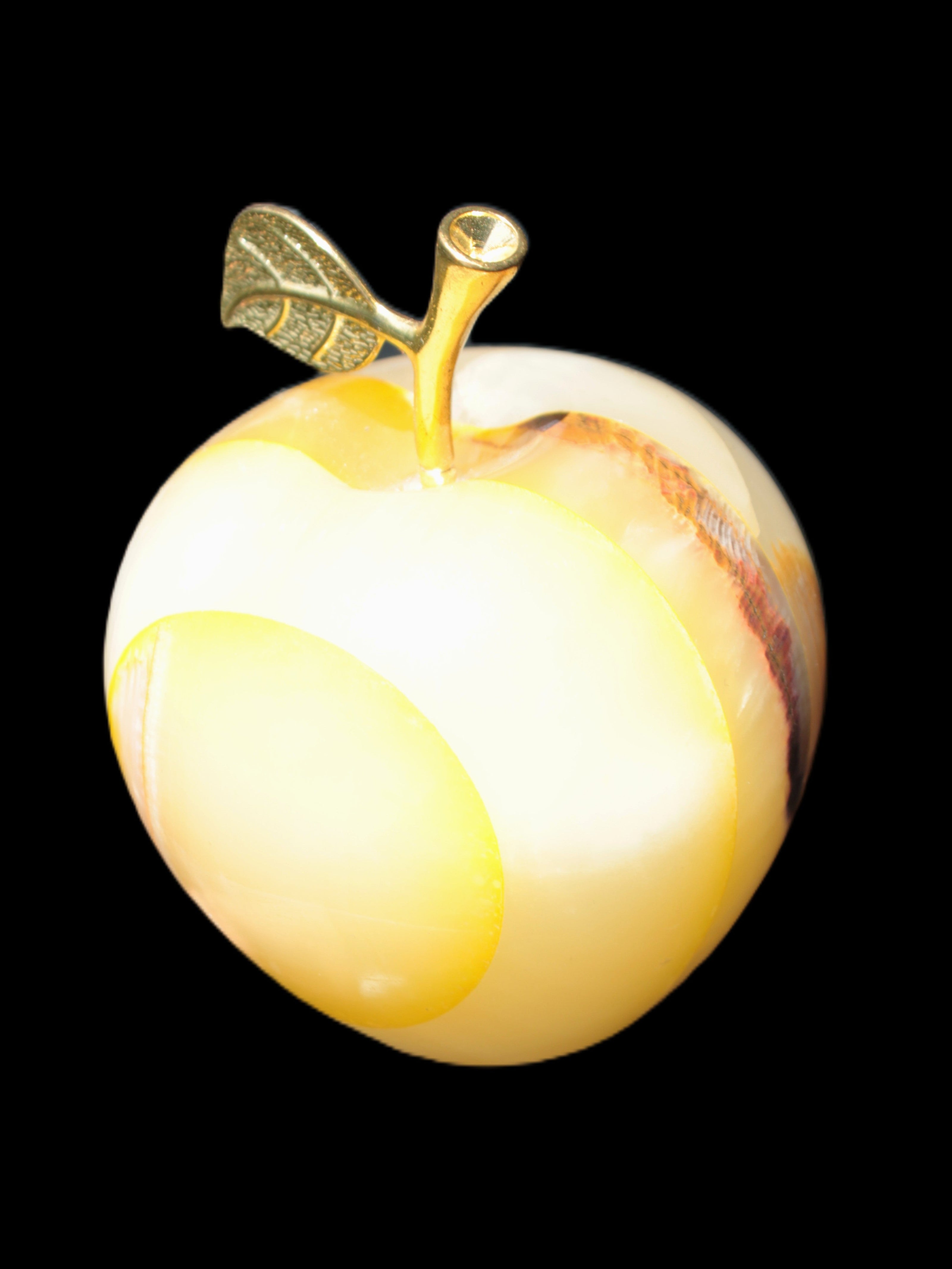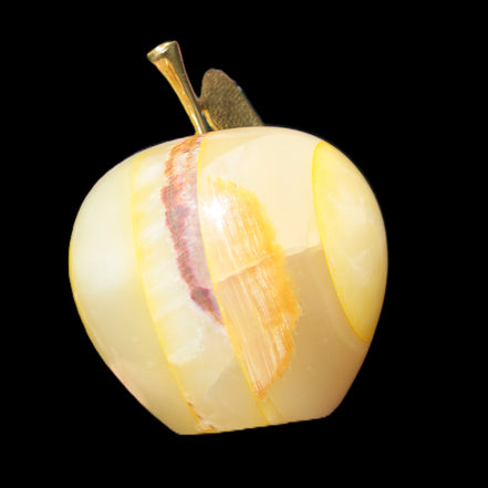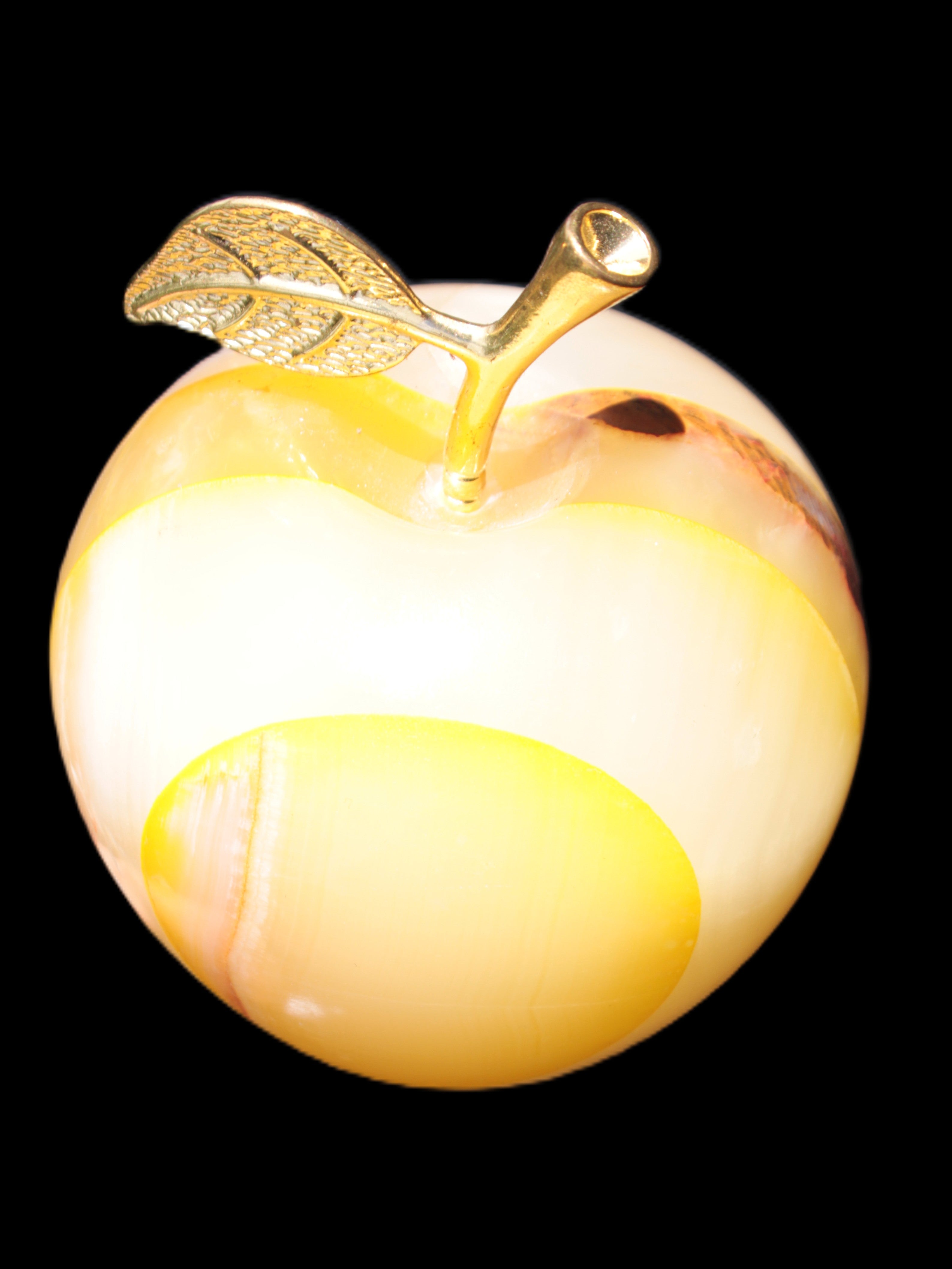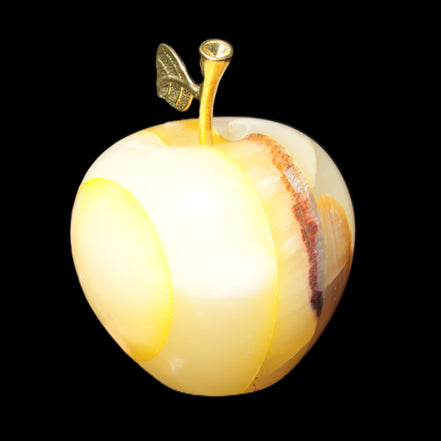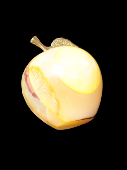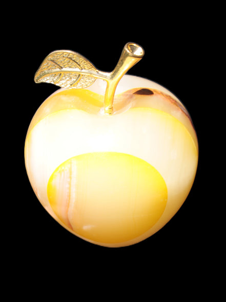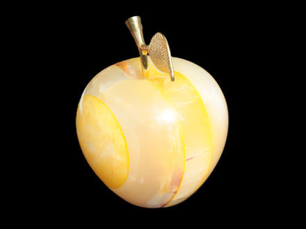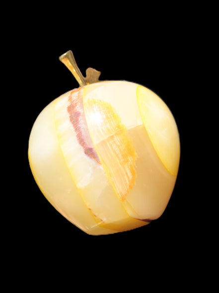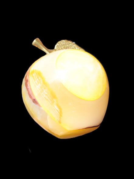 This Yellow Afghan Jade Onyx hand-carved Apple 70*90mm weighs 570g. It has been sculpted from the translucent Serpentine stone found in Pakistan. This stone is often referred to as Onyx, even though it is not agate. Our partner in Karachi used glued and dyed slices of this stone to carefully style this beautiful stone apple.