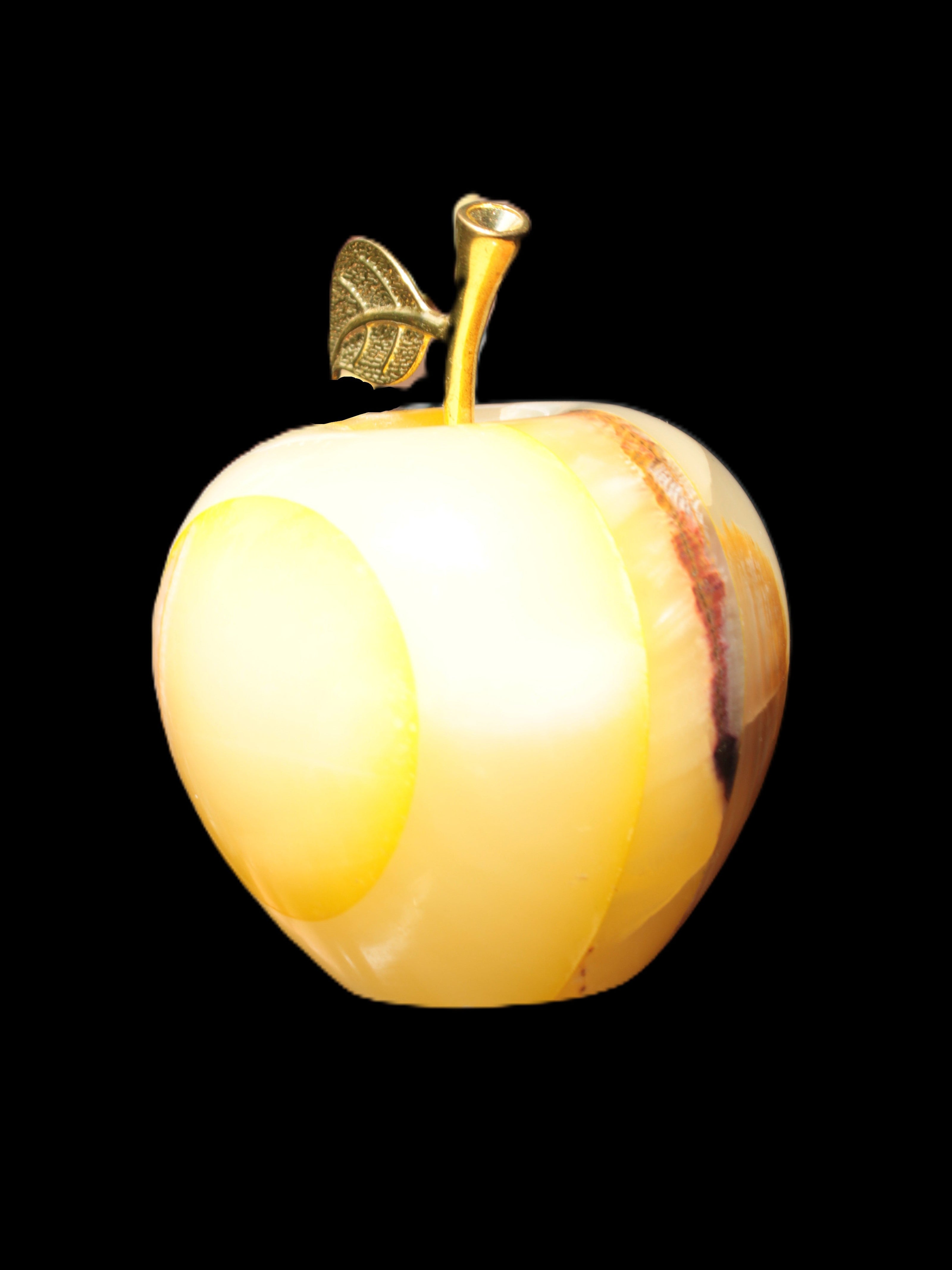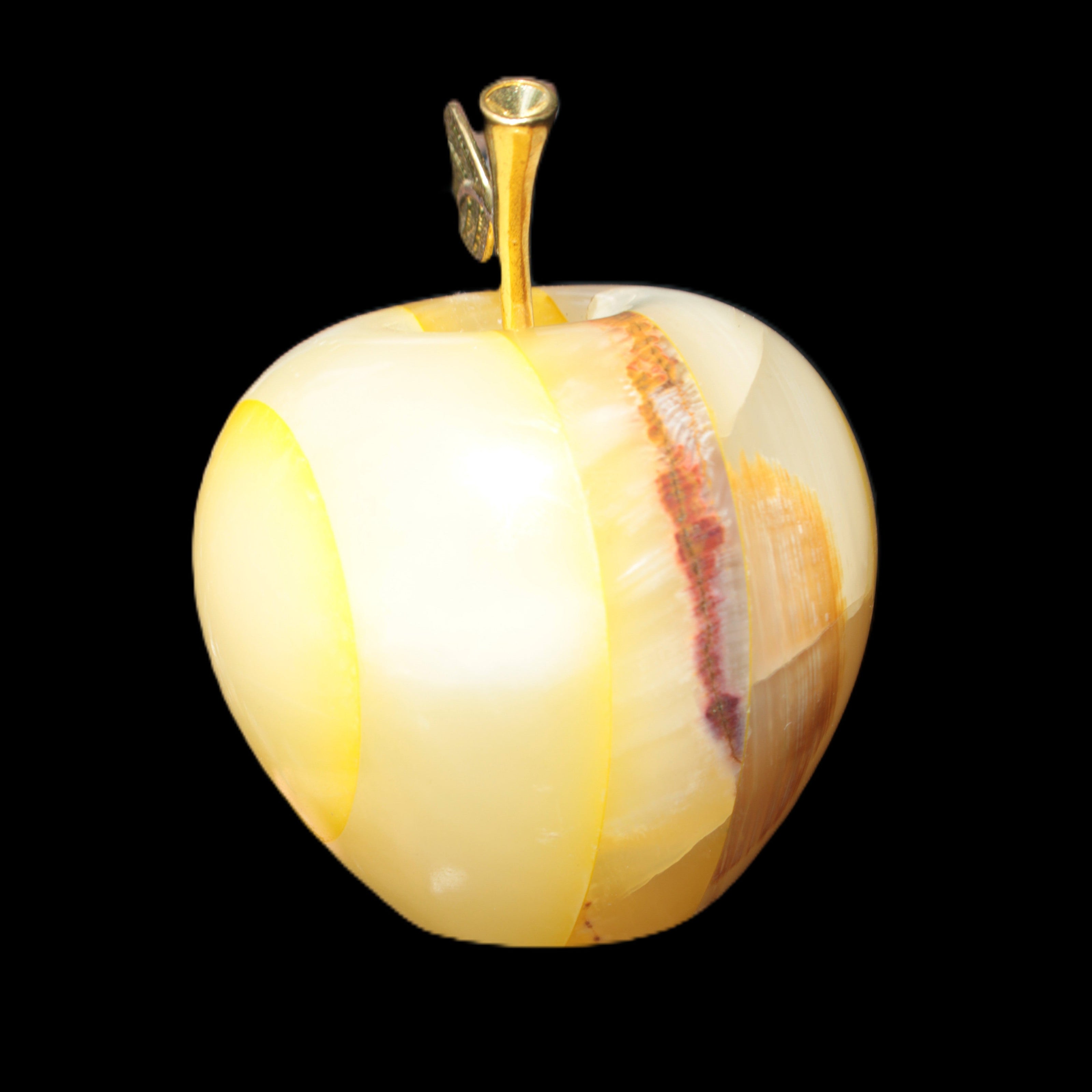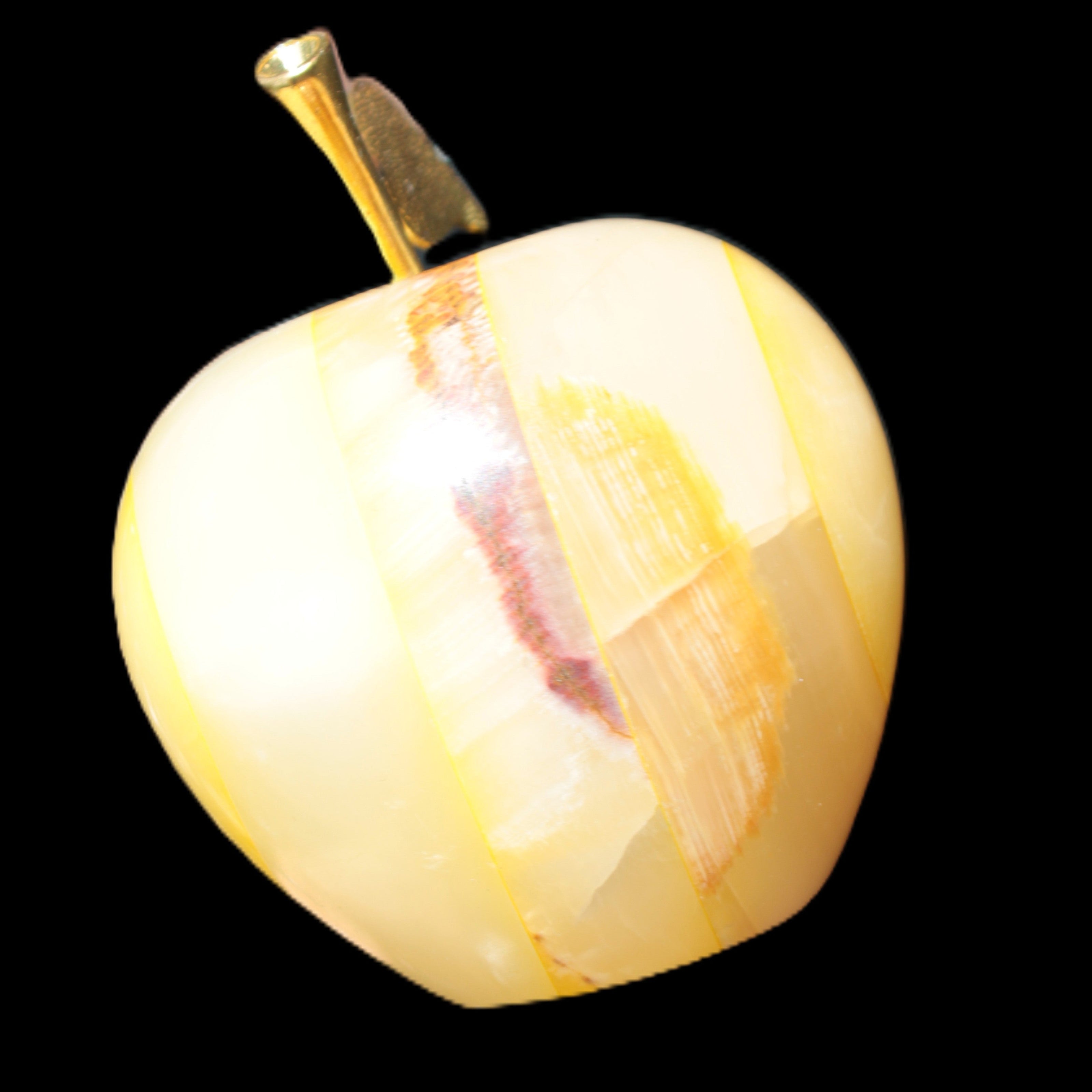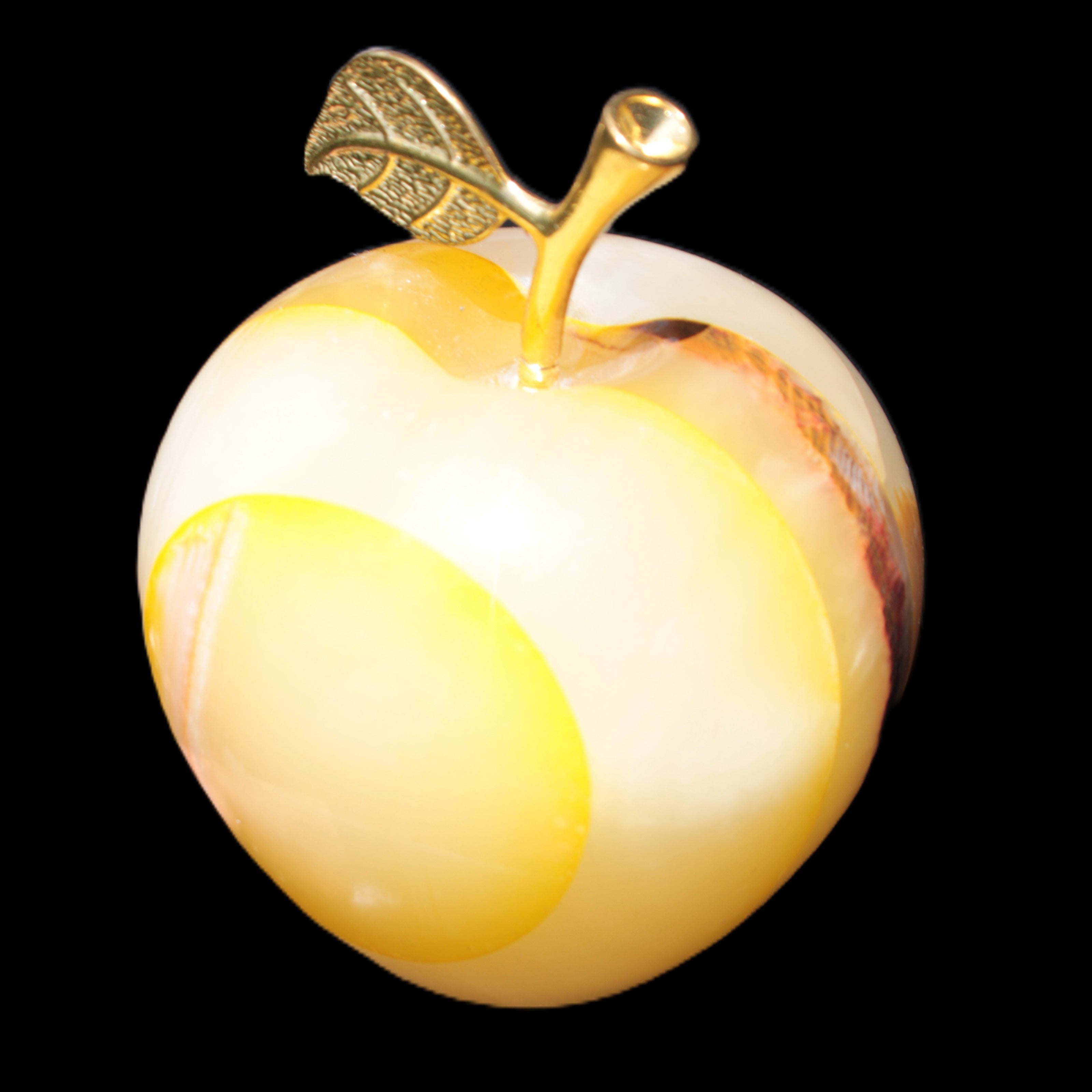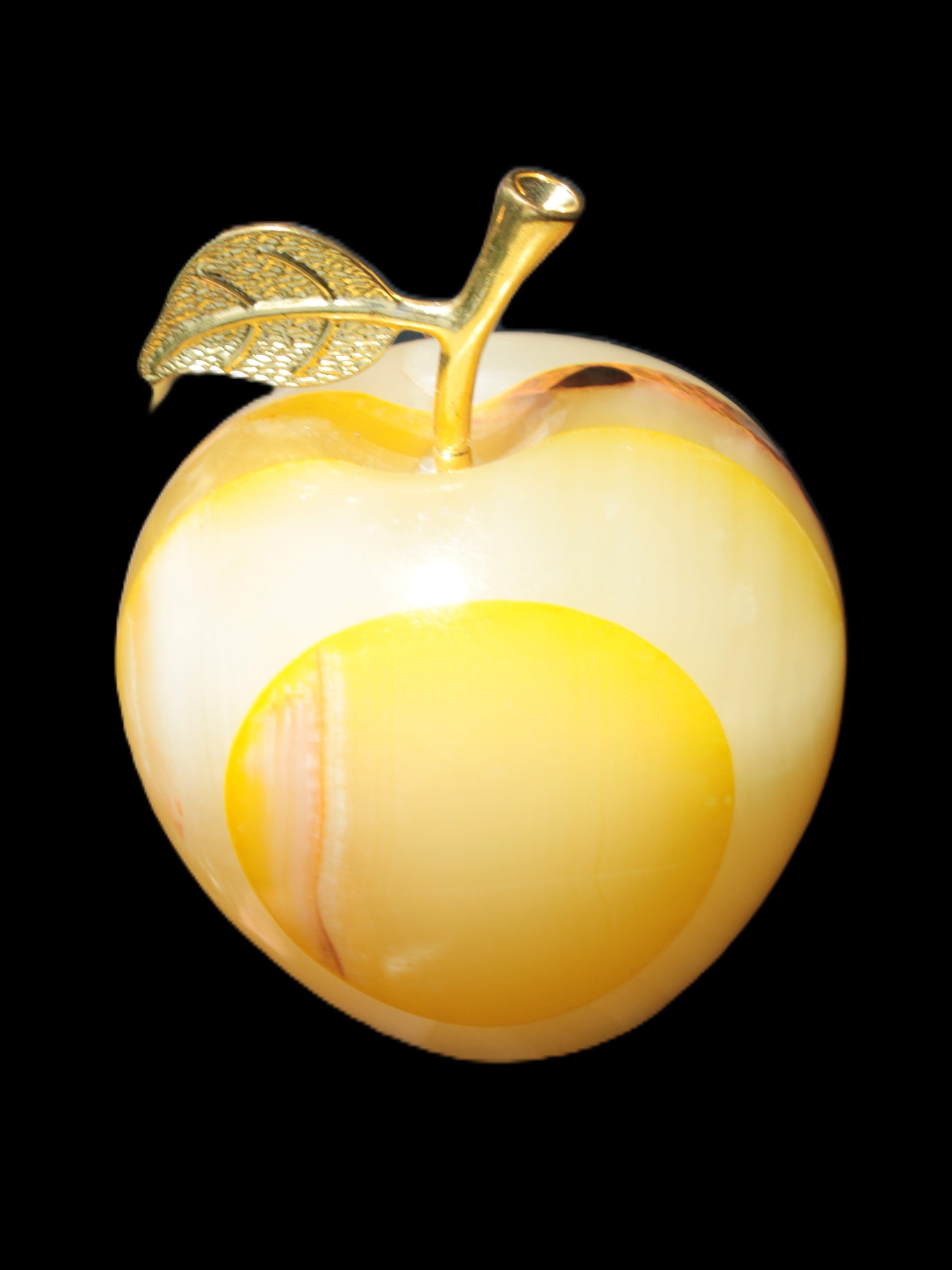 This Yellow Afghan Jade Onyx hand-carved Apple 70*90mm weighs 570g. It has been sculpted from the translucent Serpentine stone found in Pakistan. This stone is often referred to as Onyx, even though it is not agate. Our partner in Karachi used glued and dyed slices of this stone to carefully style this beautiful stone apple.