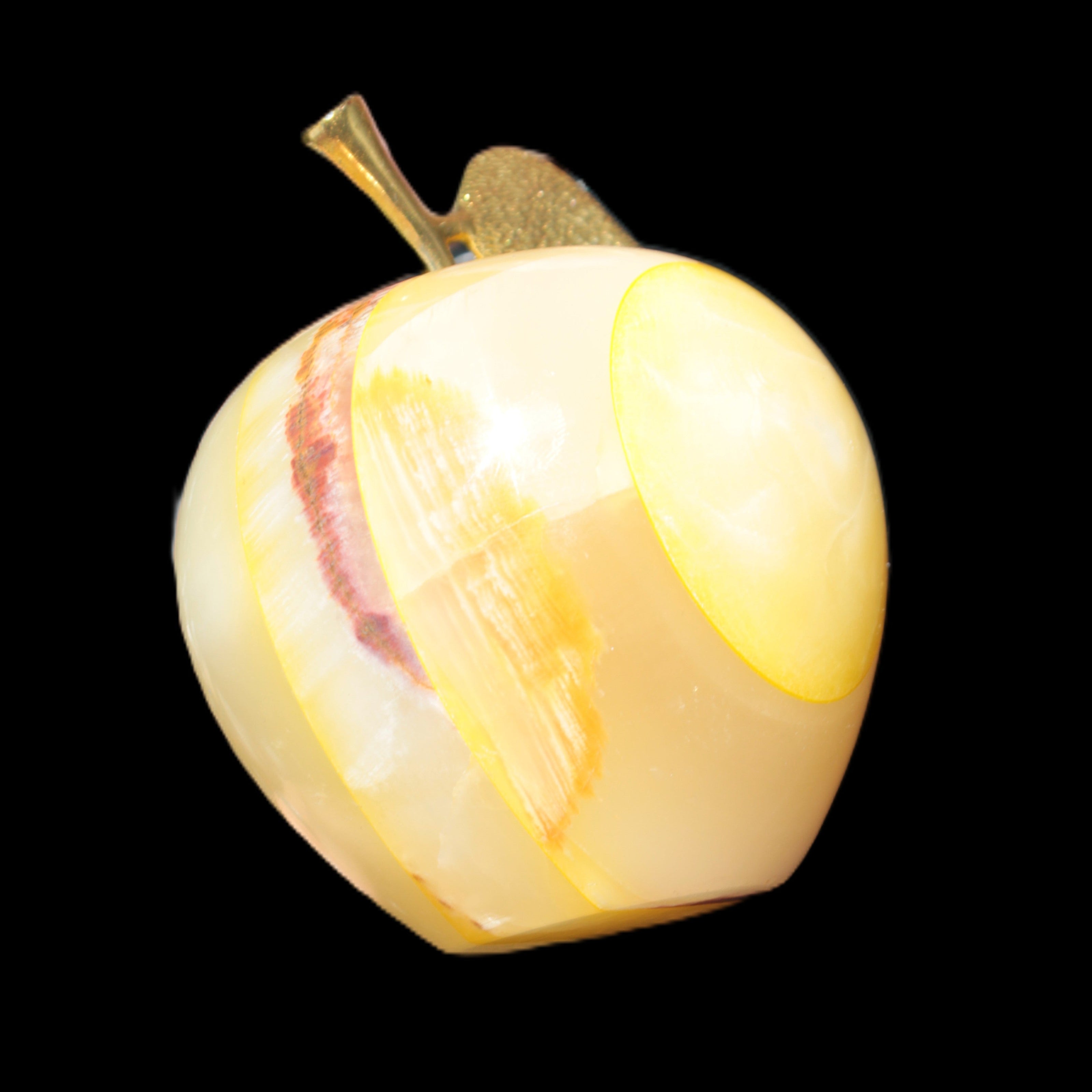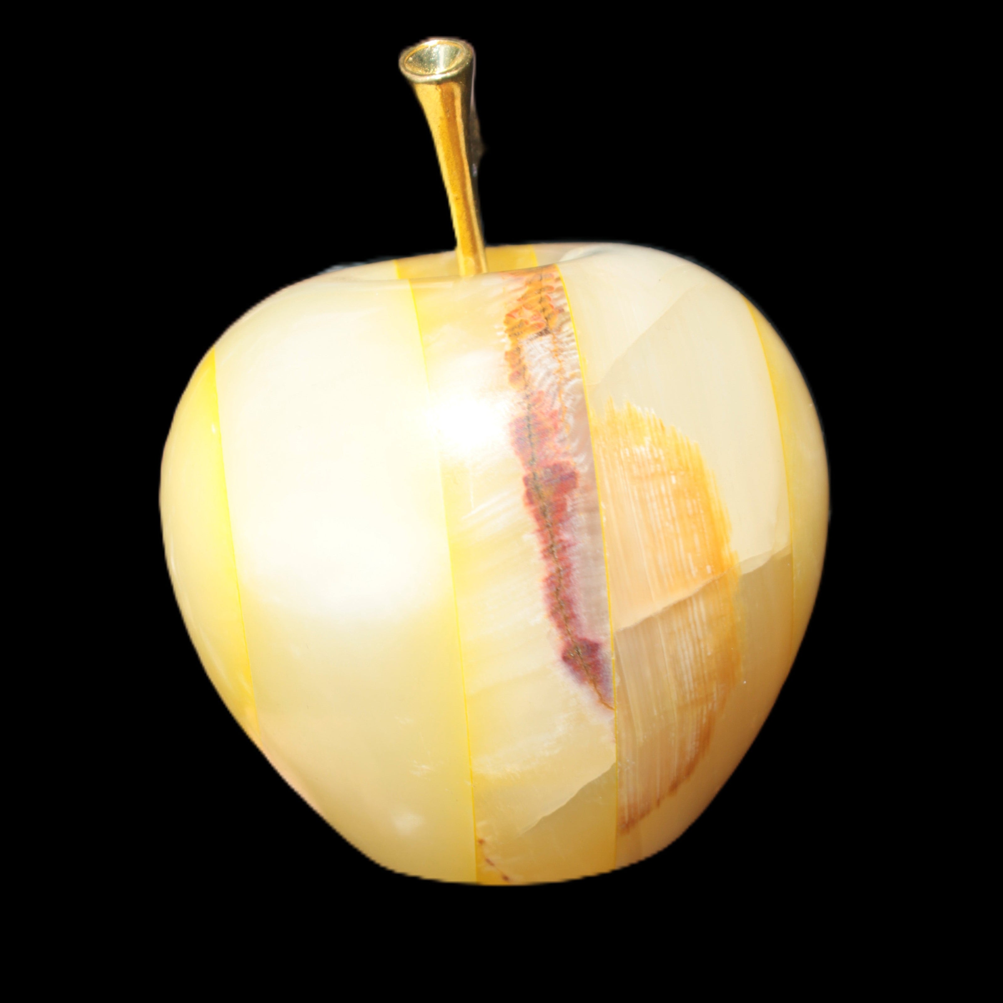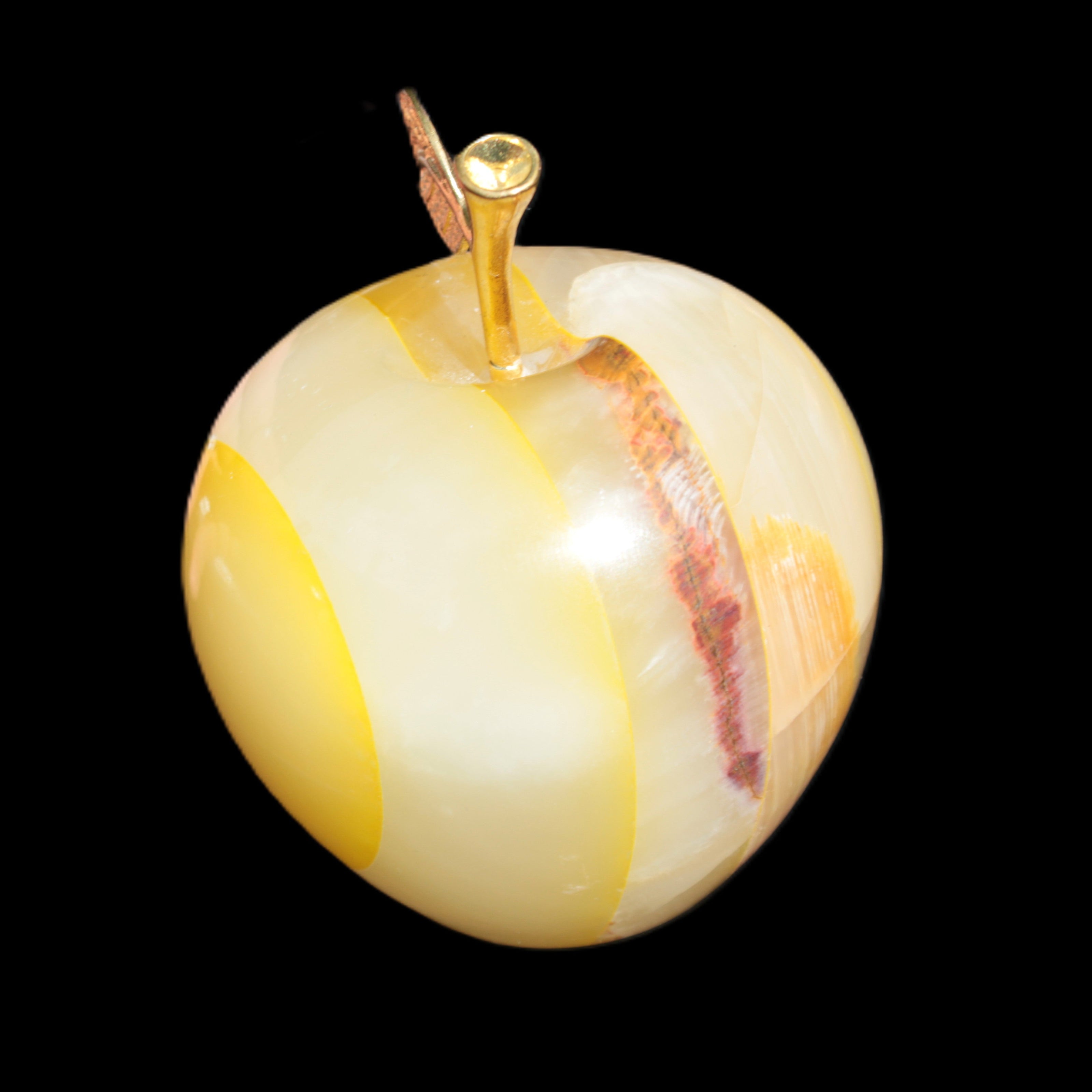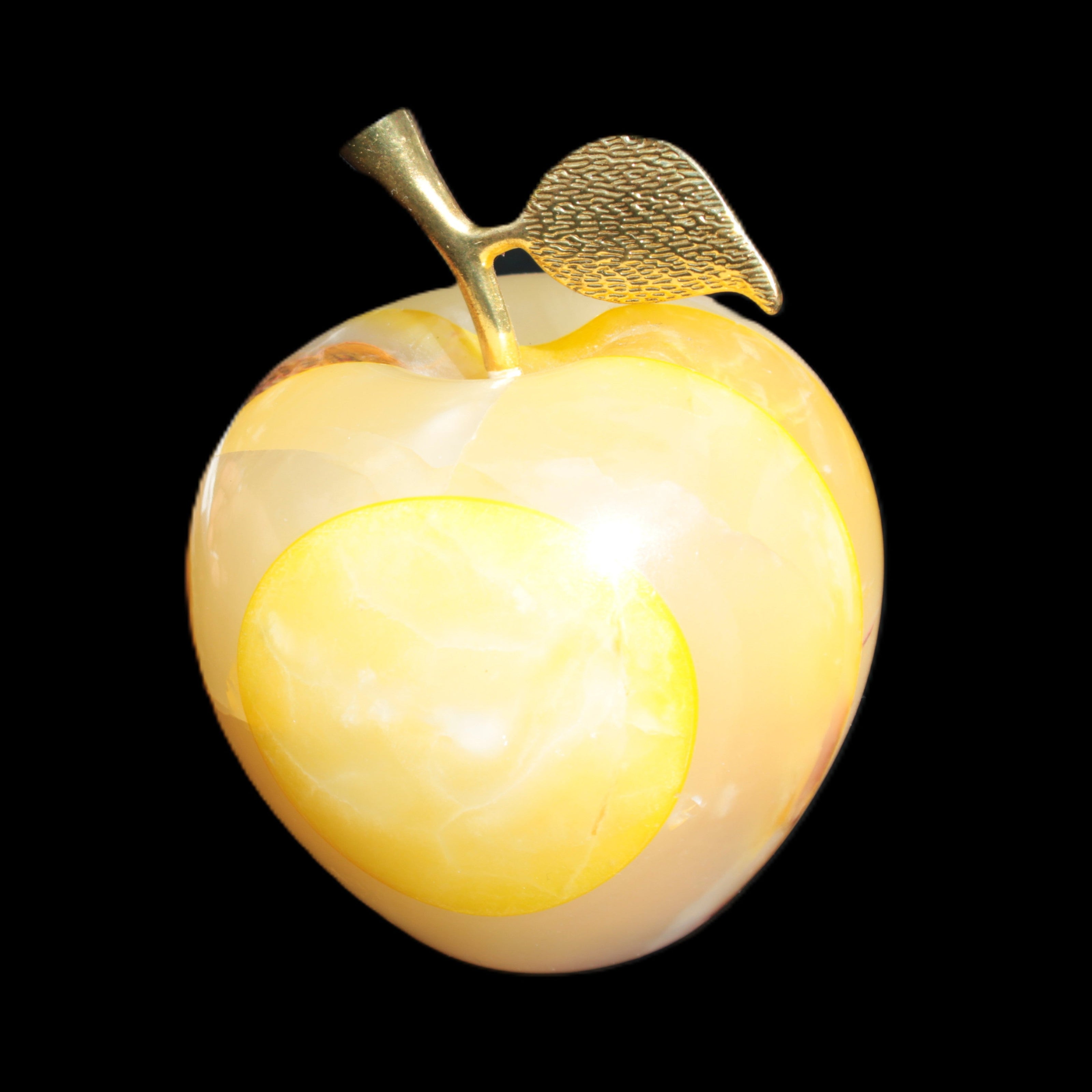 This Yellow Afghan Jade Onyx hand-carved Apple 70*90mm weighs 570g. It has been sculpted from the translucent Serpentine stone found in Pakistan. This stone is often referred to as Onyx, even though it is not agate. Our partner in Karachi used glued and dyed slices of this stone to carefully style this beautiful stone apple.