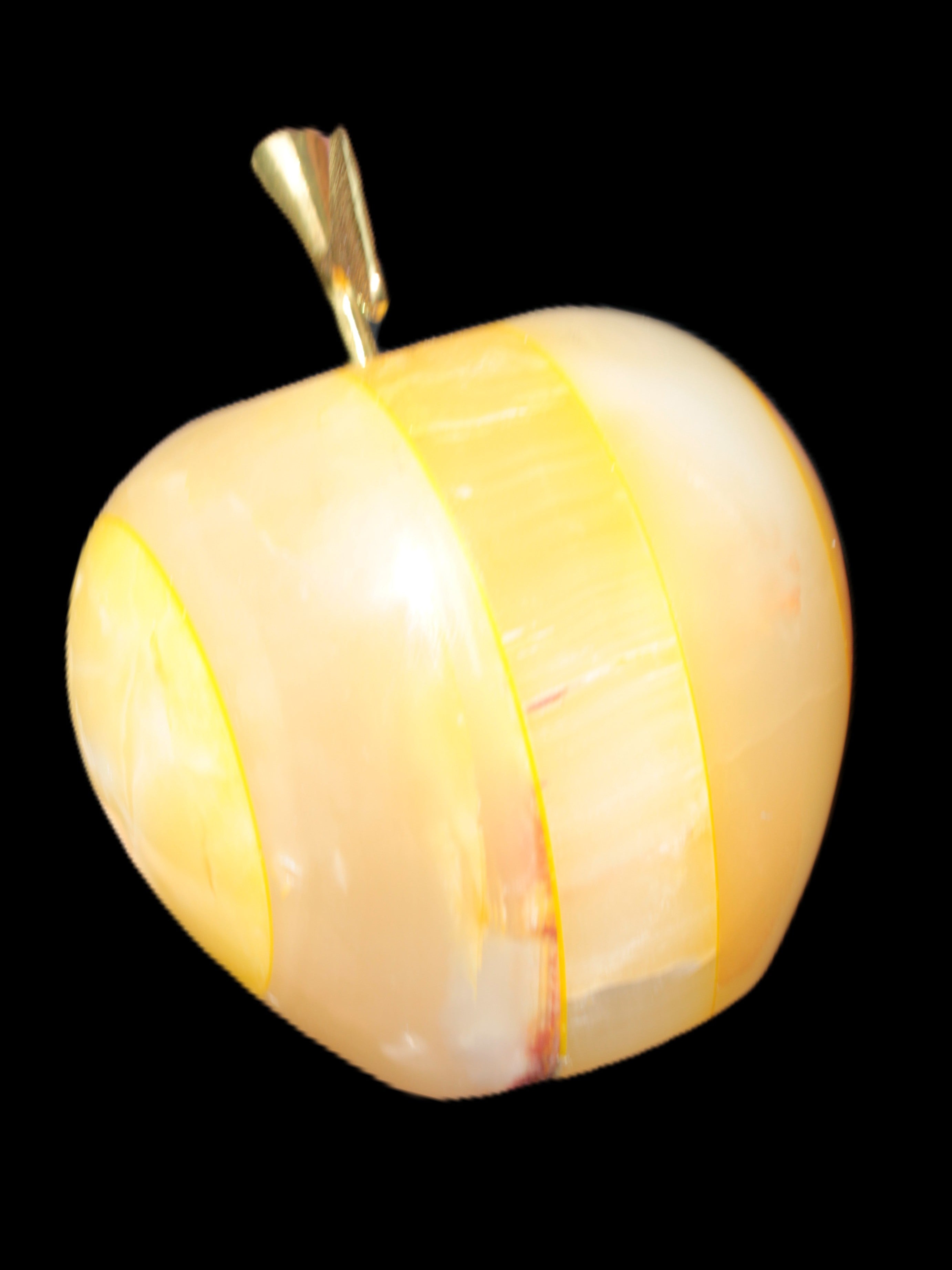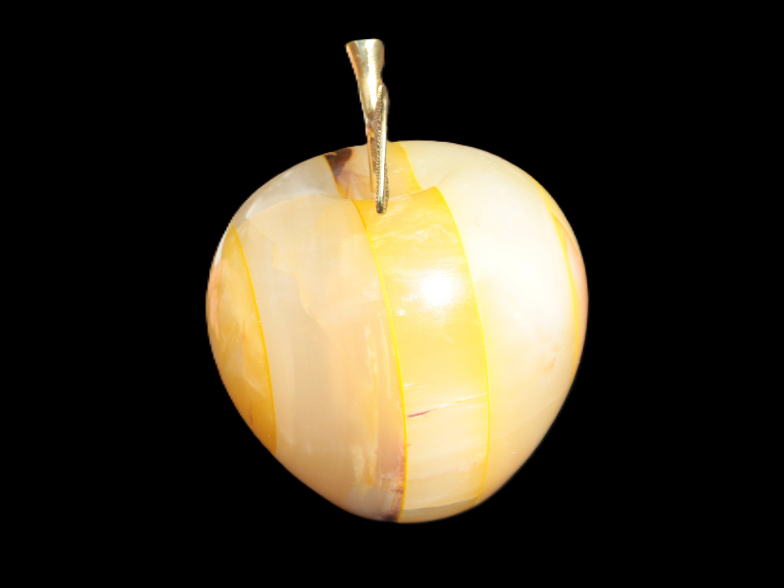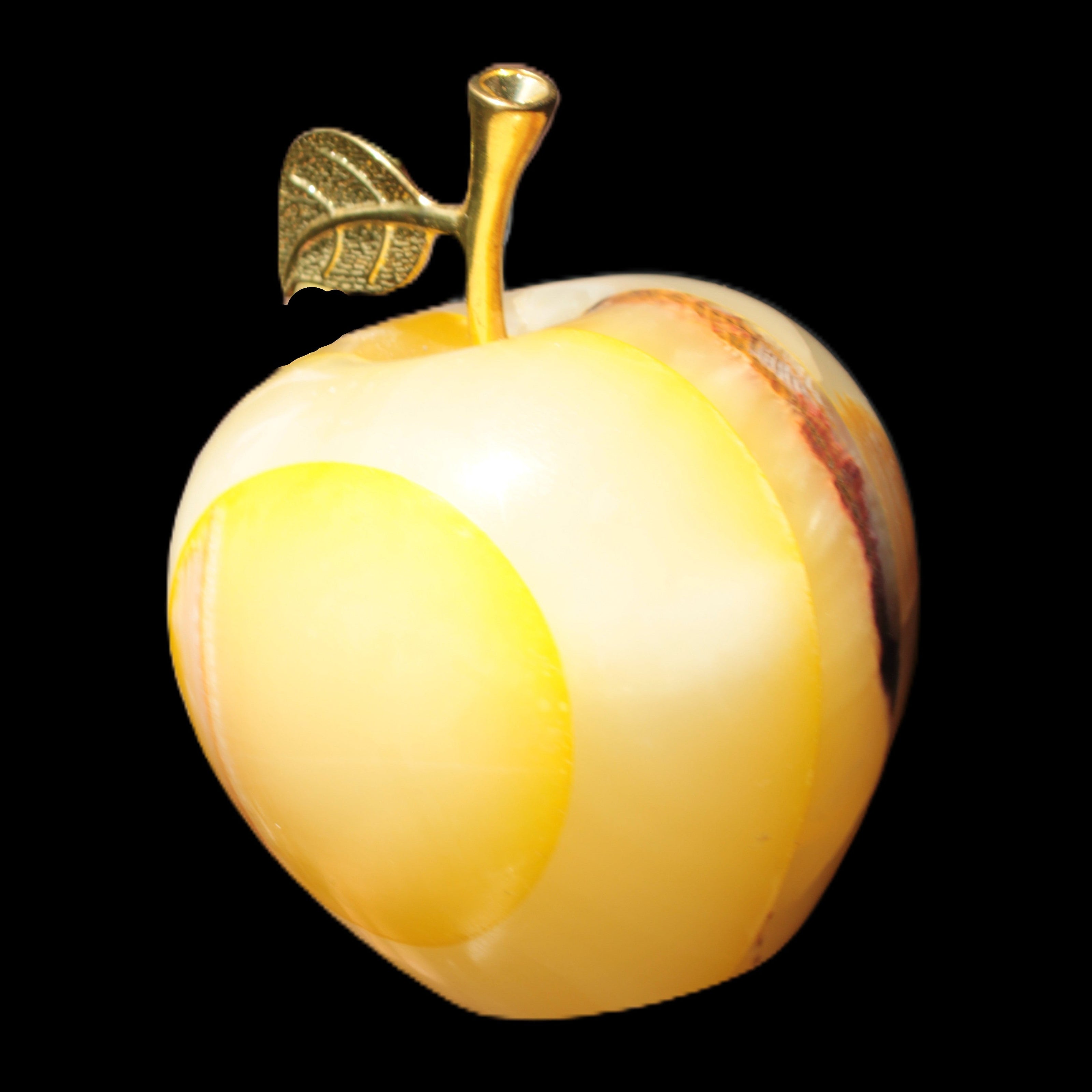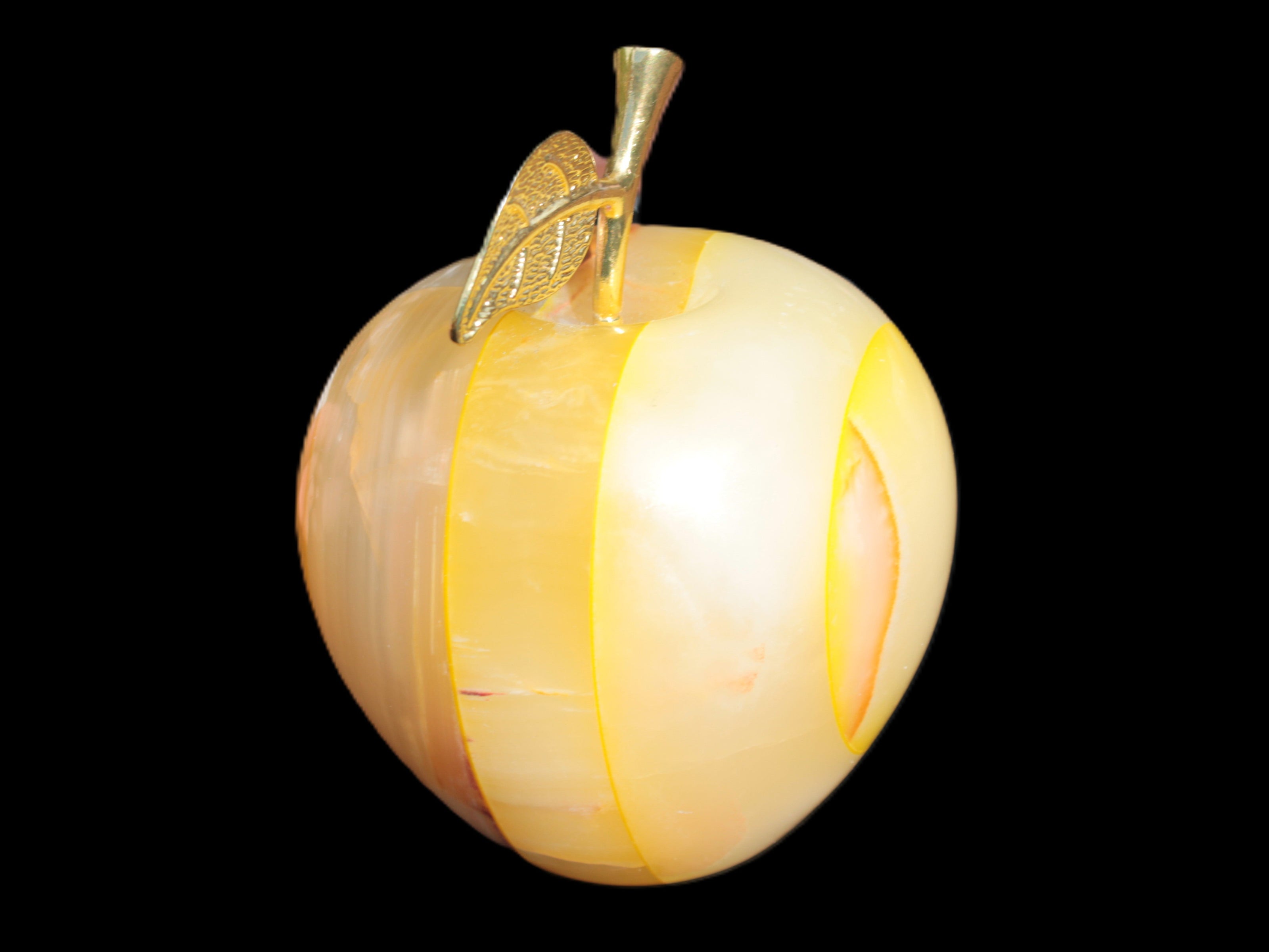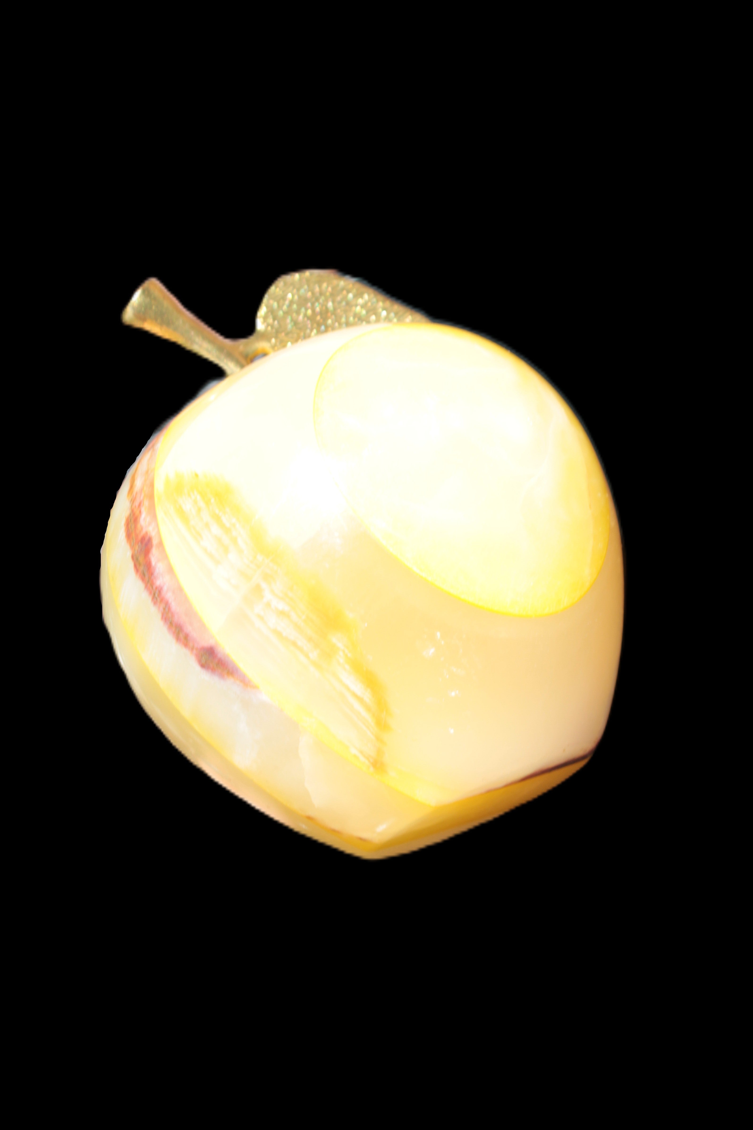This Yellow Afghan Jade Onyx hand-carved Apple 70*90mm weighs 570g. It has been sculpted from the translucent Serpentine stone found in Pakistan. This stone is often referred to as Onyx, even though it is not agate. Our partner in Karachi used glued and dyed slices of this stone to carefully style this beautiful stone apple.