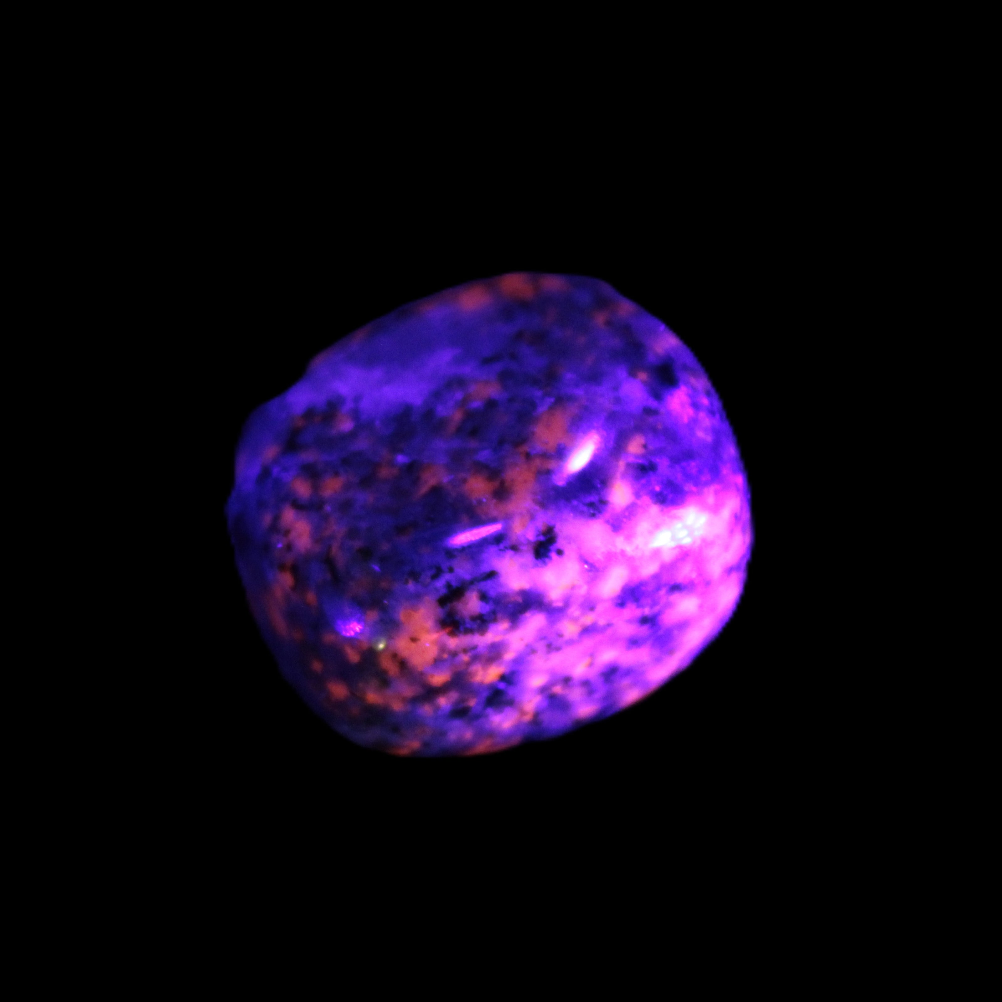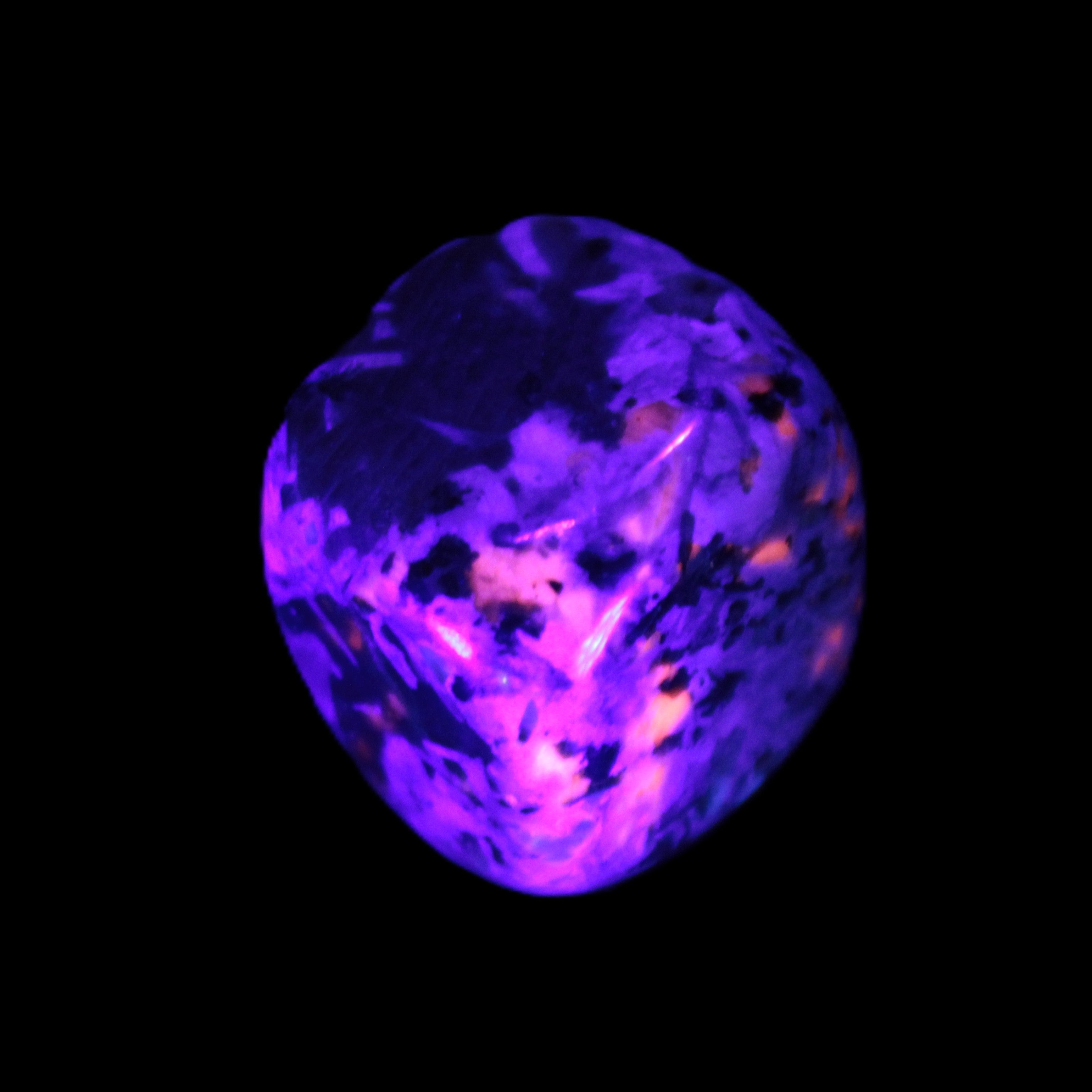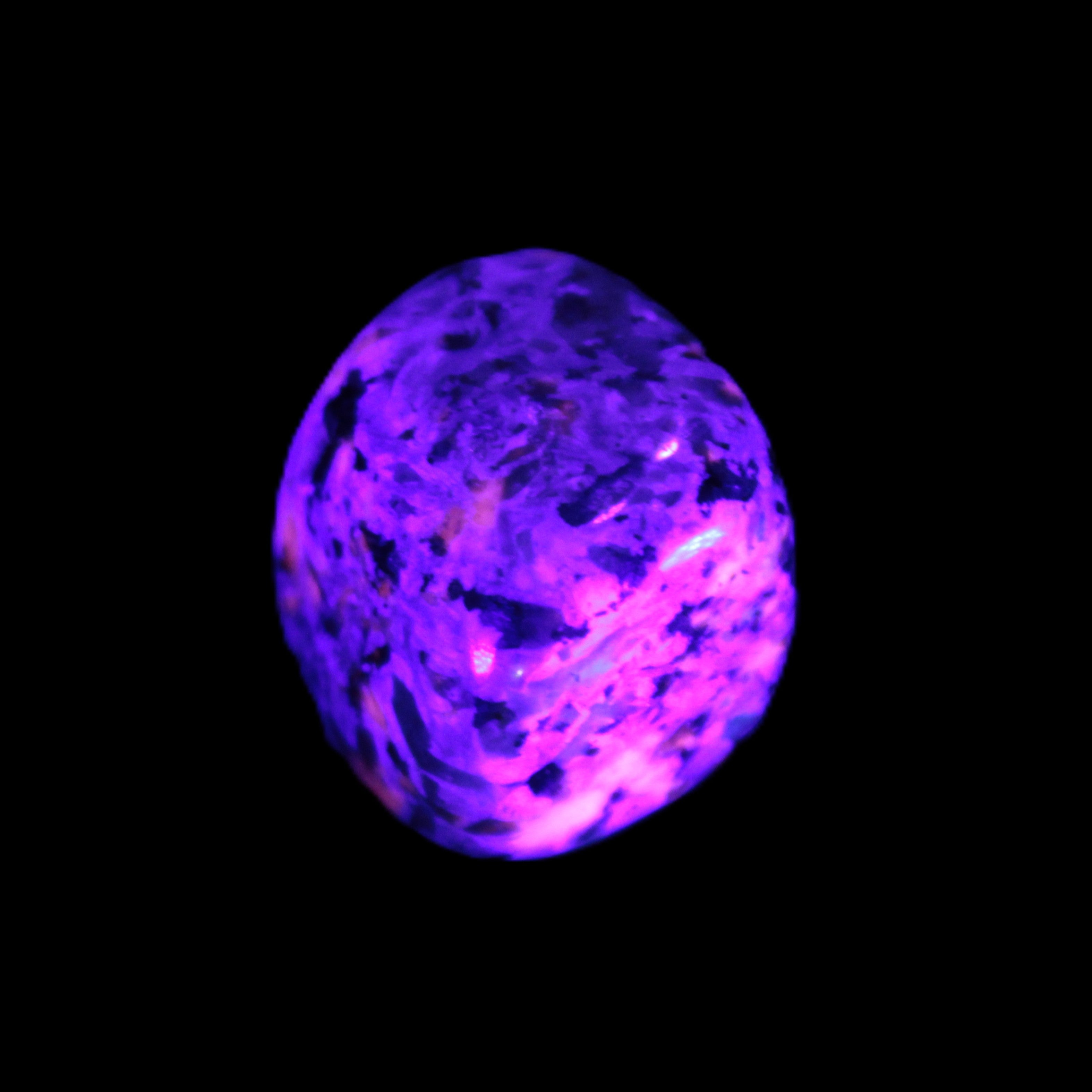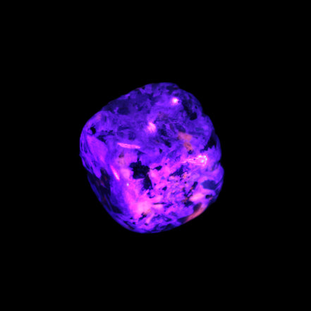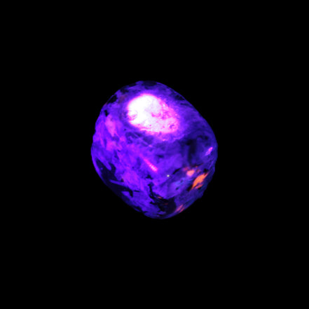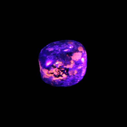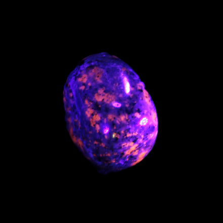 This Yooperlite Sodalite polished stone selection weighs 12-13g. The stone is 18-22mm long. Yooperlite is a trade name for rare Syenite pebbles. The Sodalite present in these stones is highly fluorescent under ultra-violet light, glowing a distinctive electric orange colour.