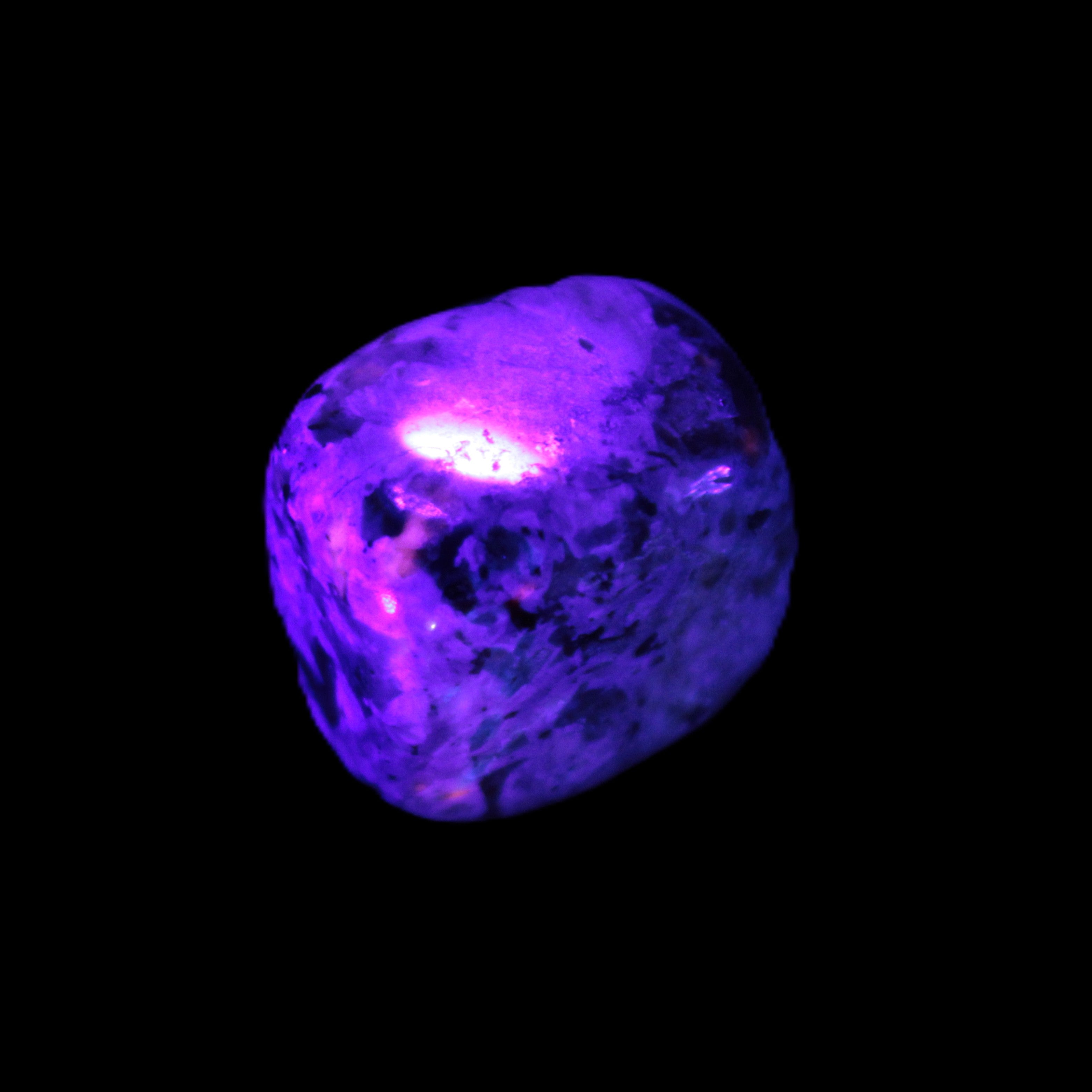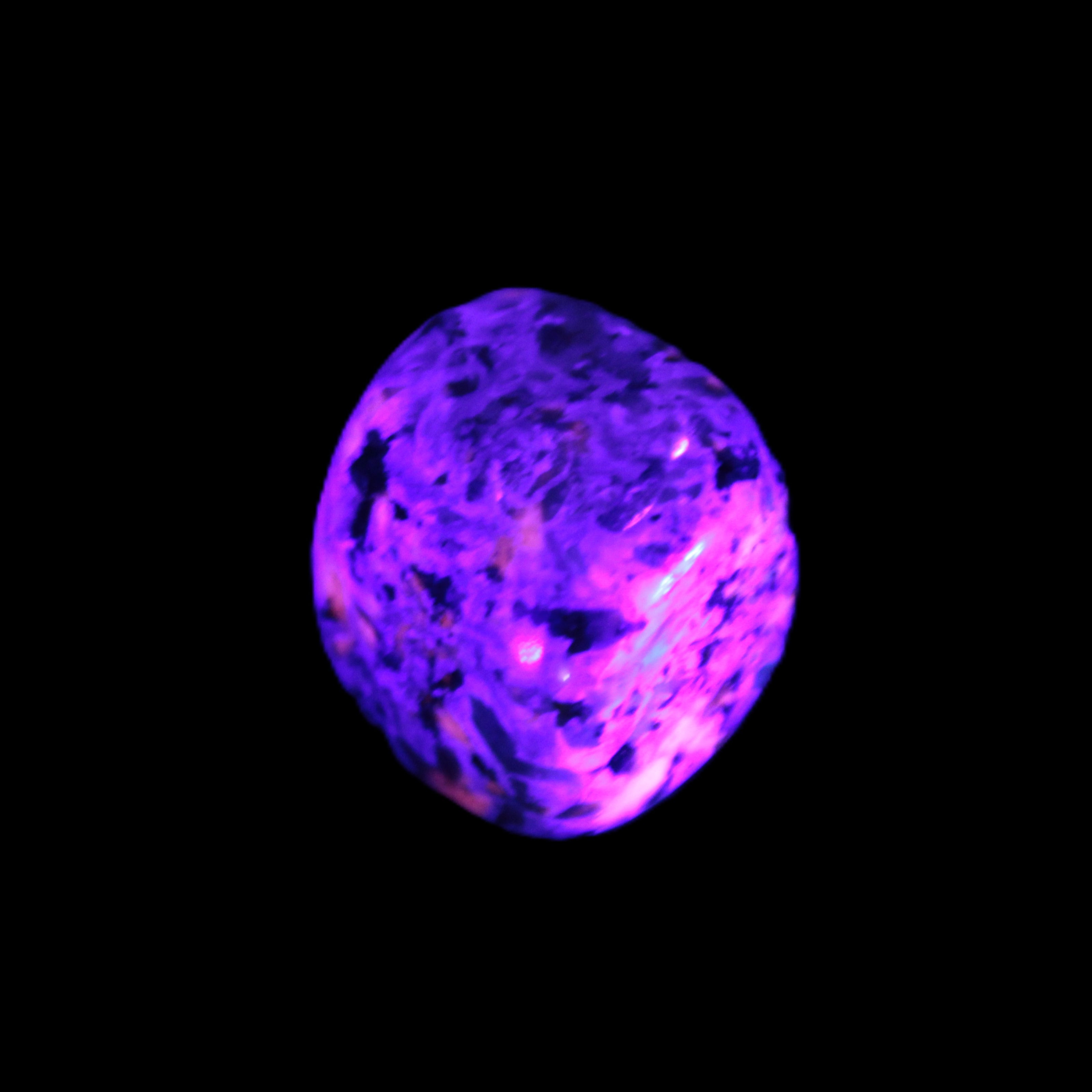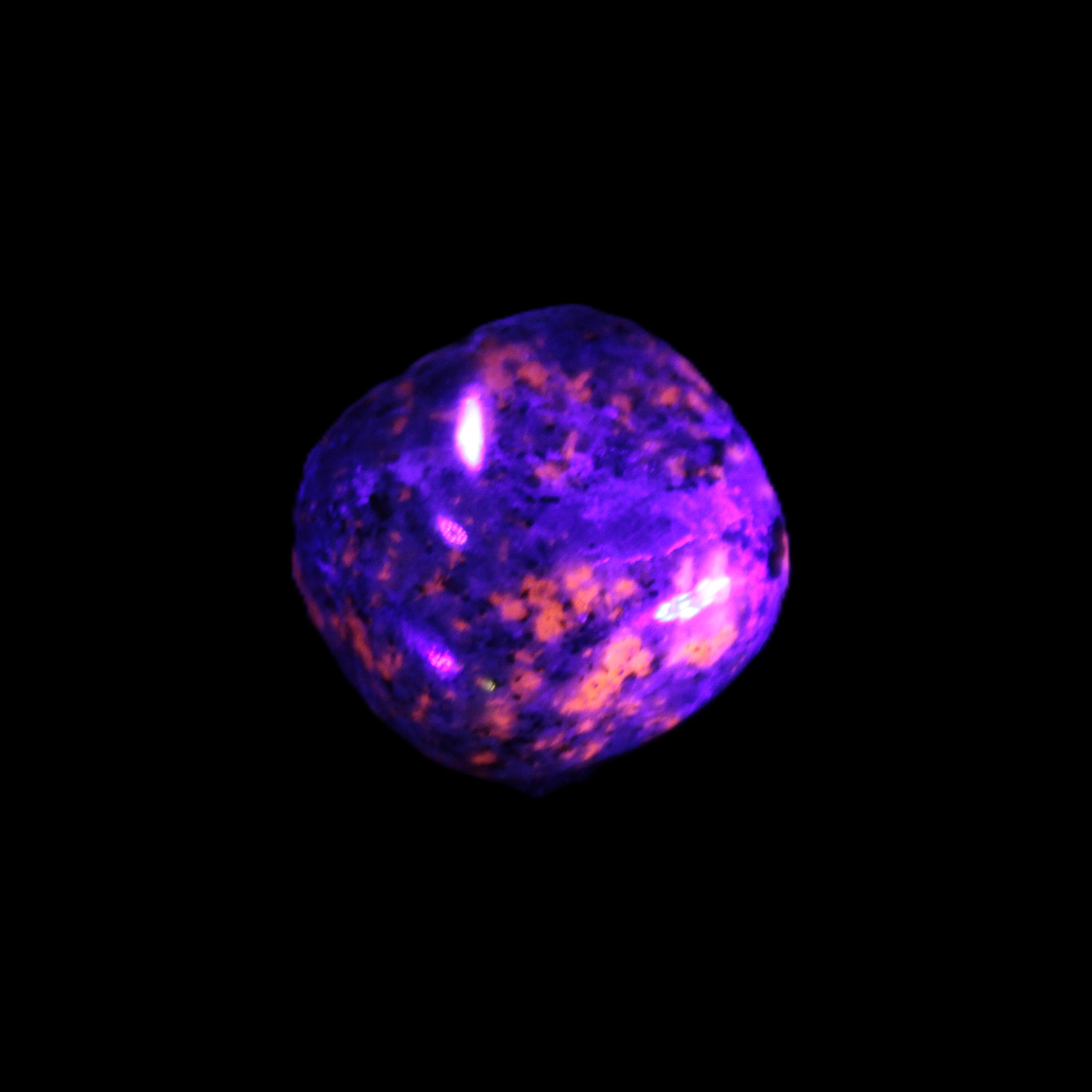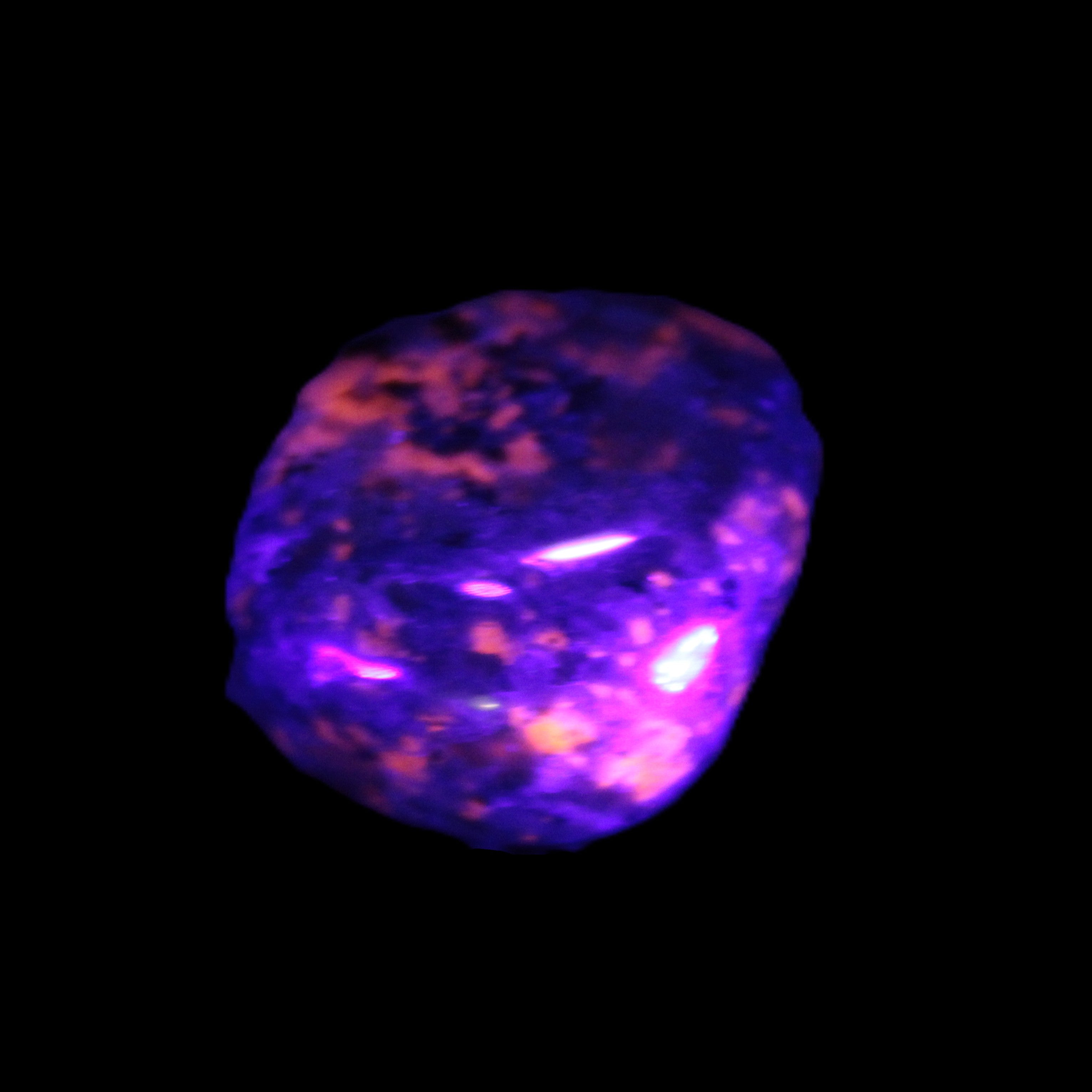 This Yooperlite Sodalite polished stone selection weighs 12-13g. The stone is 18-22mm long. Yooperlite is a trade name for rare Syenite pebbles. The Sodalite present in these stones is highly fluorescent under ultra-violet light, glowing a distinctive electric orange colour.