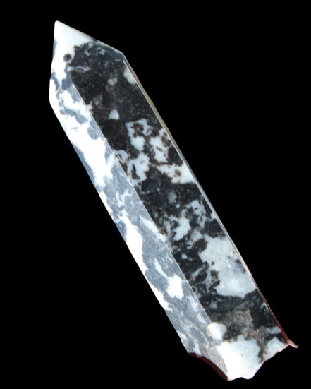 This Zebra Stone wand weighs 70g.  The wand is fashioned from a unique sedimentary stone that formed over 600 million years ago. It is a very fine-grained siltstone formed when detrital clay deposits compacted into layers. The rock is composed of quartz and sericite. Alunite and kaolinite clay are also present. The layering gives the stone its characteristic bandings of red/beige or red/brown. These form on different patterns, including straight lines, waves, and spots. The black lines gave it its name. It is also known as Zebra Jasper, Zebra Marble and Zebra Agate. It was first discovered in Kununurra, in Western Australia.